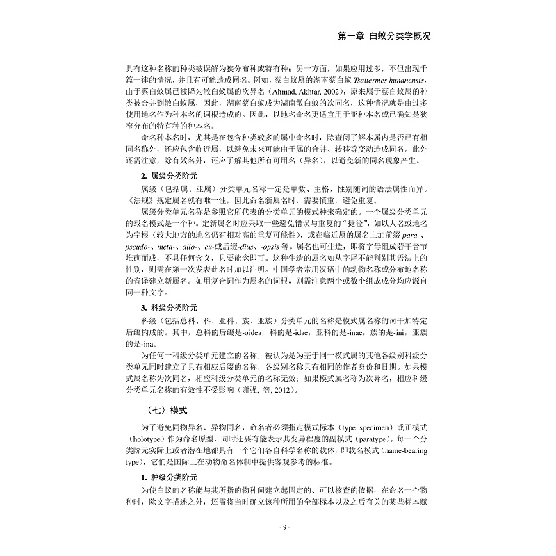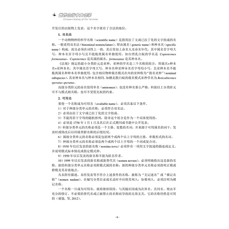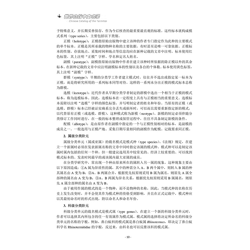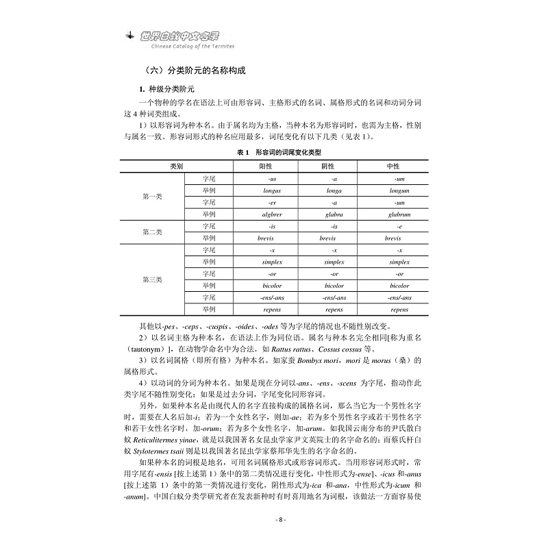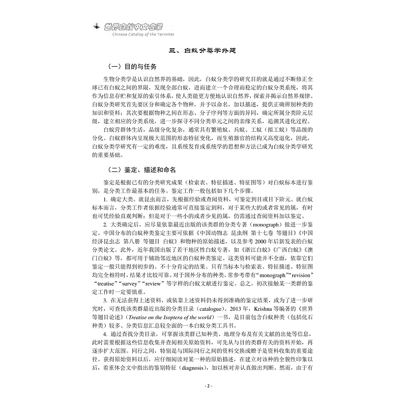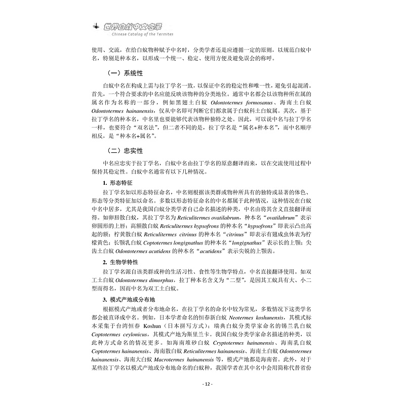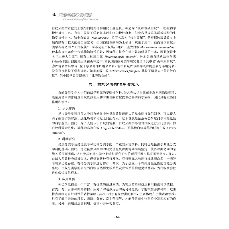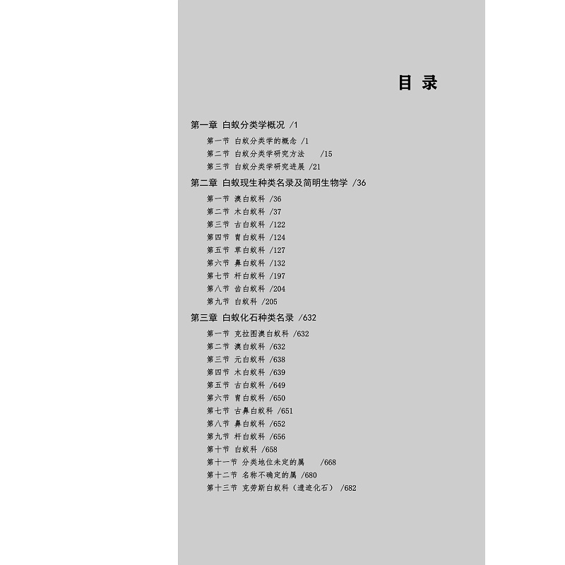 全书拟分为3篇。diyi篇为白蚁分类学研究进展,主要论述了白蚁分类学的基本概念、方法、研究和应用现状及发展趋势;第二篇为白蚁现生种类名录及简明生物学,整理全世界范围内已经发现并公布的2900多种白蚁现生种名录,并加注中文名称和主要白蚁的简明生物学;第三篇为白蚁化石种类名录,整理全世界范围内已经发现并公布的230种白蚁化石种名录,并加注中文名称。该书的出版将填补国内国际在白蚁名录大全方面的空白,尤其是首次将中国的白蚁种类编录至世界白蚁名录。