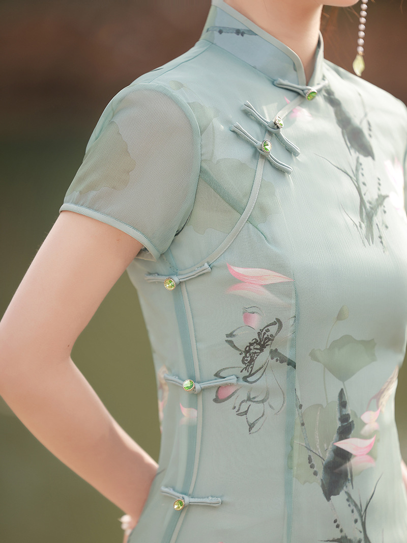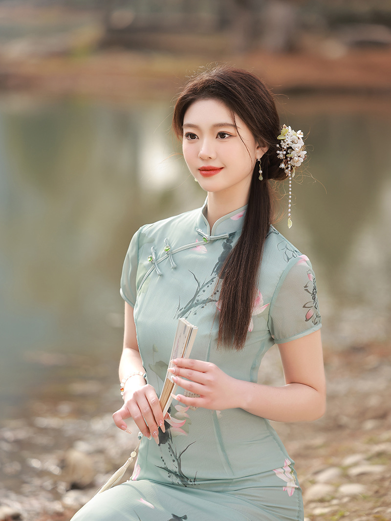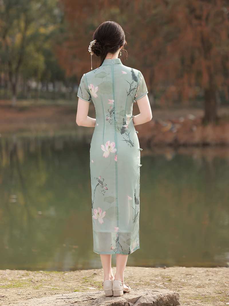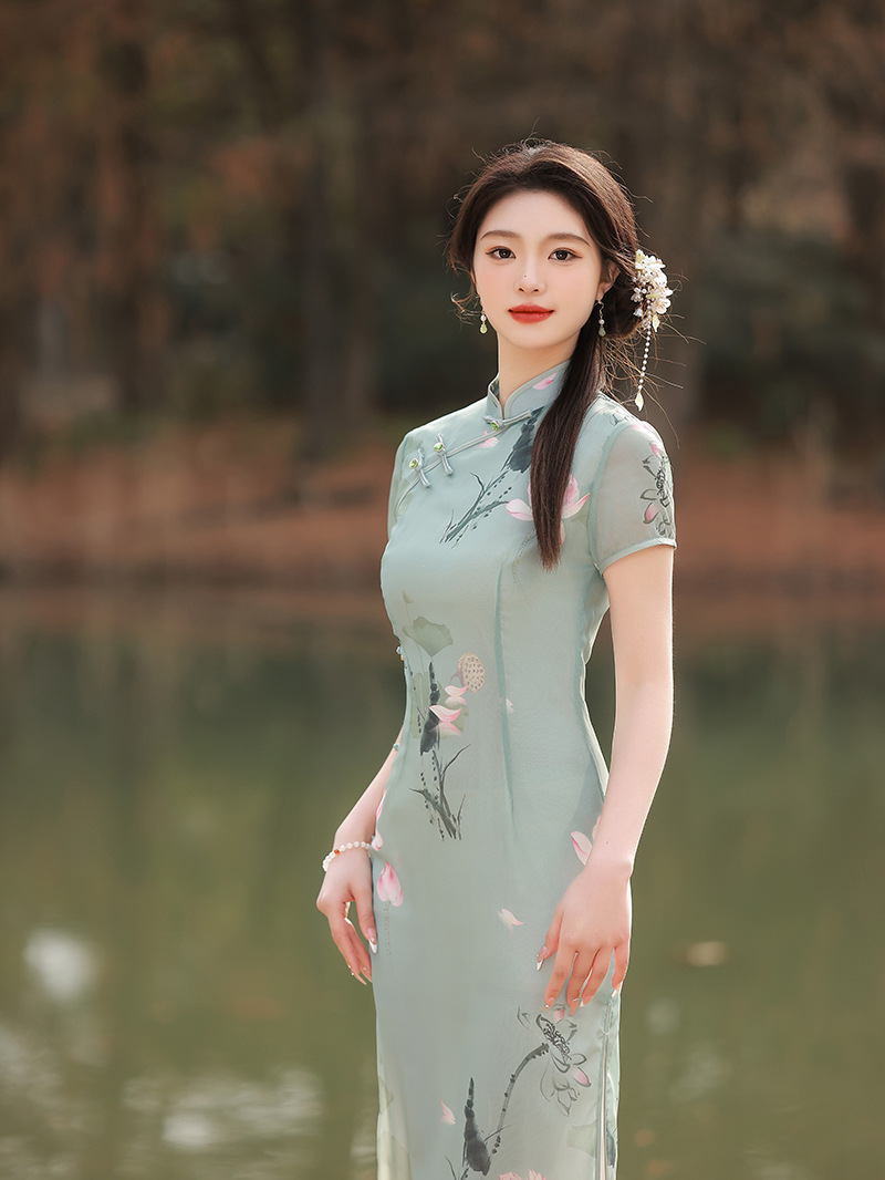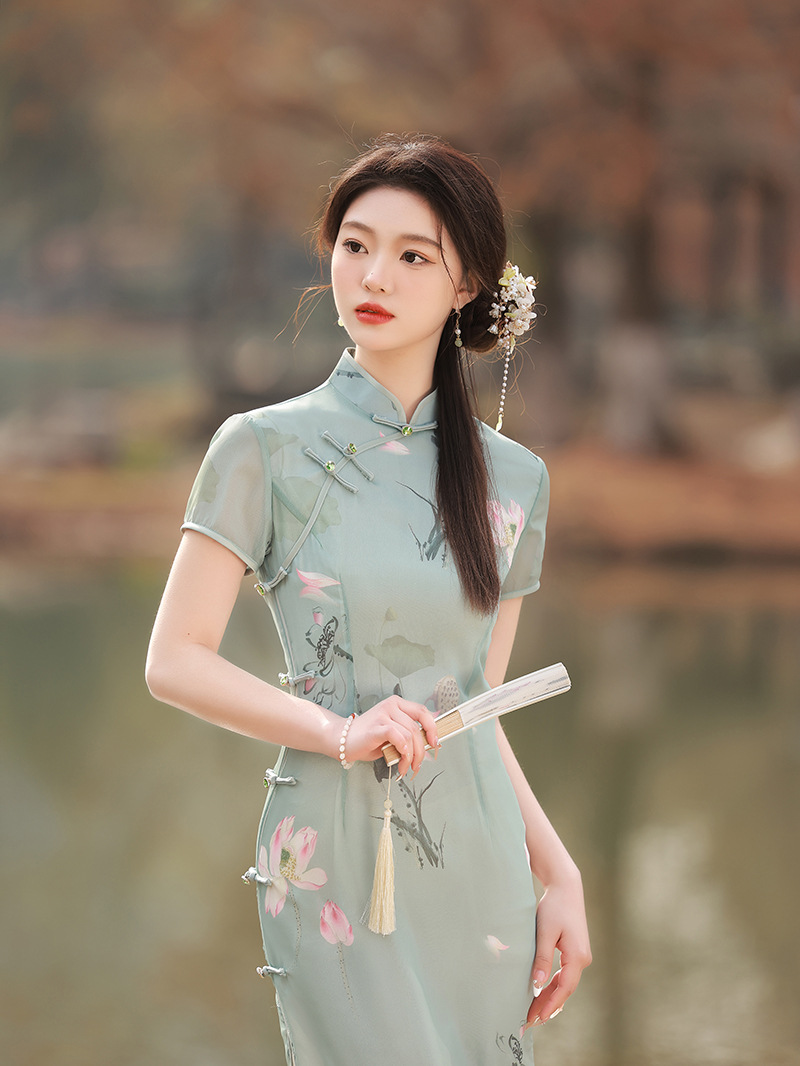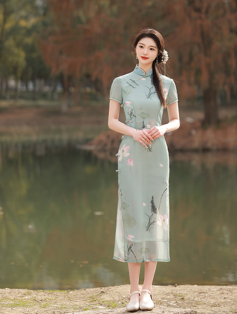 ZAYS-5169春装长款双层印花短袖年轻少女旗袍日常修身时尚改良旗袍