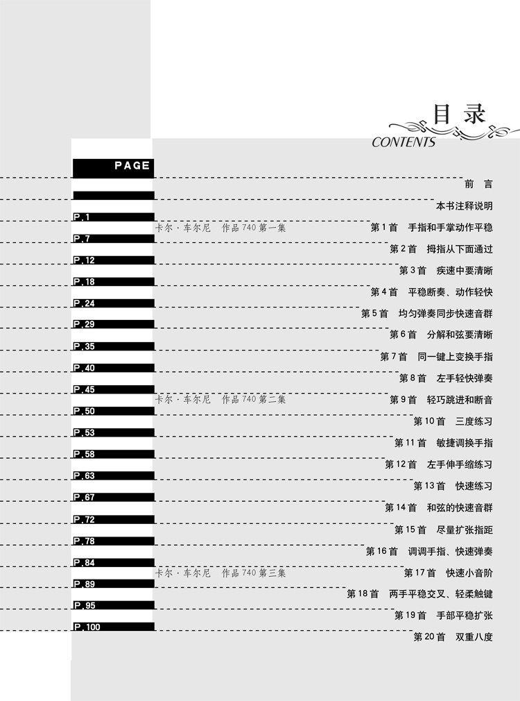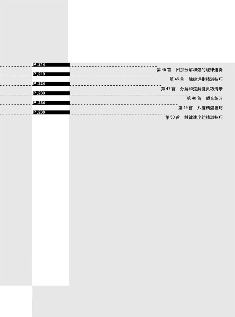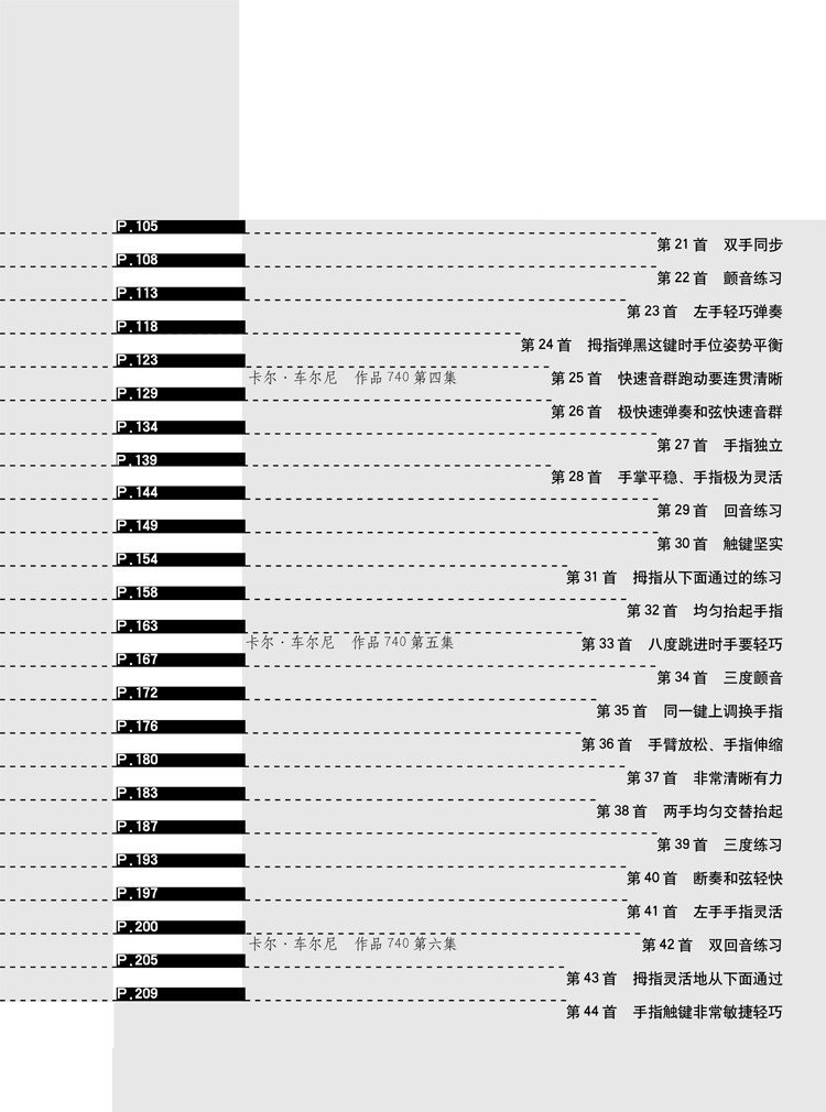 该教材是《车尔尼钢琴练习曲50首(作品740、699)》。学习和掌握本教材,可使学习者本身的弹奏技术进入到“高级位置”。本教材和其他几册相比,具有“难、长、搏、精”等特色,以训练手指灵巧为主,也训练了收完及手臂的奏法,要求较高。书中为每首曲子写了详细的弹奏提示,还对乐曲结构进行了简明扼要的文字分析,并附有训练要点,还有简单的“结构图示”,一目了然。