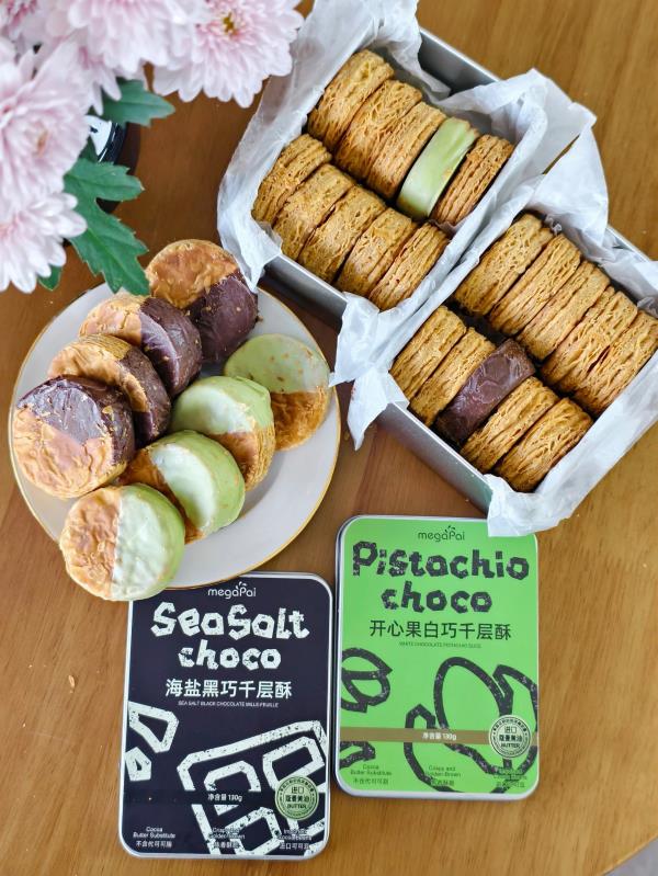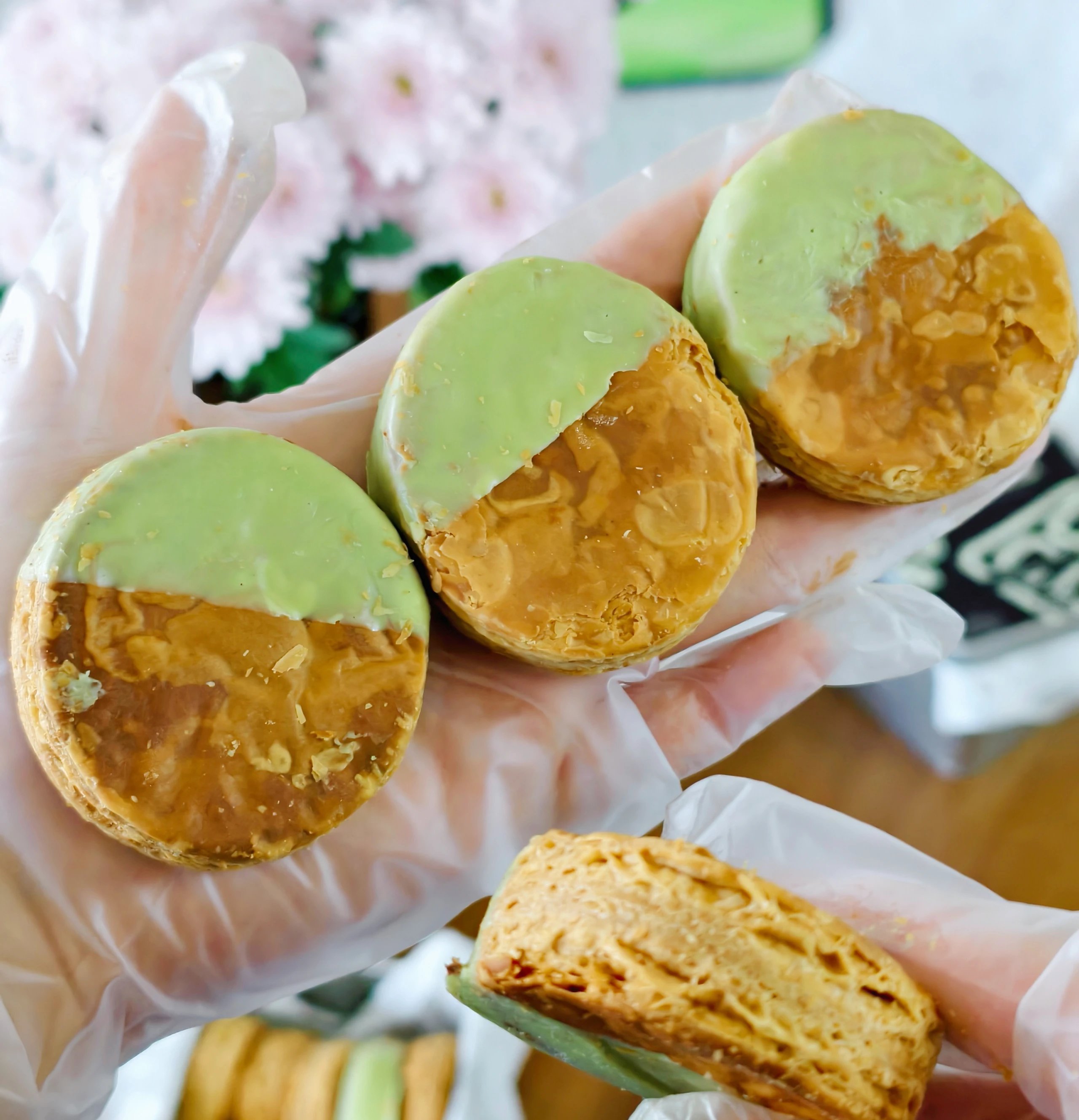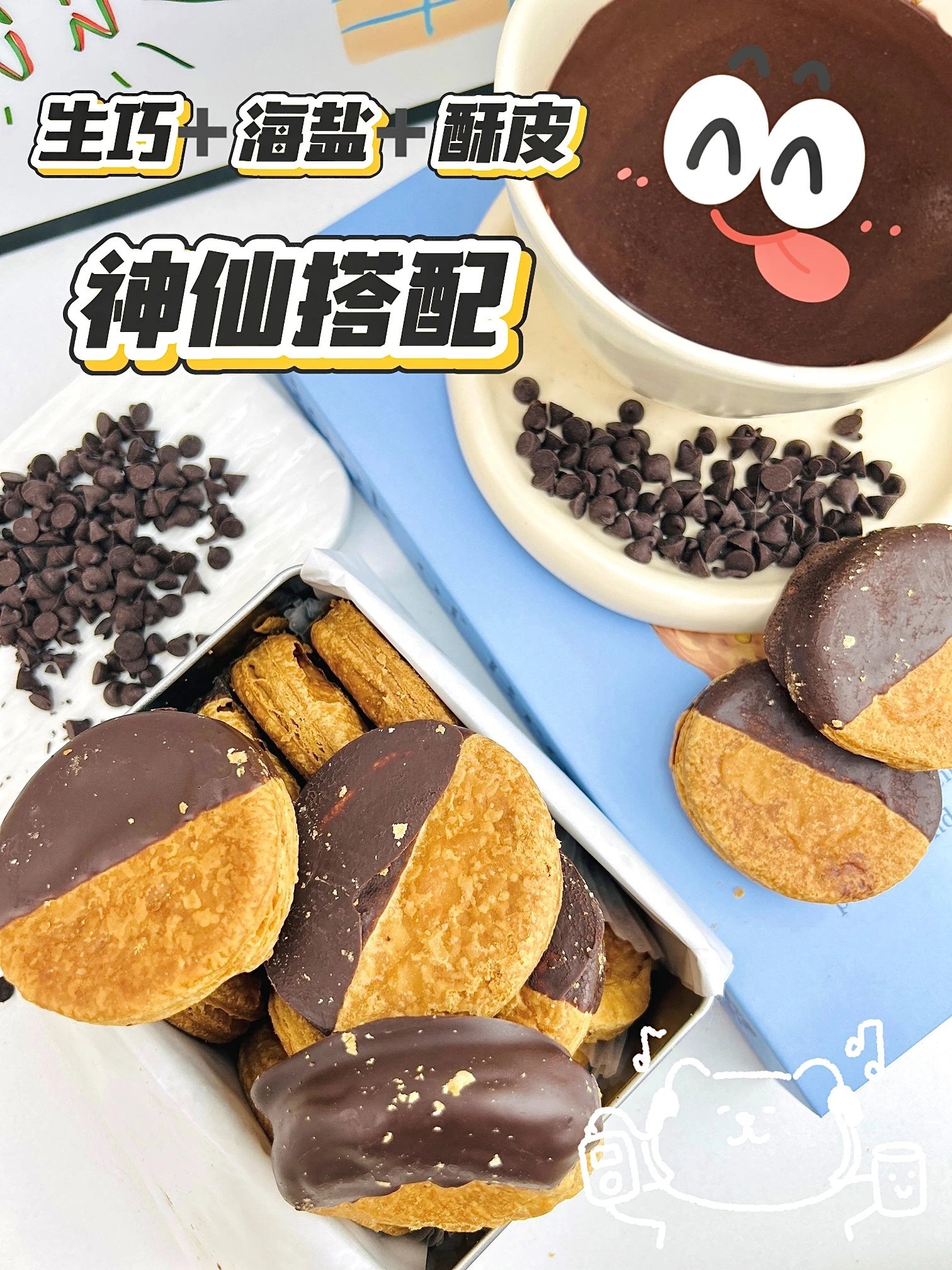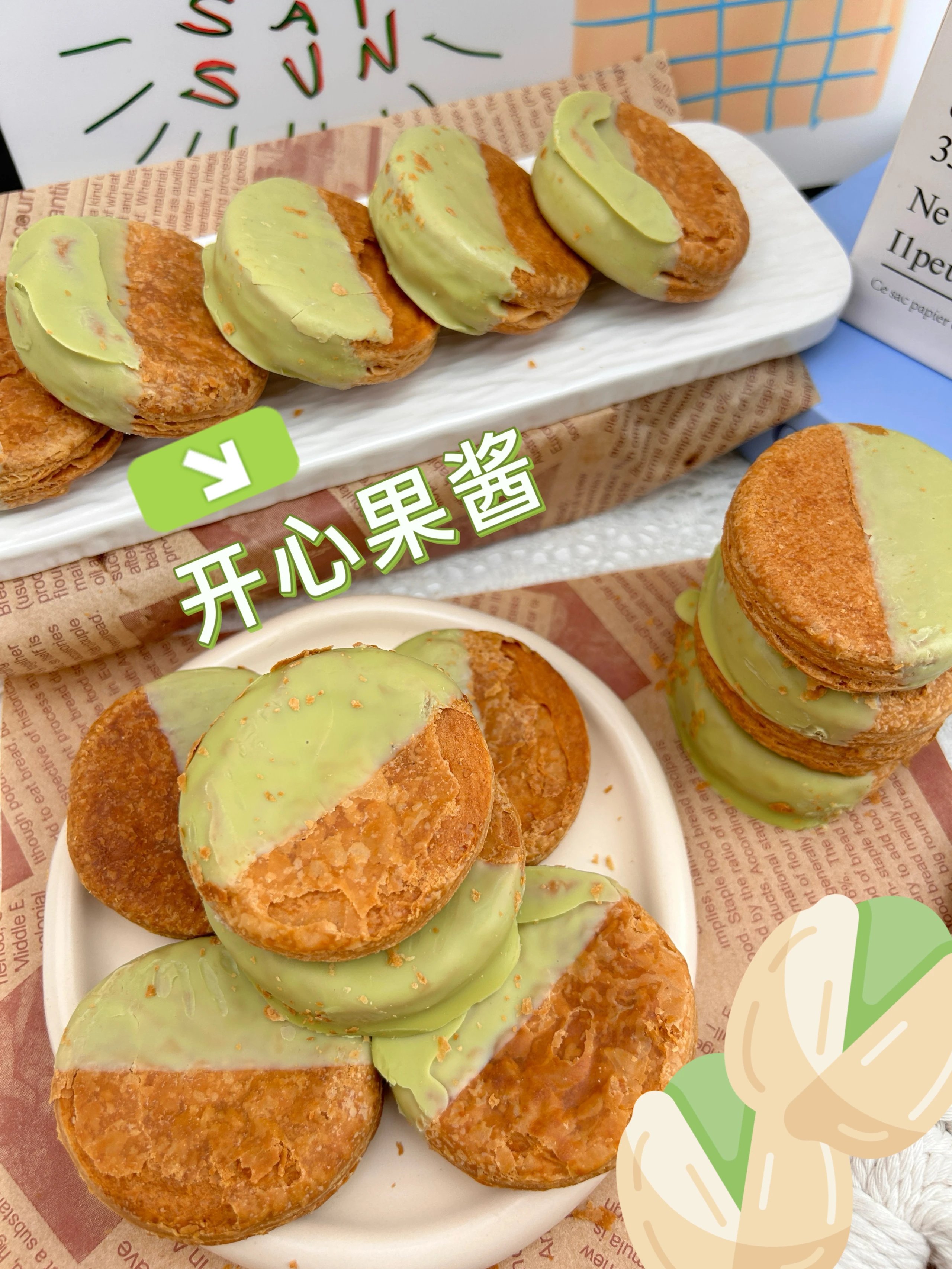一半原味酥皮 一半裹满果酱,入口丝滑 黑巧款用的是52%纯脂黑巧 吃着有淡淡的可可香 完全没有廉价巧克力的甜腻感 白巧款也是丝滑不齁,搭配开心果浆巨香 就连盐都用的是莫顿海盐 撒在巧克力上刚好中和甜味 咸甜平衡得特别妙