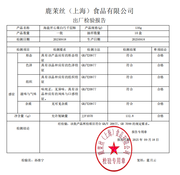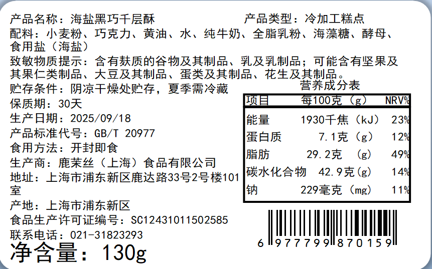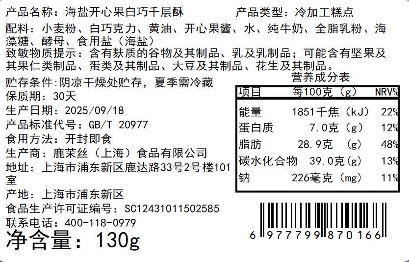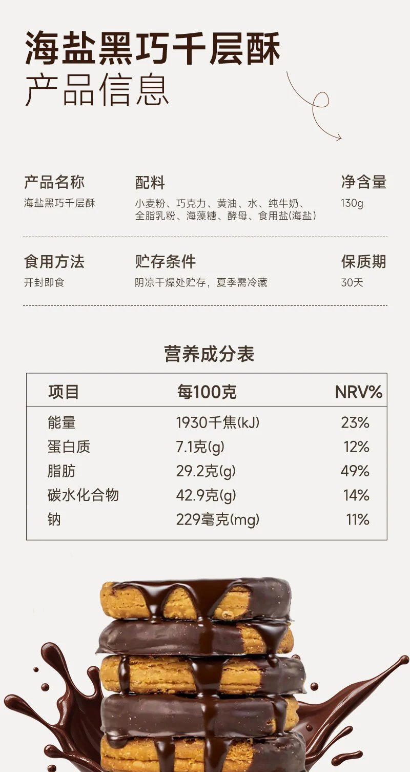 【产品名称】喜山好物海盐黑巧千层酥/海盐开心果白巧千层酥 【品牌】喜山好物 【产品类型】冷加工糕点 【食用方法】开封即食,开封后请尽快食用 【保存方法】冷藏储存 【产地】上海 【包装】盒装 【生产日期】近期 【保质期】30天 【快递名称】中通/申通/圆通 【不发货地区】:港澳台 【偏远运费】青海、内蒙、海南、甘肃、宁夏+7元;新疆、西藏+15元 【发货时间】24-72小时 【售后说明】 1.短保不支持7天无理由退货,不支持无理由拦截与拒收撤单改地址 2.如出现异常情况,请带面单+产品拍照+产品包装照片与我们联系,我们会第一时间处理,如产品有质量问题可在收货24小时之内,联系客服进行售后或者补发