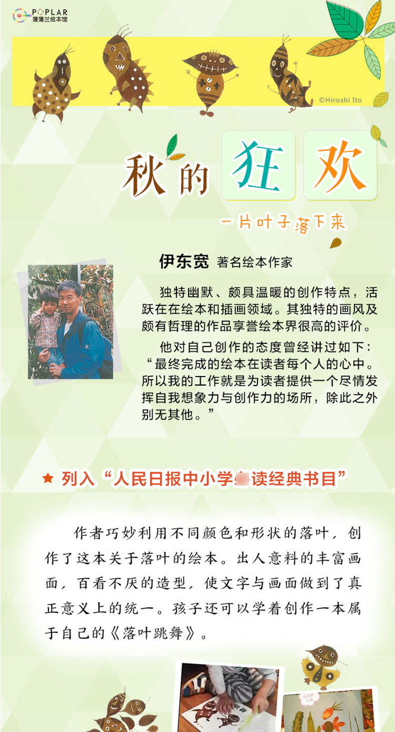 《落叶跳舞》讲述了在静静的森林里,落叶一起跳着快乐的舞蹈。跟着风轻飘飘地浮起来,悄悄地坠落……一首用落叶演奏的散文诗。巧妙地利用不同颜色和形状的落叶,绘成出人意料的丰富画面!