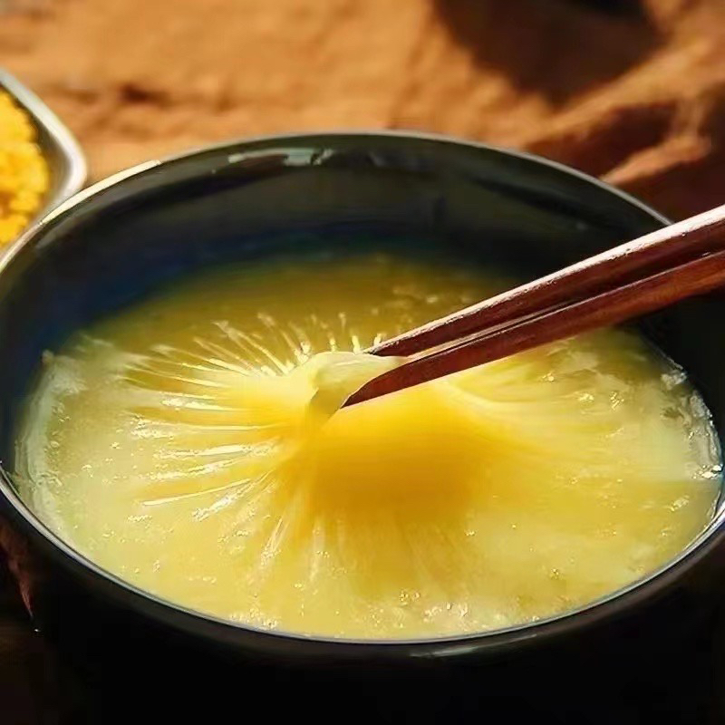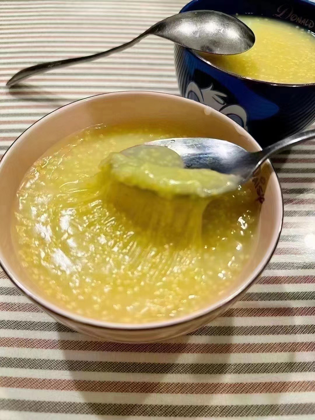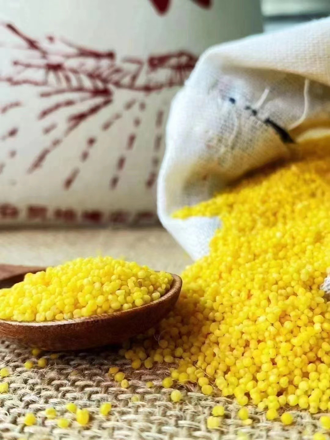 黄小米,色泽金黄,米粒圆润饱满,润燥、养胃。小米粥熬出来的米油很厚
