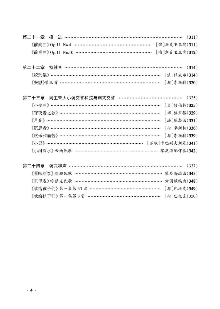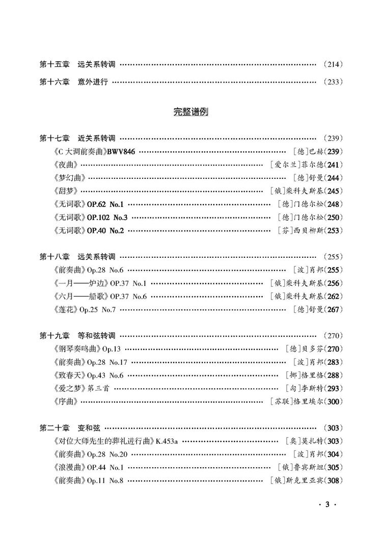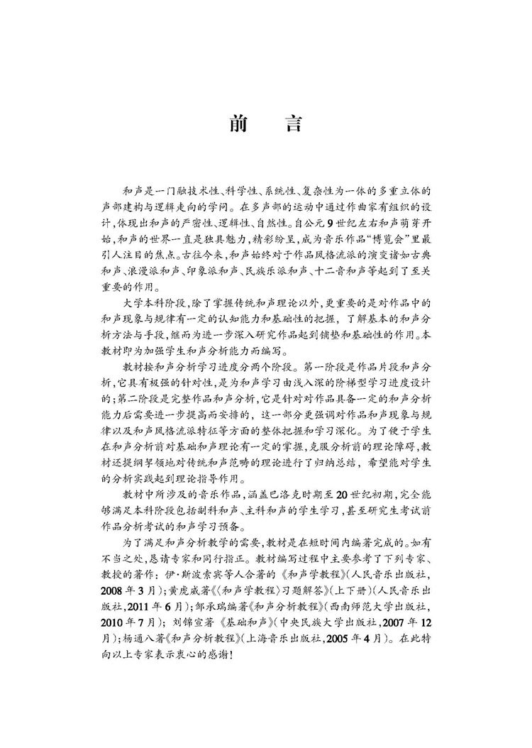 该教程共三个部分,即基础理论与方法、分析谱例片段、分析完整谱例。第一部分两章内容,简要介绍了和声基础理论概要、和声分析方法以及相关问题,对传统和声的理论进行了简要归纳总结,以便对学生后面的分析实践起到理论指导作用;第二部分共十四章,包括音乐织体、近关系转调、意外进行等,这些作品片段,具有极强的针对性,而且是作者为和声学习由浅入深精心设计的阶梯型进度;第三部分共八章,包括近关系转调、远关系转调、等和弦转调、调式和声等,学生在分析了前面的作品片段后已掌握了一定的分析能力,现在进一步分析完整作品谱例应该能从容应对,本部分就是针对学生对作品具备一定的和声分析能力后需要进一步提高而设计的,旨在强调学生对作品和声现象与规律以及和声风格流派等方面的整体把握和深化学习。教材结构清晰、内容详实,理论理论与实践结合,通过系统学习与练习,逐步掌握和声分析的方式方法与技能技巧,在分析实践中不断深化对调性音乐和声语言与写作技法的理解,提高自己的和声分析、和声思维、和声应用与和声鉴别能力。