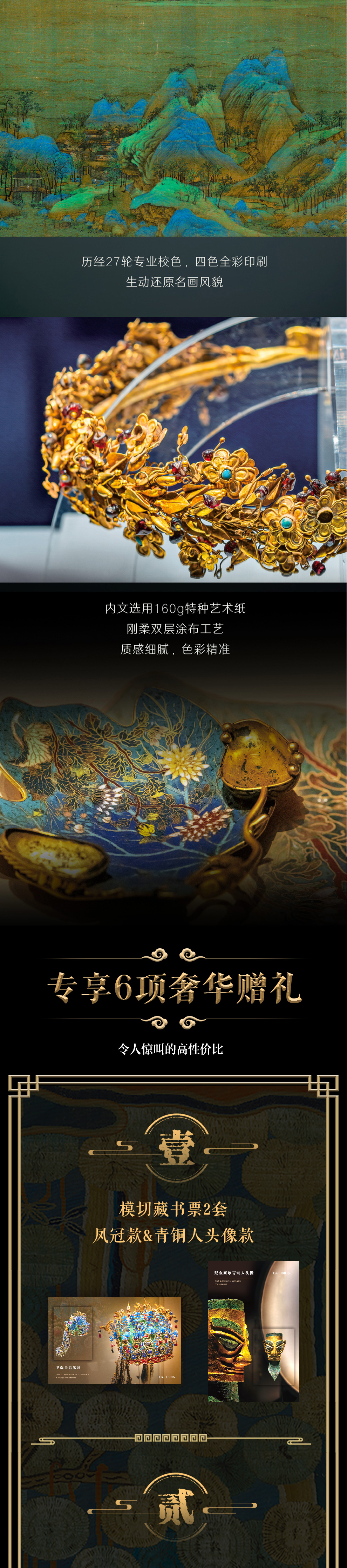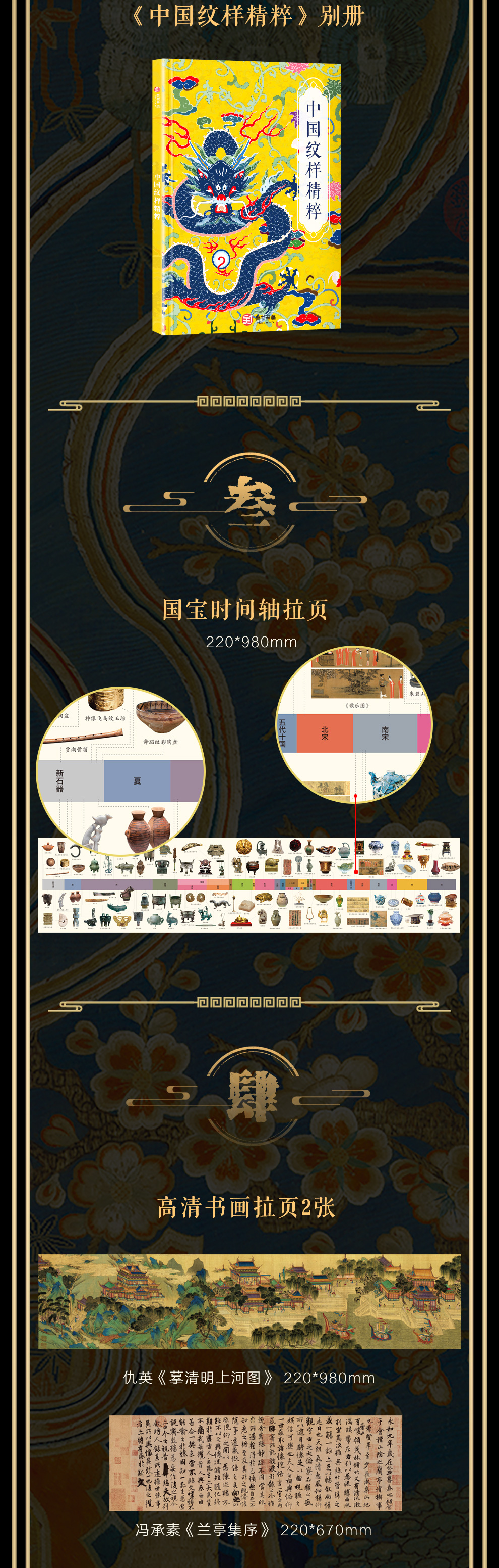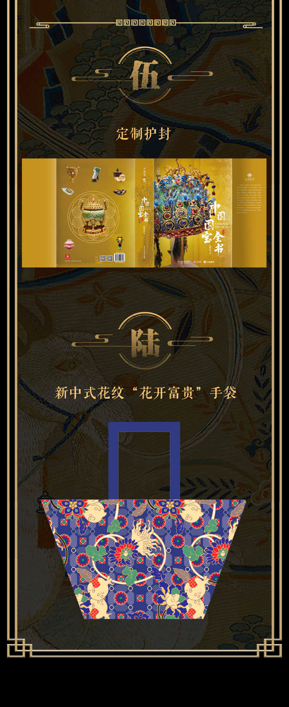 赠品包含:新中式花纹“花开富贵”帆布袋1个、藏书票2张、《中国纹样精粹》1本、国宝时间轴拉页1张、高清书画拉页2张(兰亭集序+摹清明上河图);