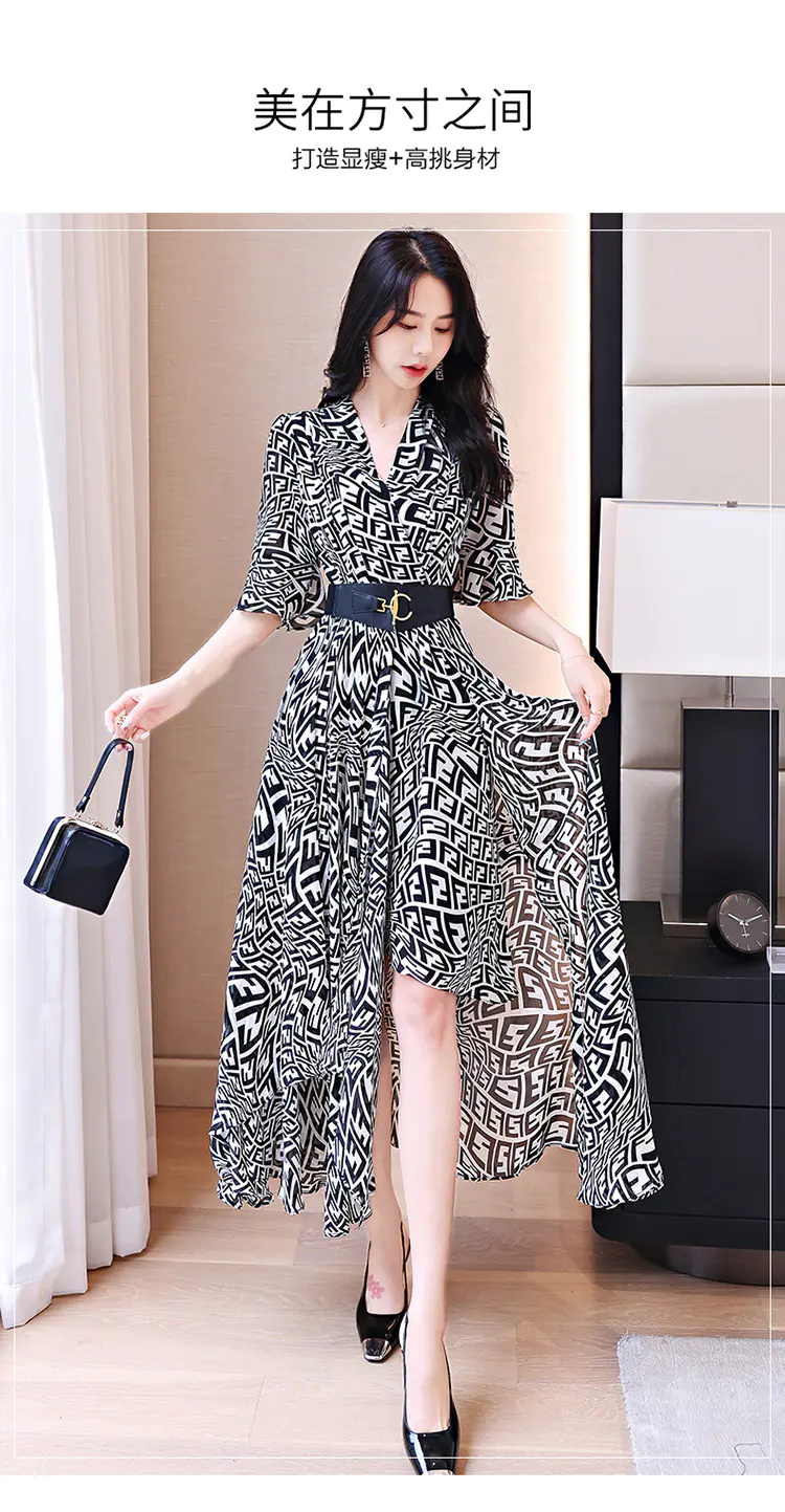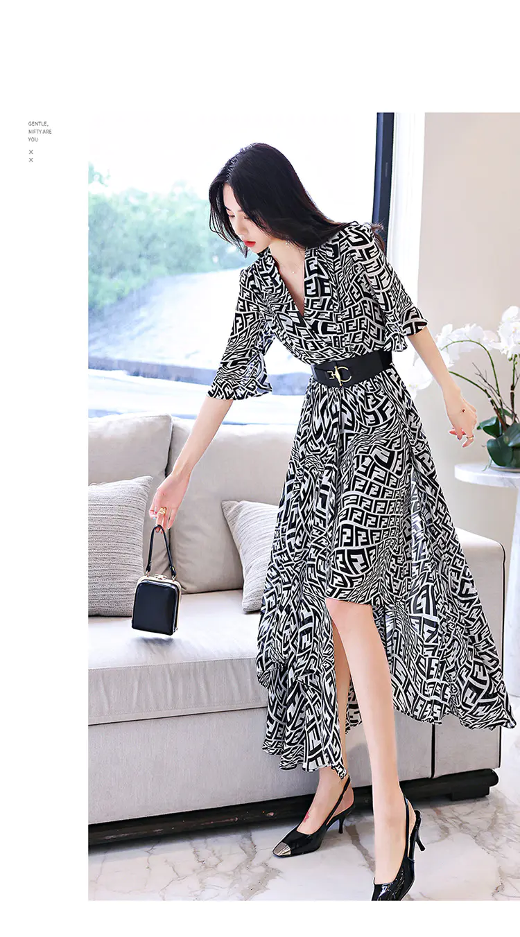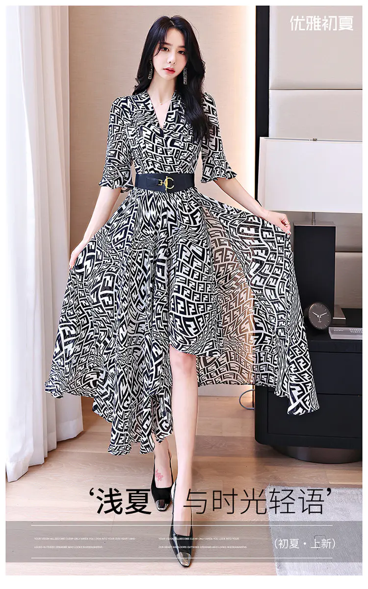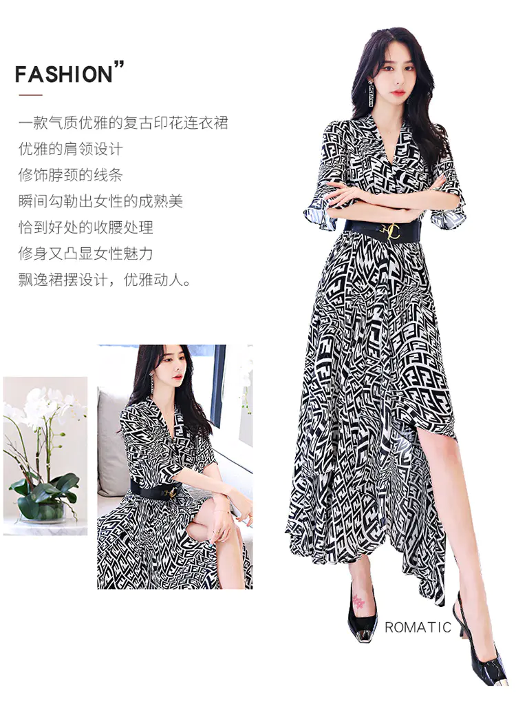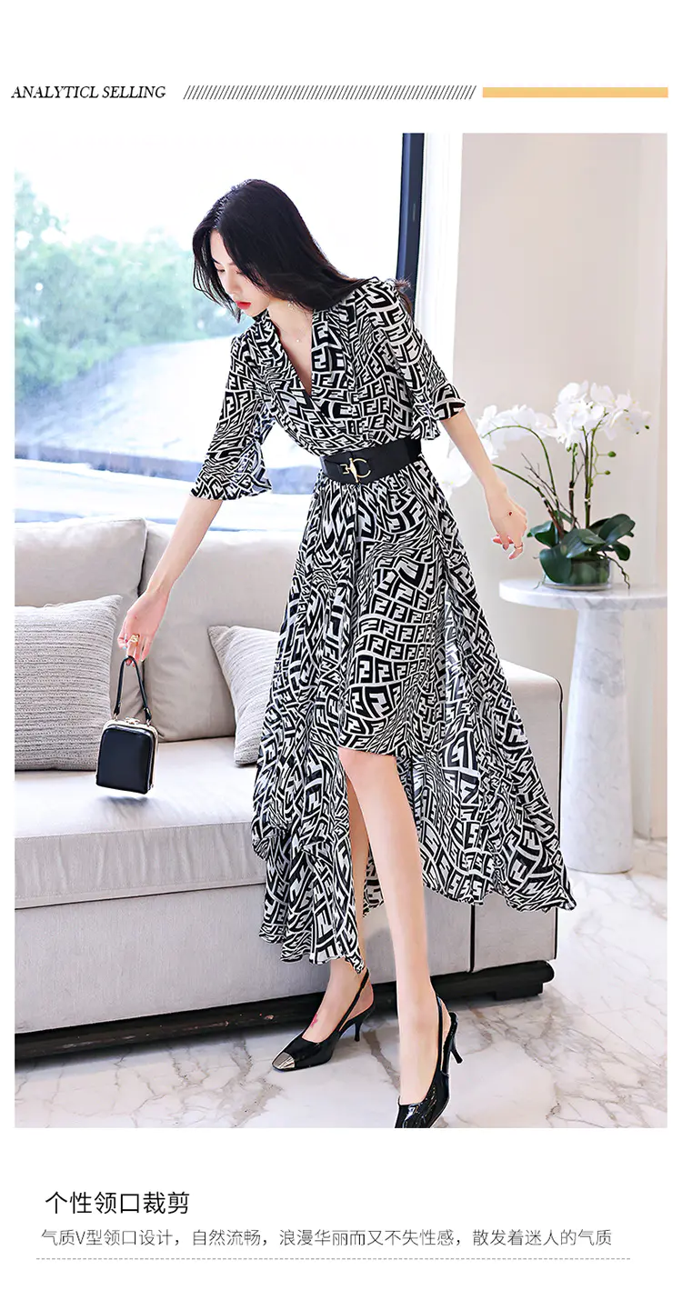 WZNH-WS2513-29夏季女新款修身长裙短袖不规则气质名媛黑色字母印花连衣裙女