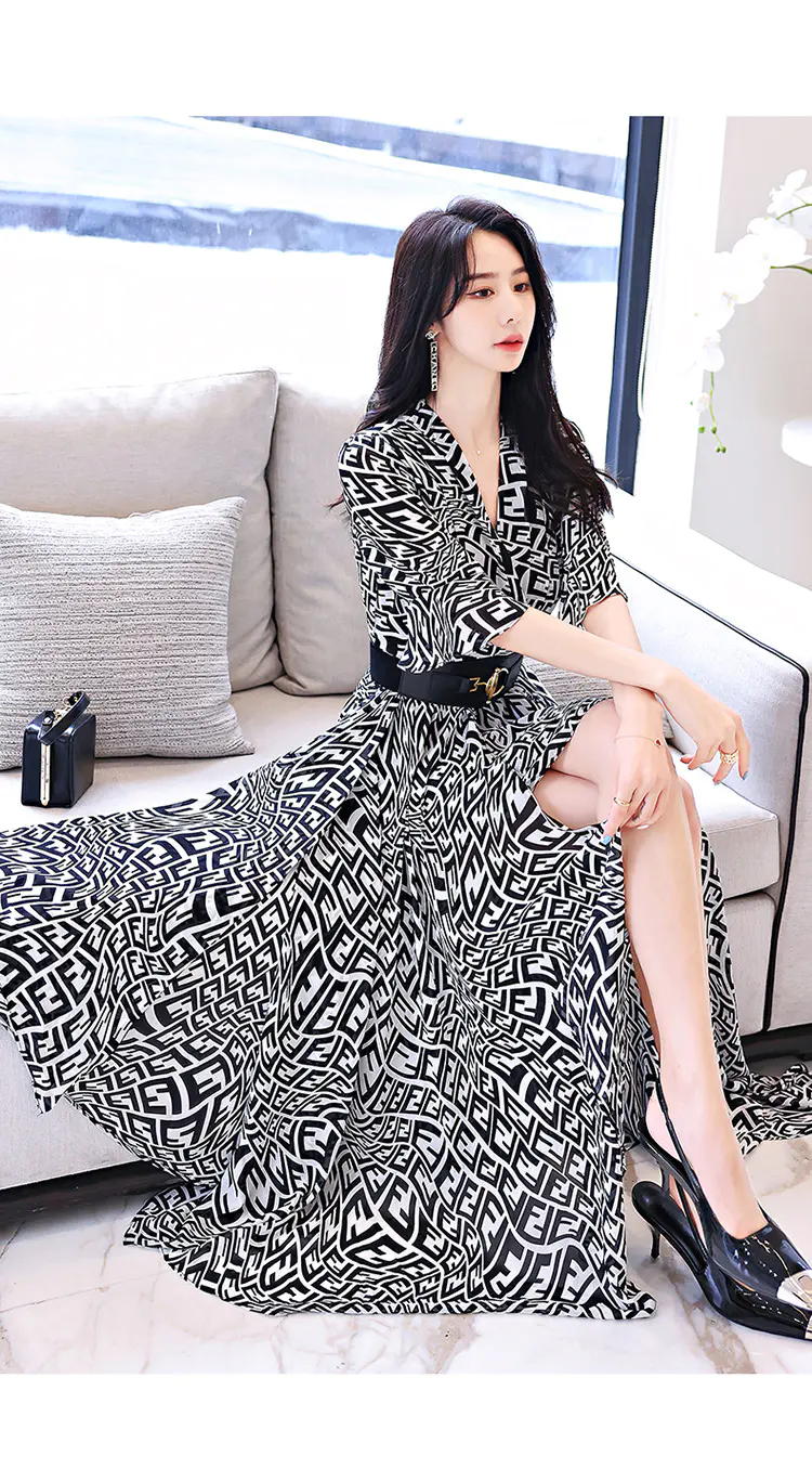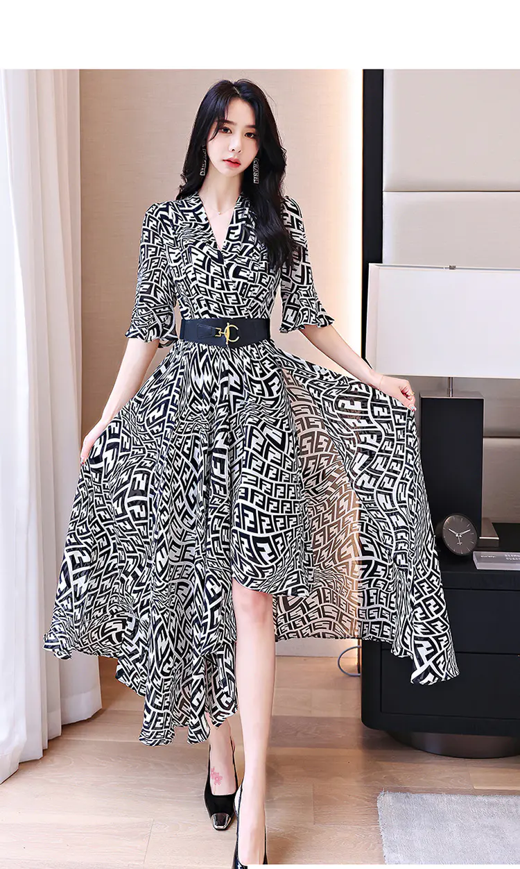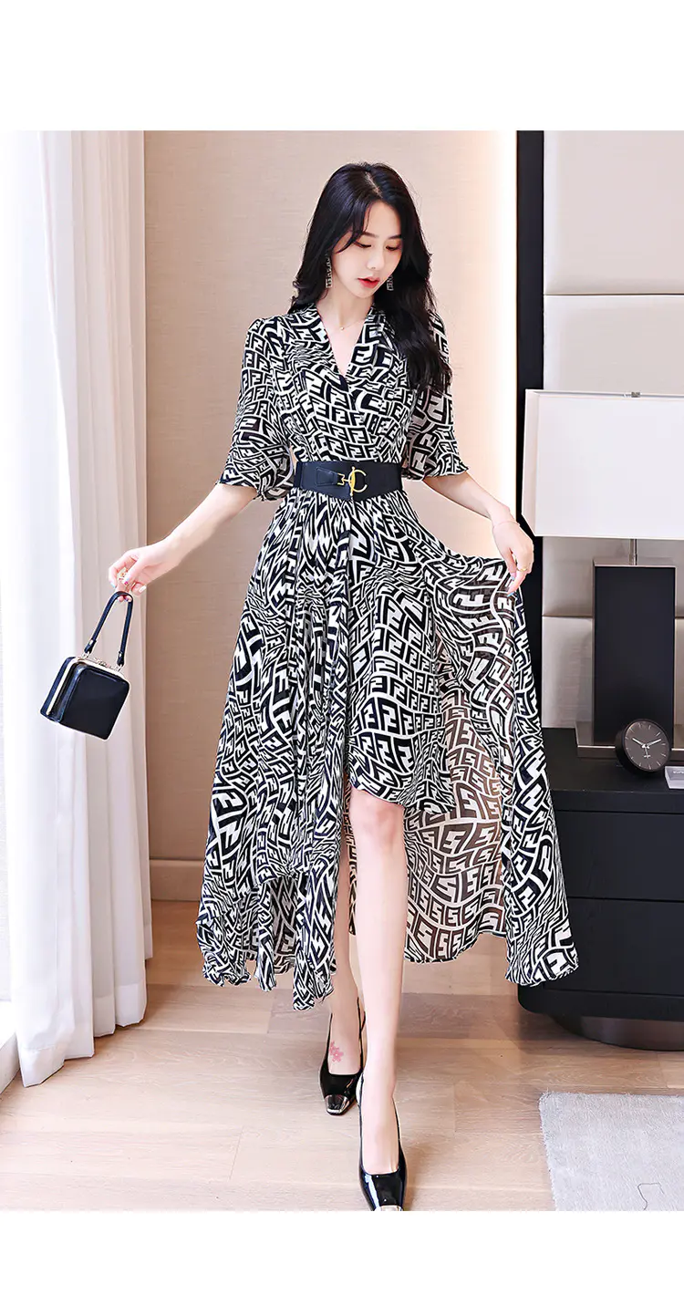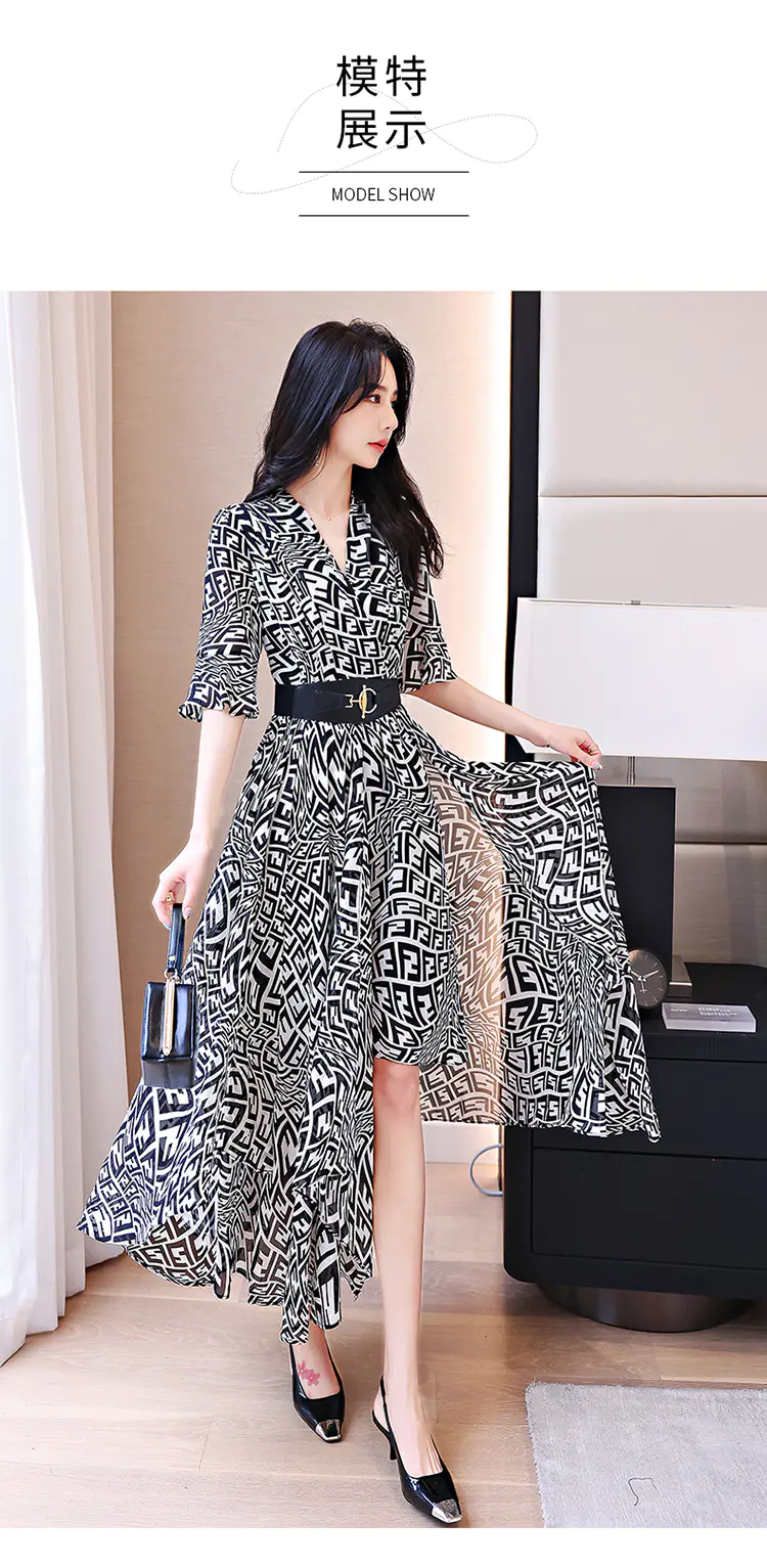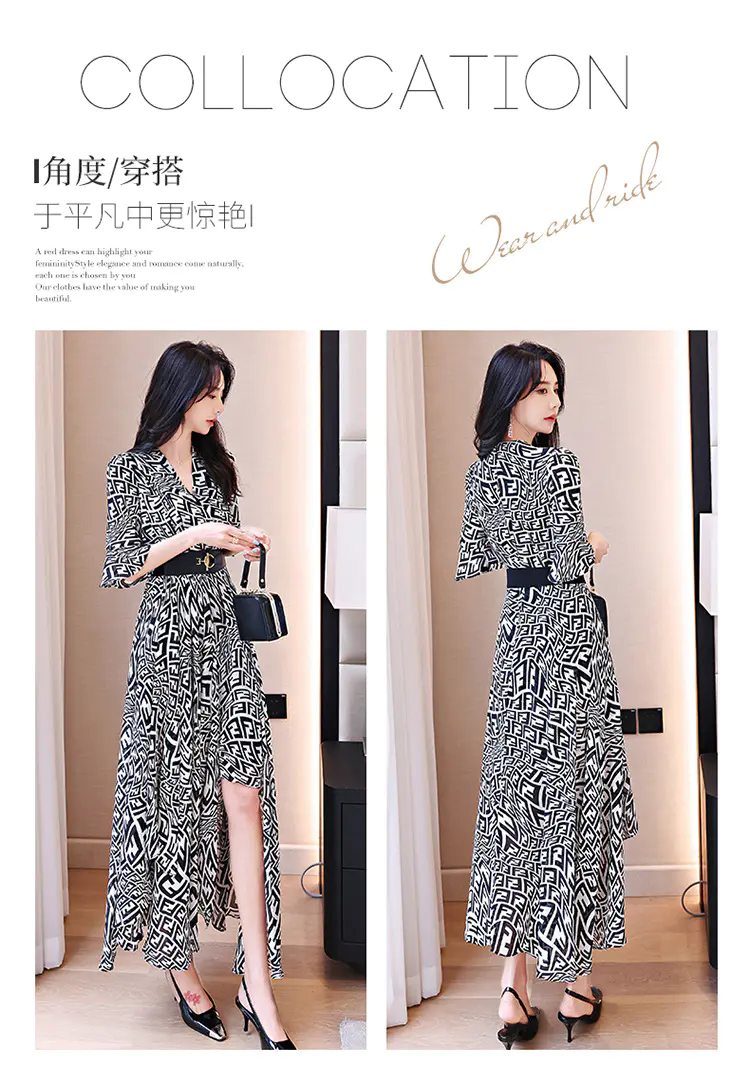 WZNH-WS2513-29夏季女新款修身长裙短袖不规则气质名媛黑色字母印花连衣裙女