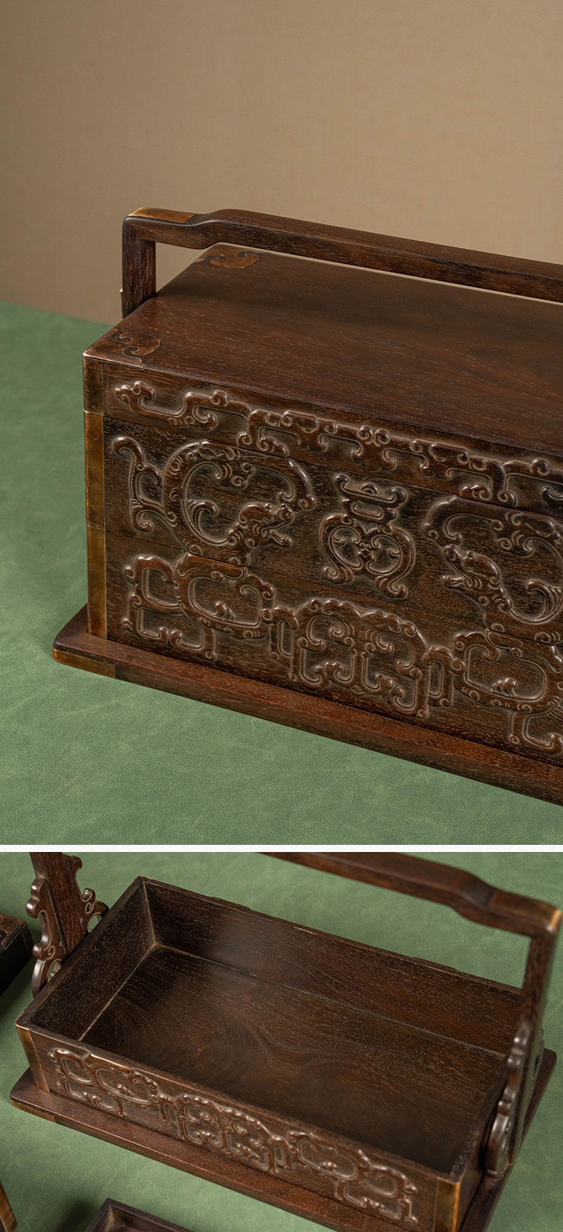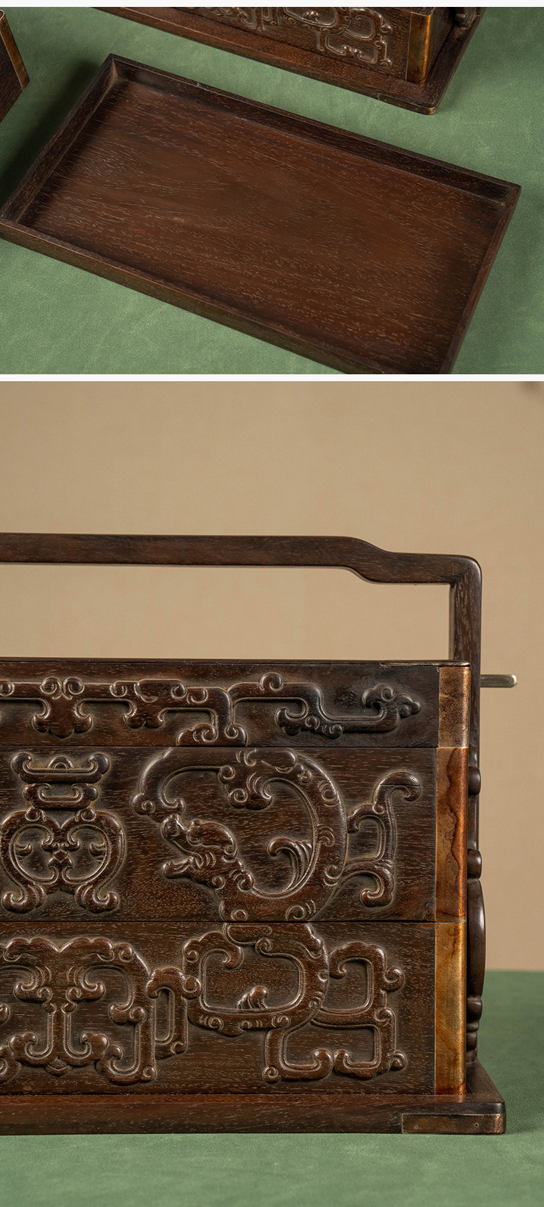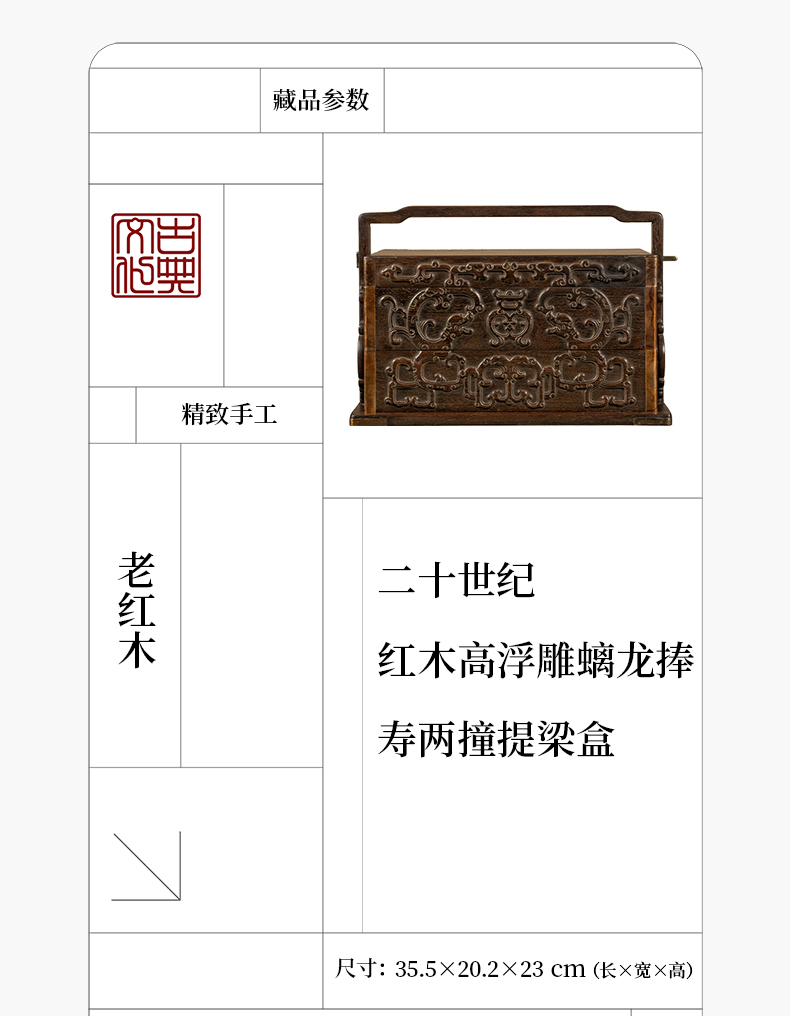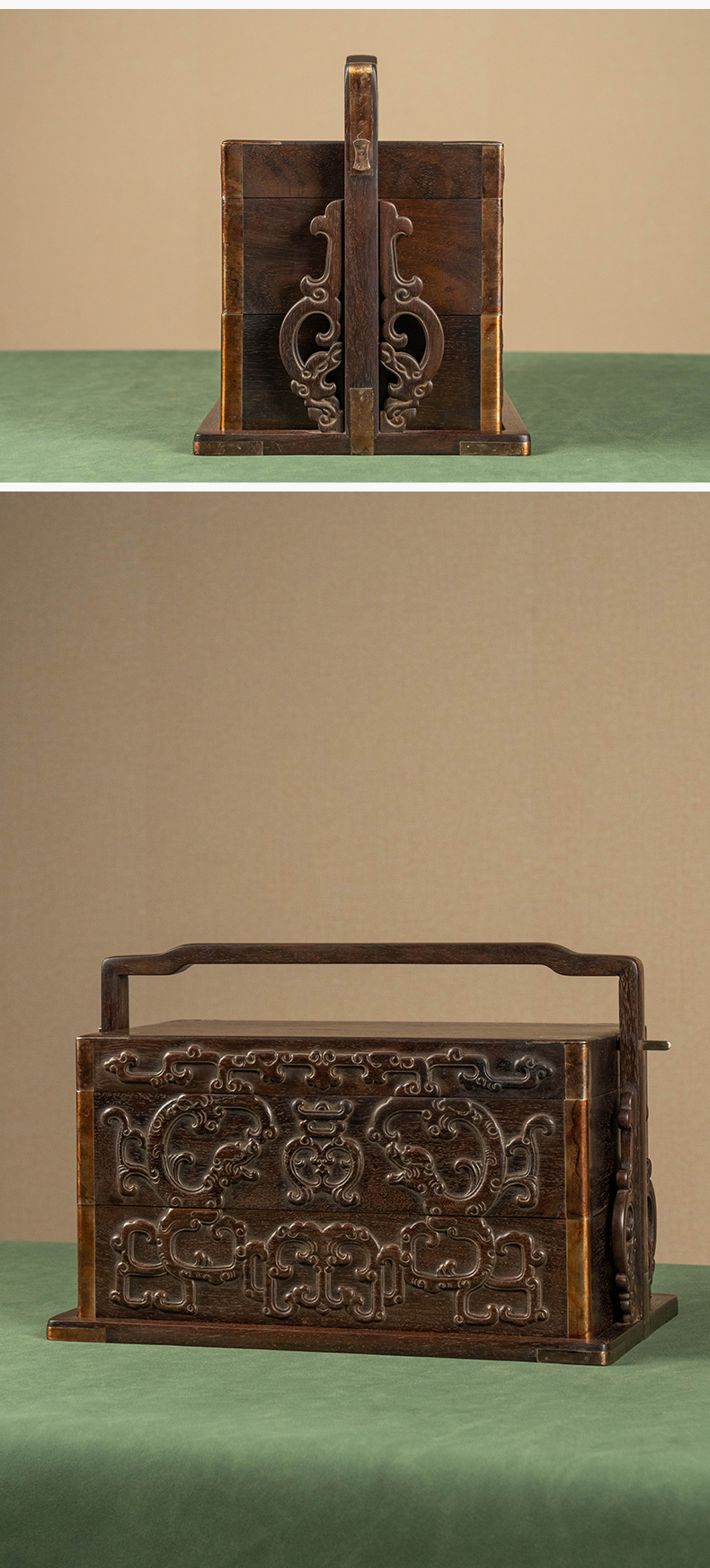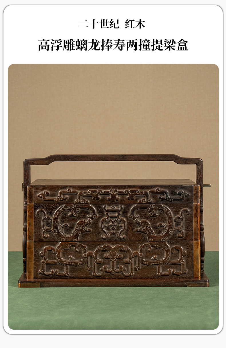二十世纪 红木高浮雕螭龙捧寿两撞提梁盒
