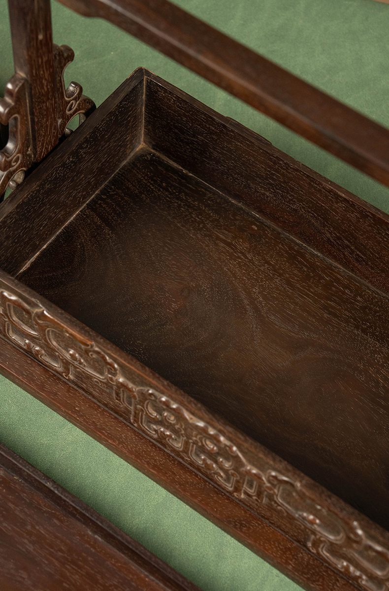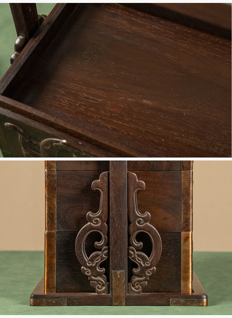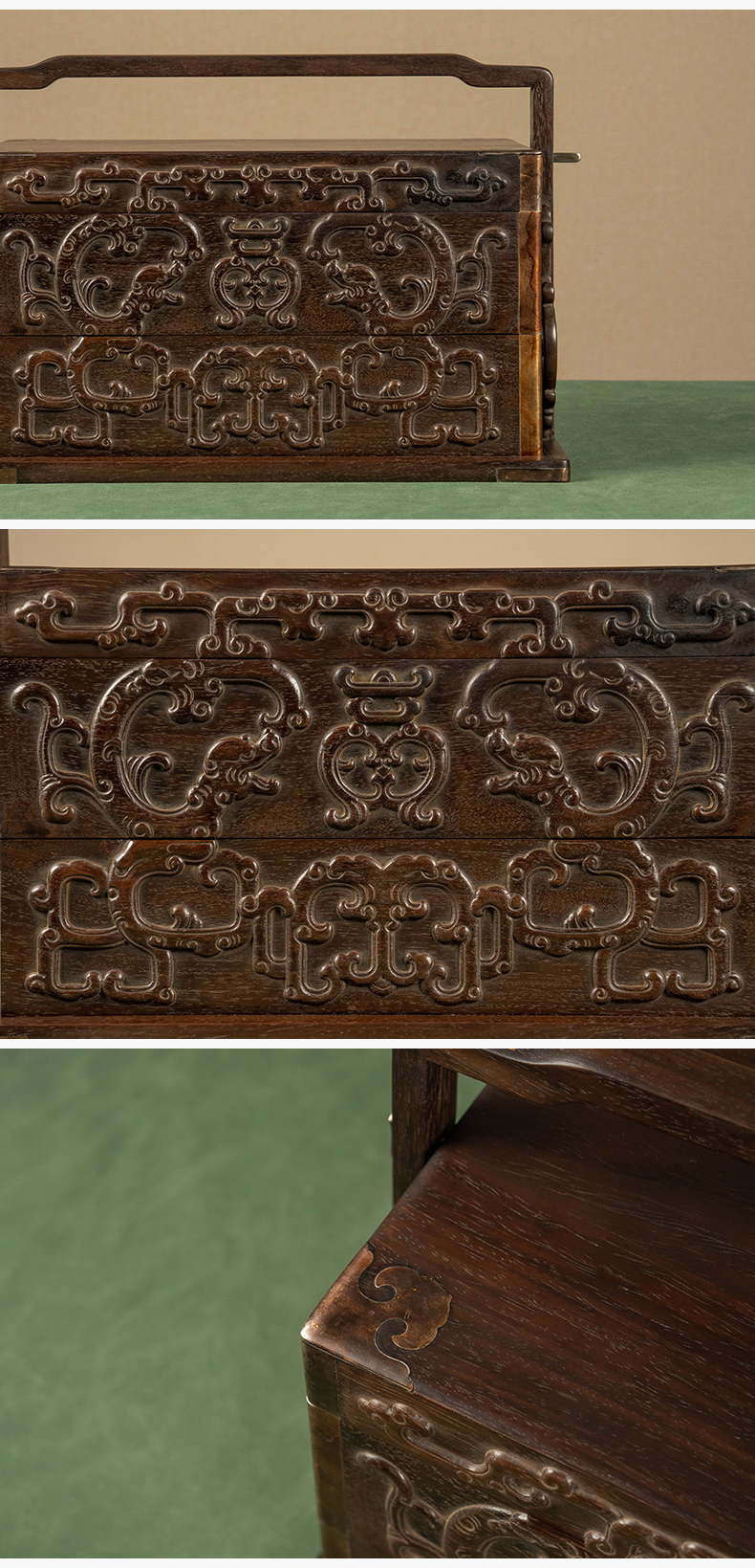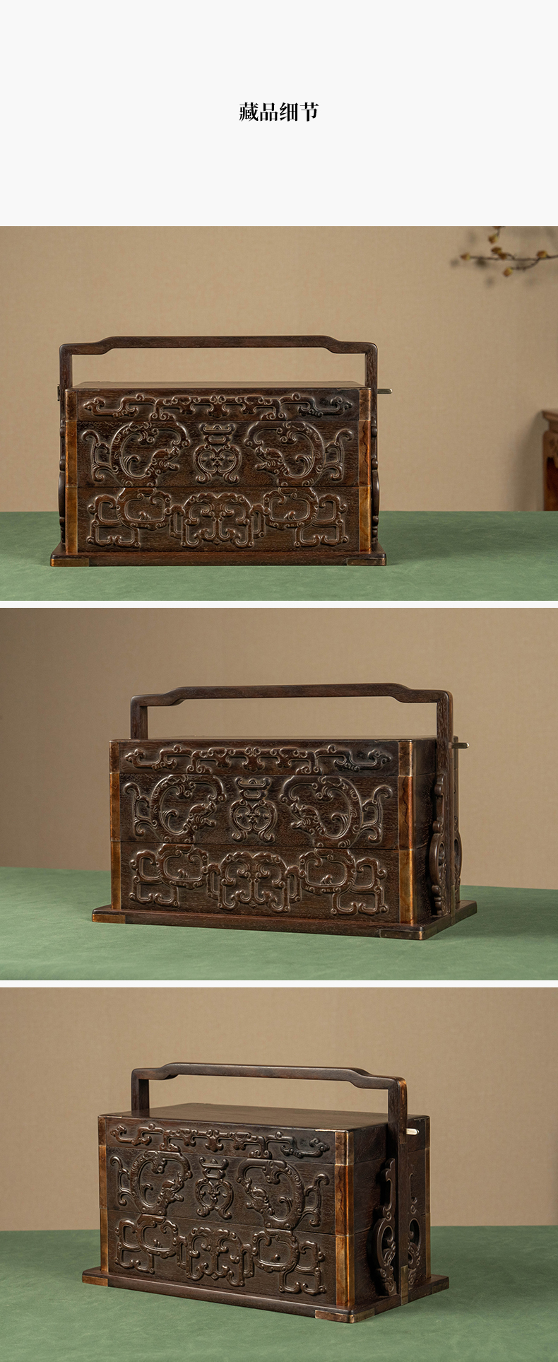二十世纪 红木高浮雕螭龙捧寿两撞提梁盒