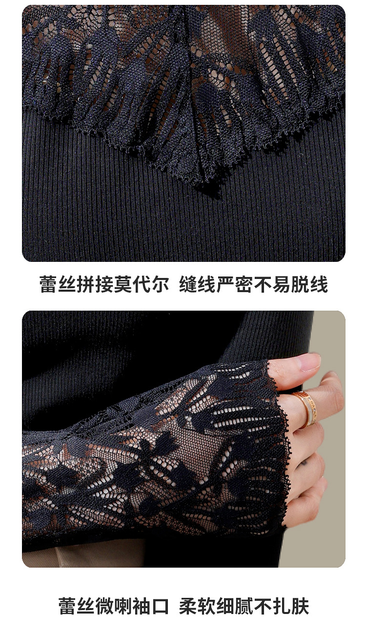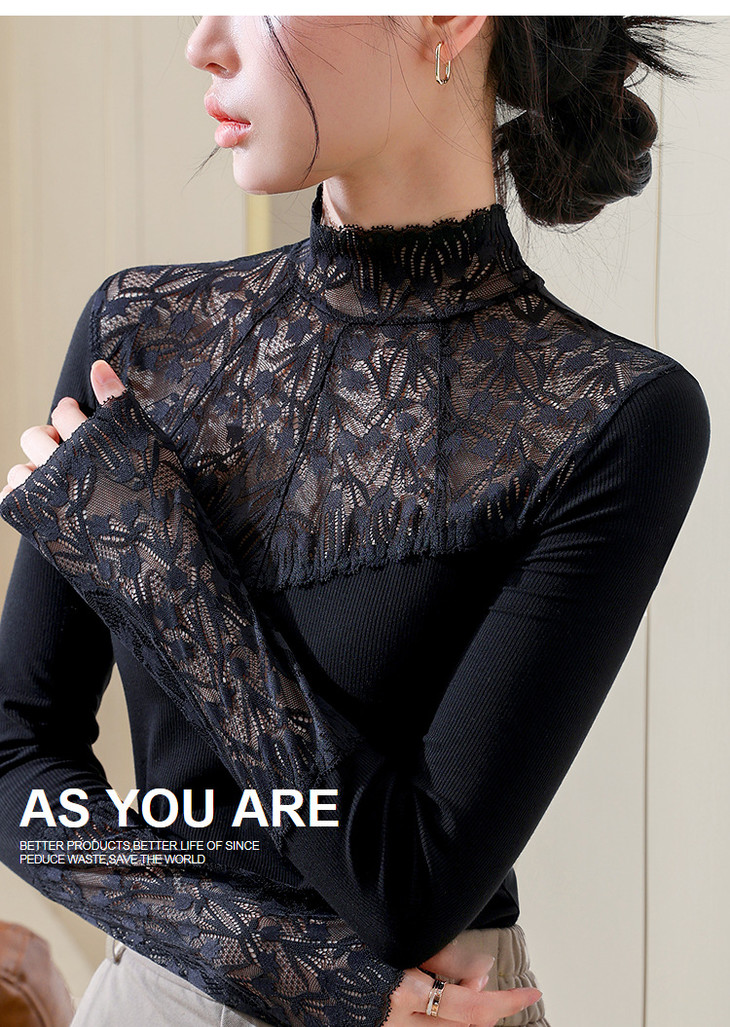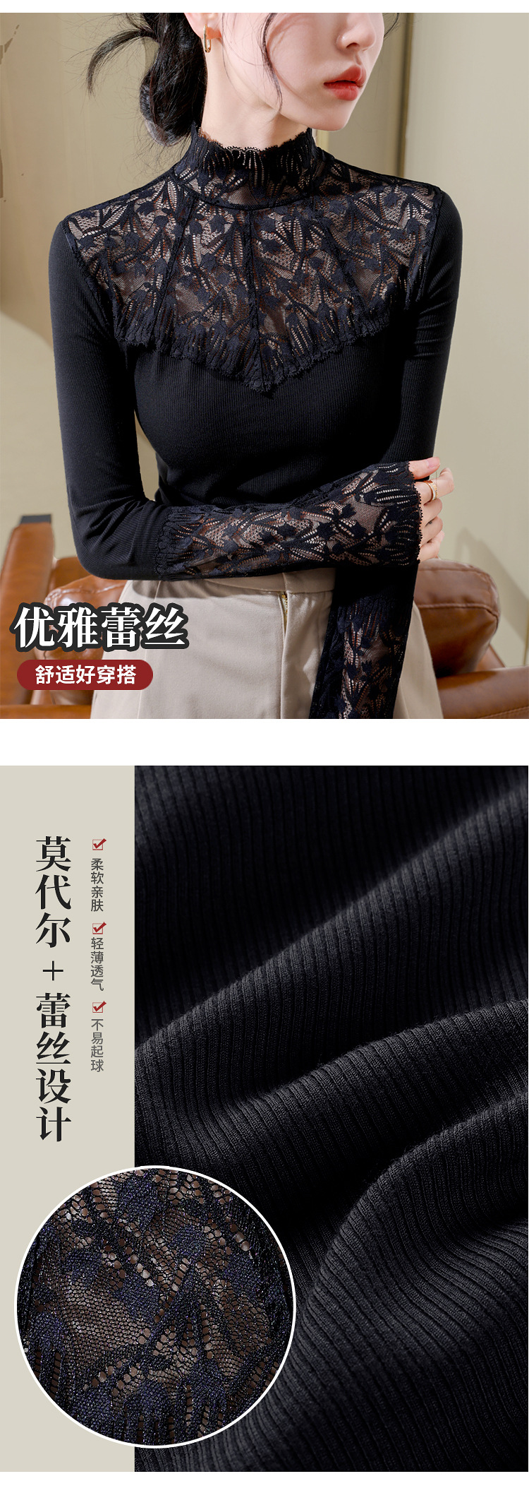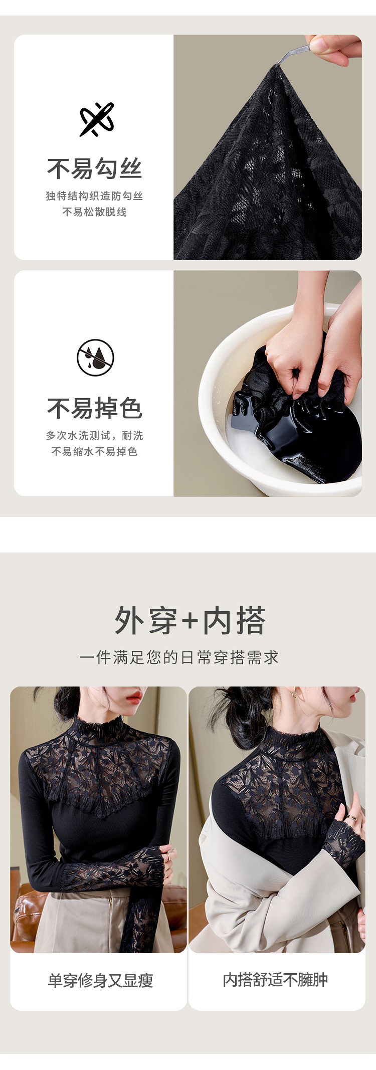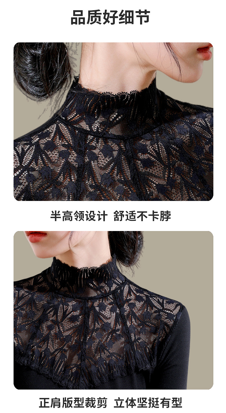 半高领打底衫,新款钩花蕾丝拼接螺纹长袖内搭别致上衣DY350927