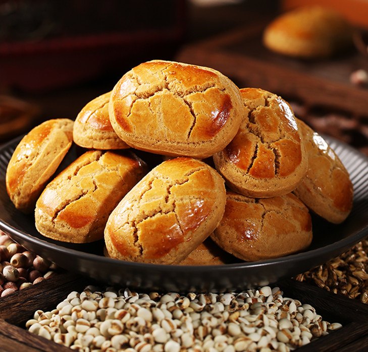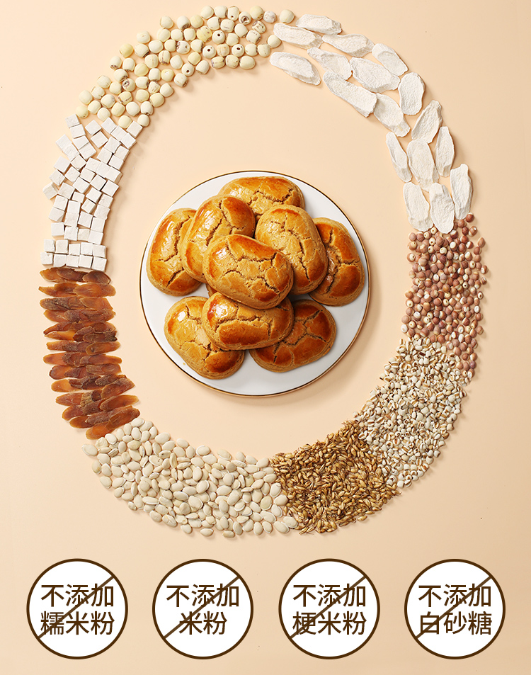 【配料】铁棍山药粉、茯苓、莲子、薏苡仁、芡实、白扁豆、炒麦芽、红枣、山楂、鲜鸡蛋、麦芽糖醇、花生油、碳酸氢钠(小苏打)