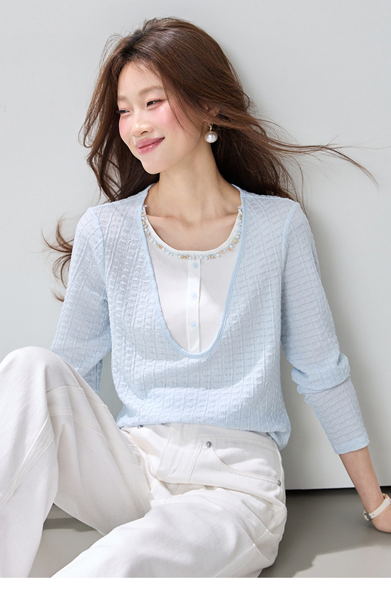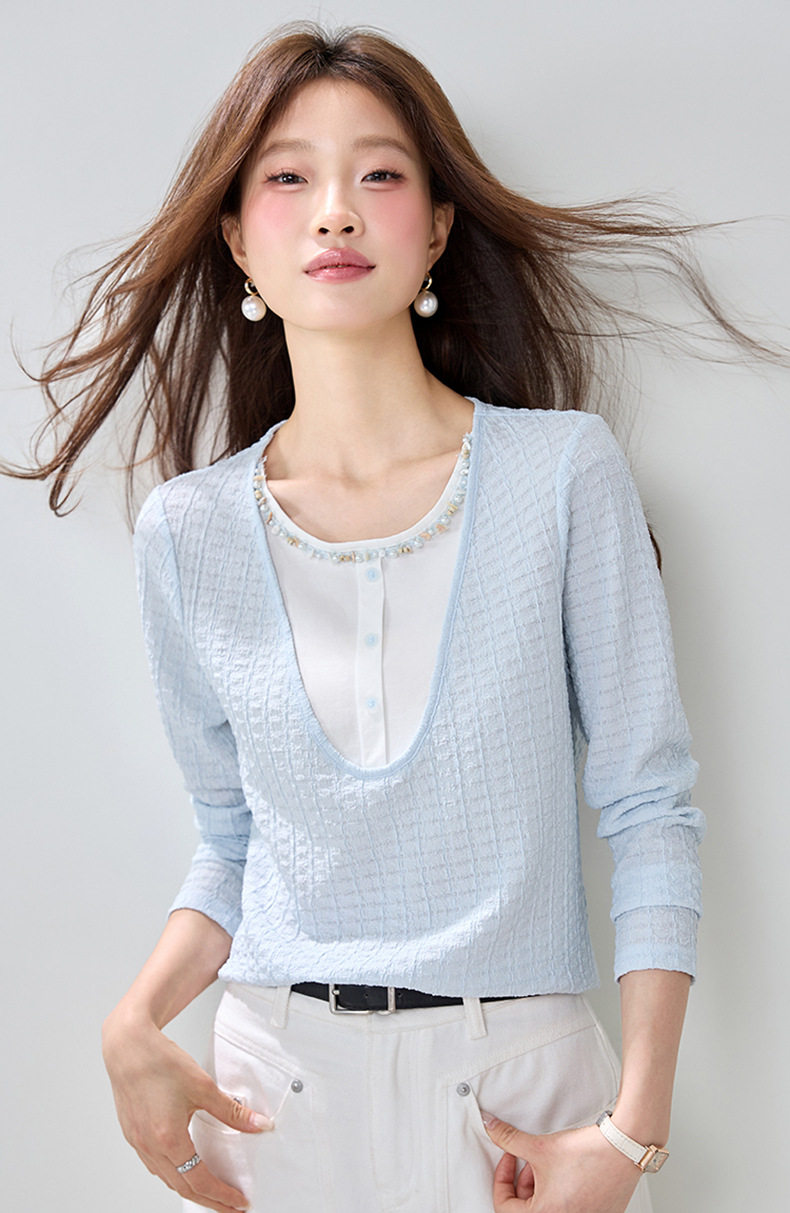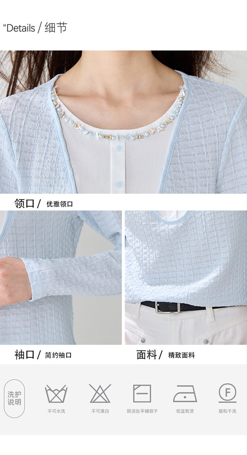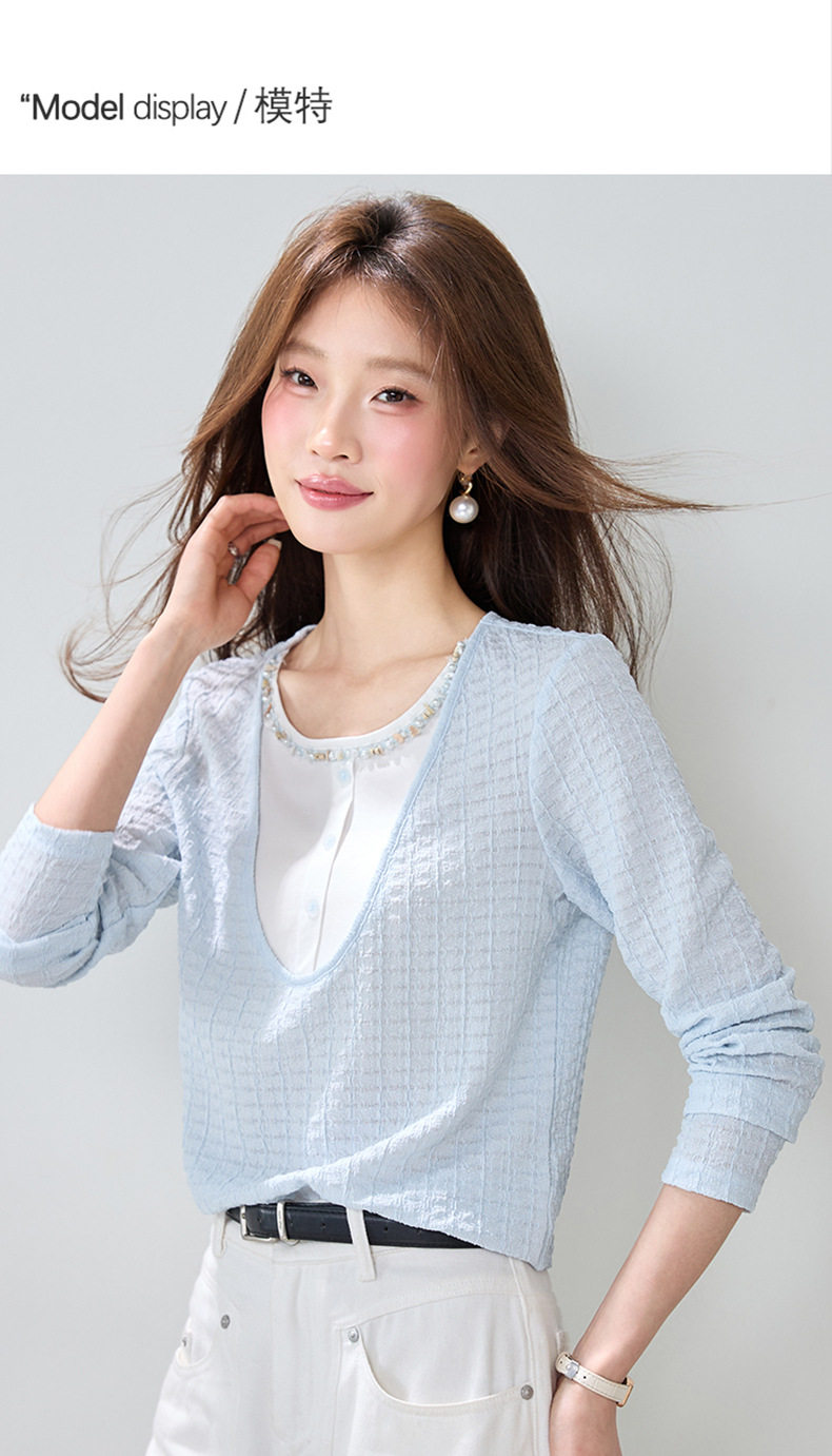 「自」全新升级【铂金会员174/天猫229/差价55】(14940)洛诗琳减龄钉珠薄款假两件上衣2026春季新款气质正肩长袖T恤
