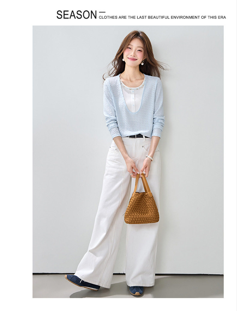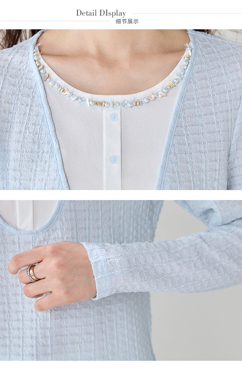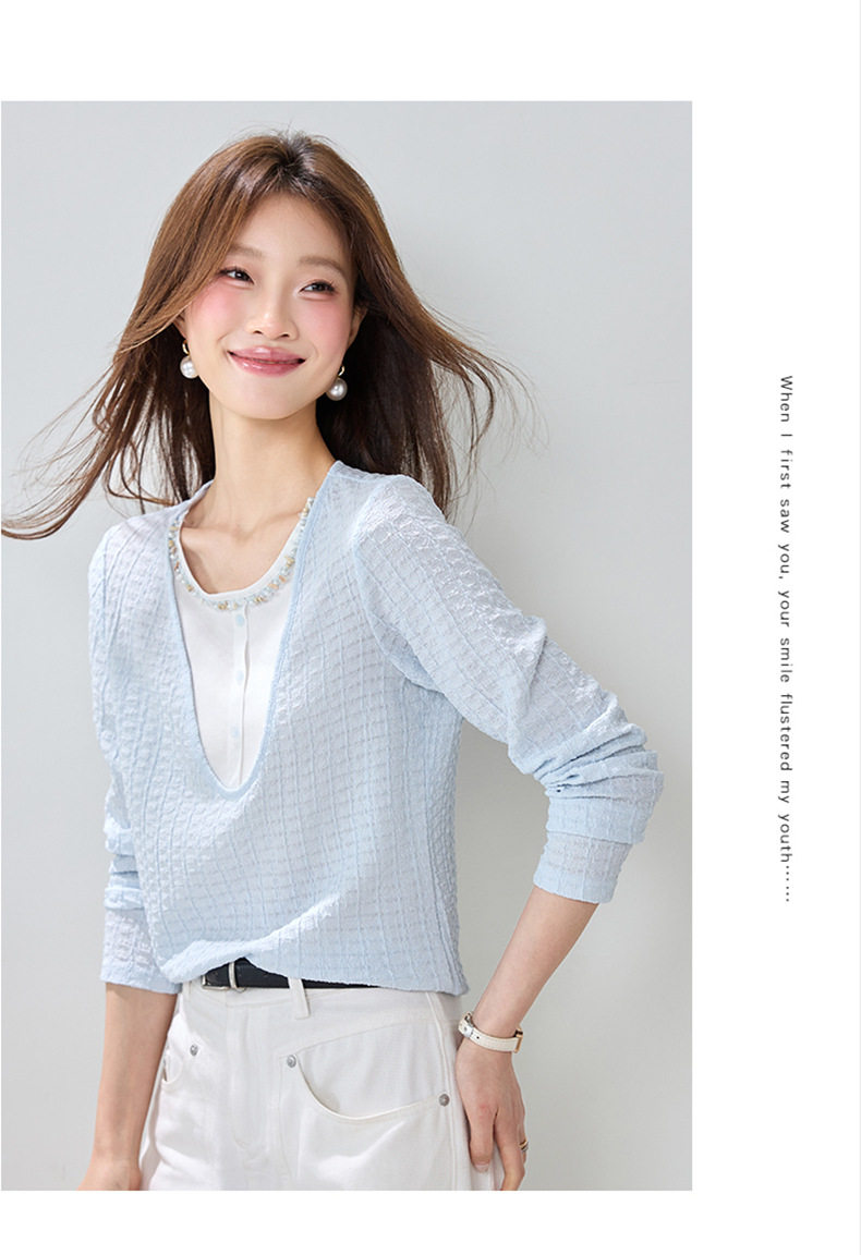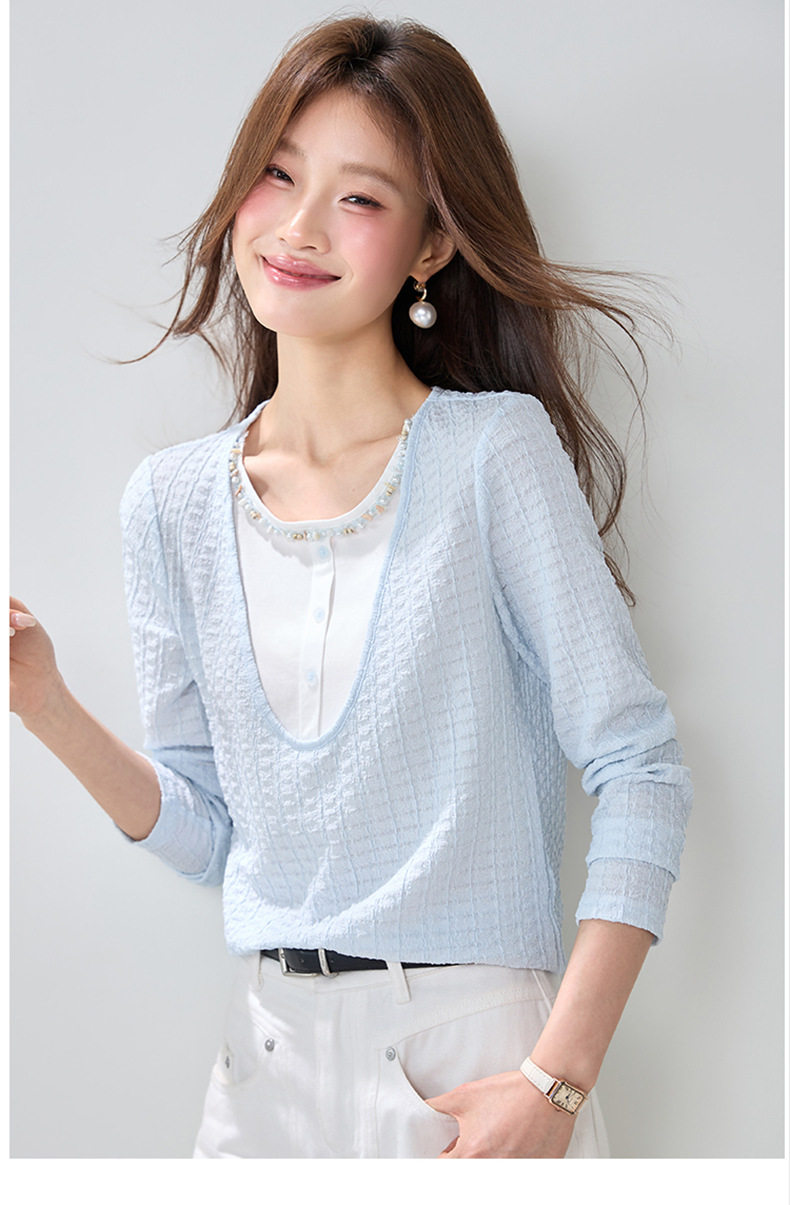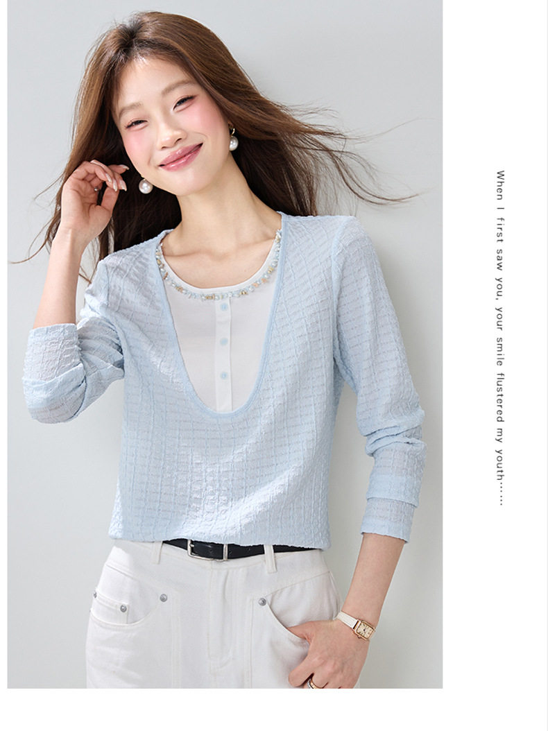 「自」全新升级【铂金会员174/天猫229/差价55】(14940)洛诗琳减龄钉珠薄款假两件上衣2026春季新款气质正肩长袖T恤