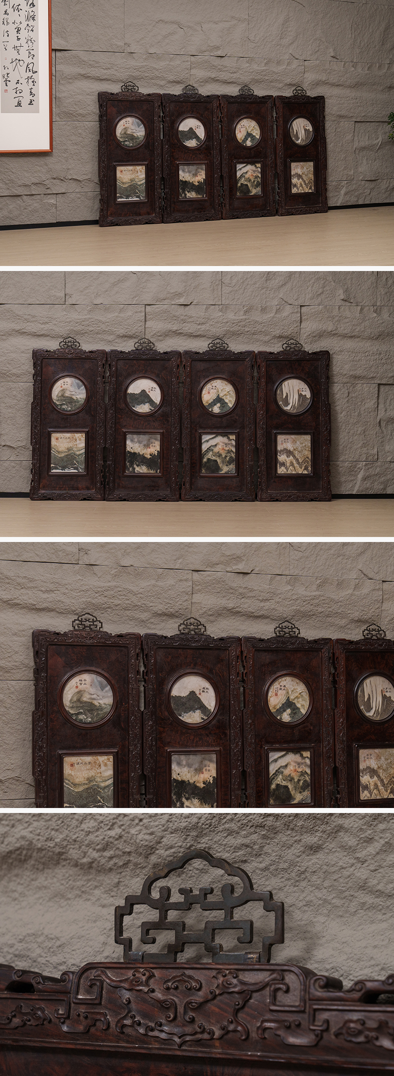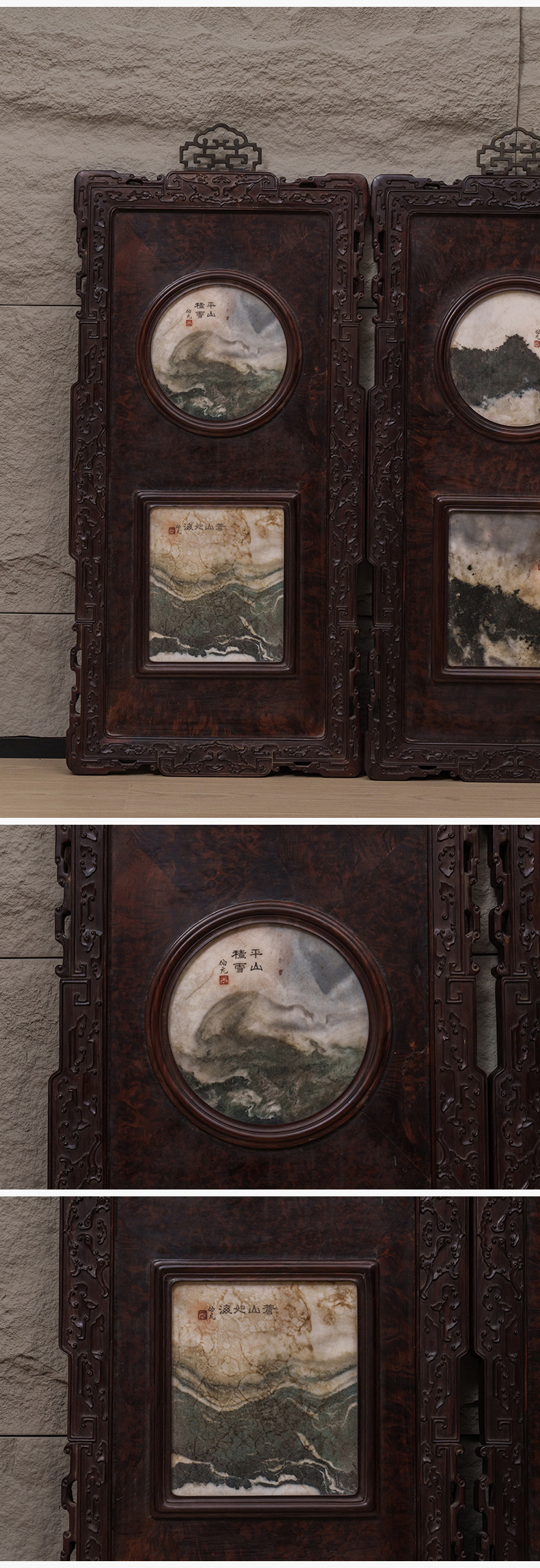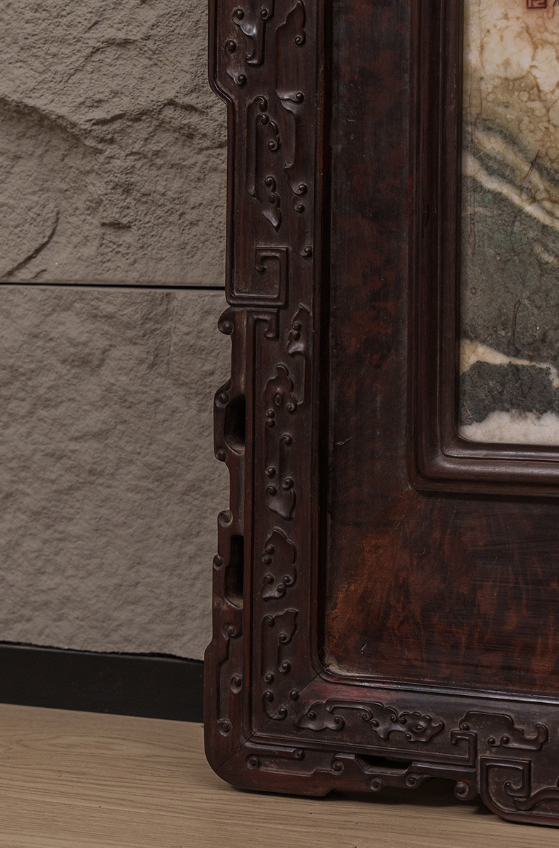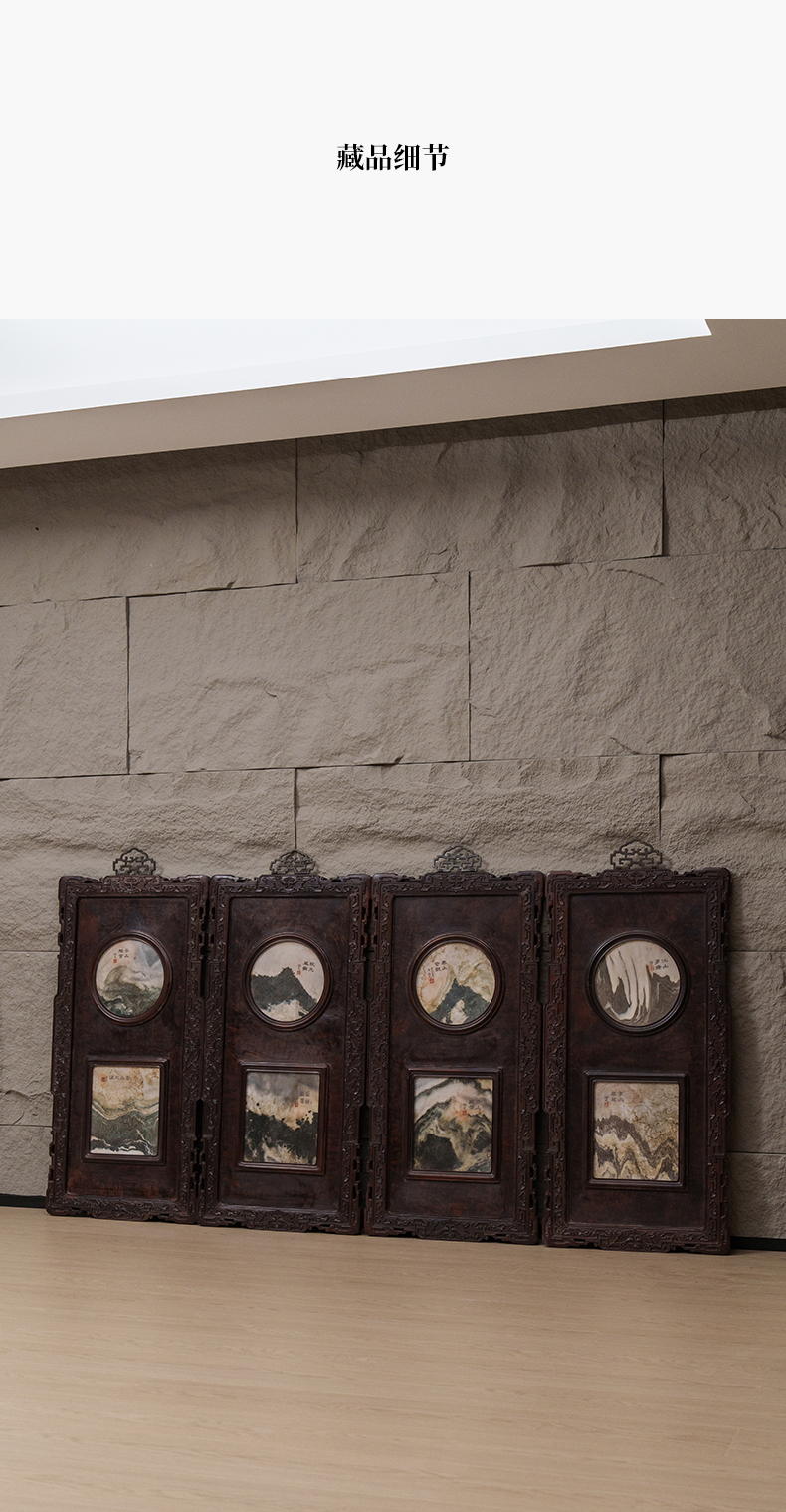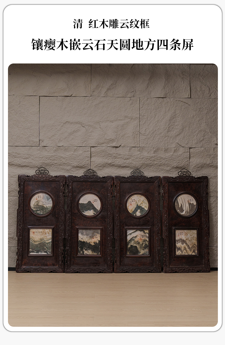 清 红木雕云纹框镶瘿木嵌云石天圆地方四条屏