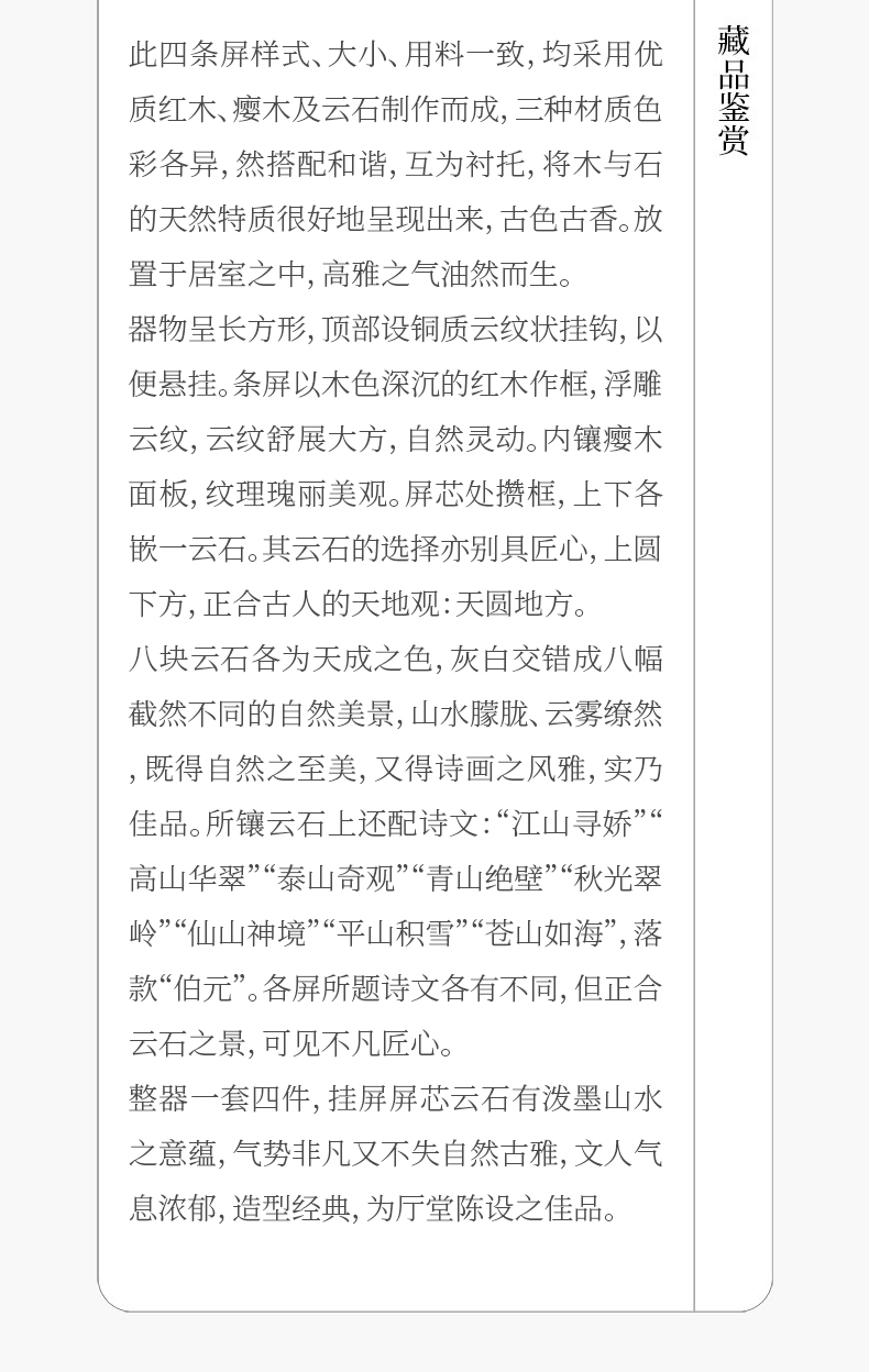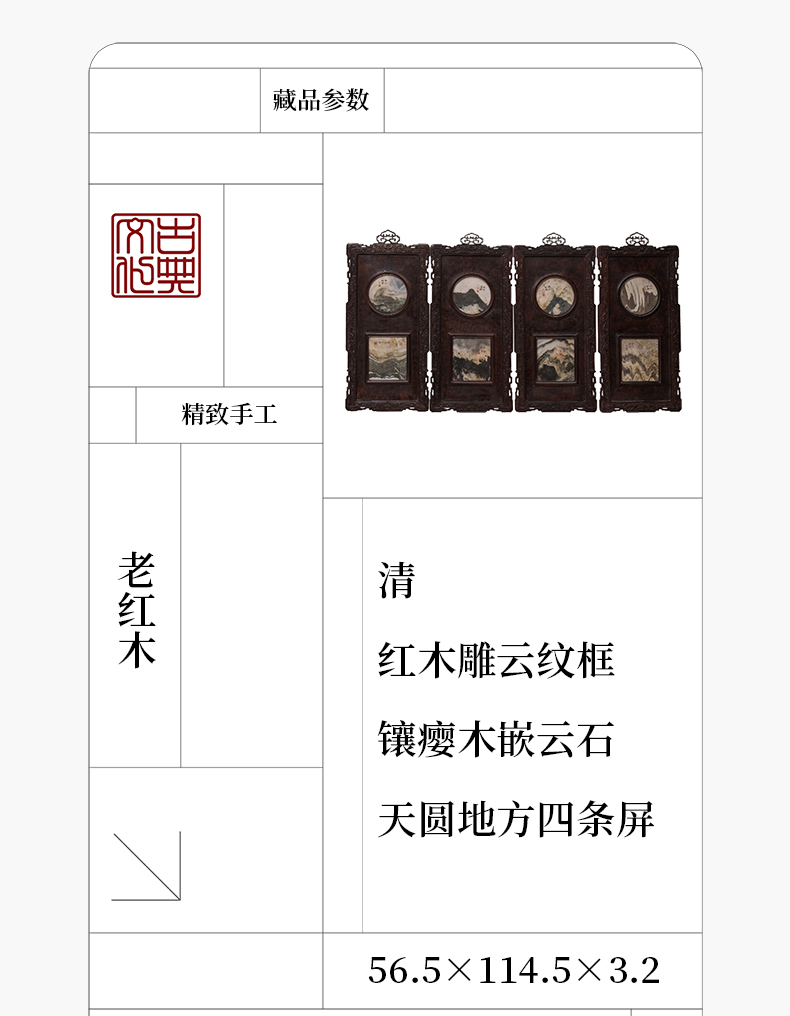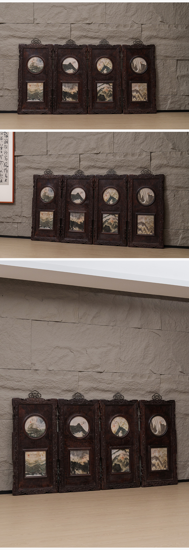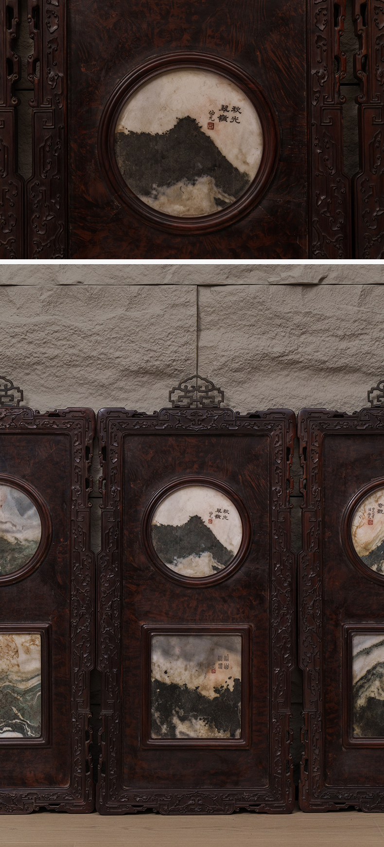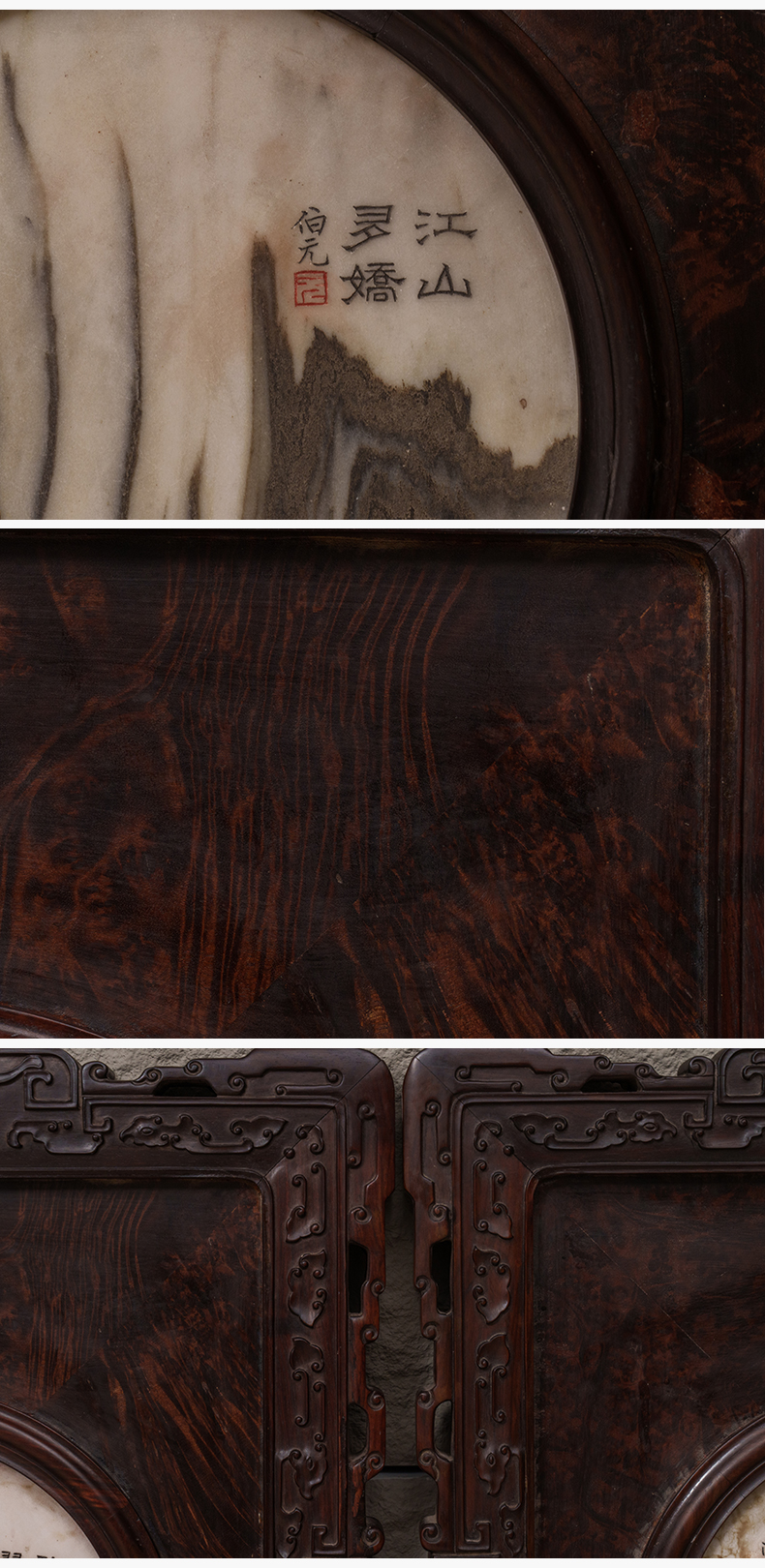 清 红木雕云纹框镶瘿木嵌云石天圆地方四条屏