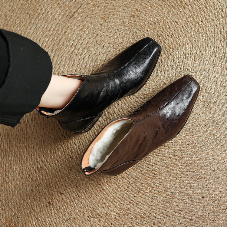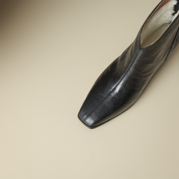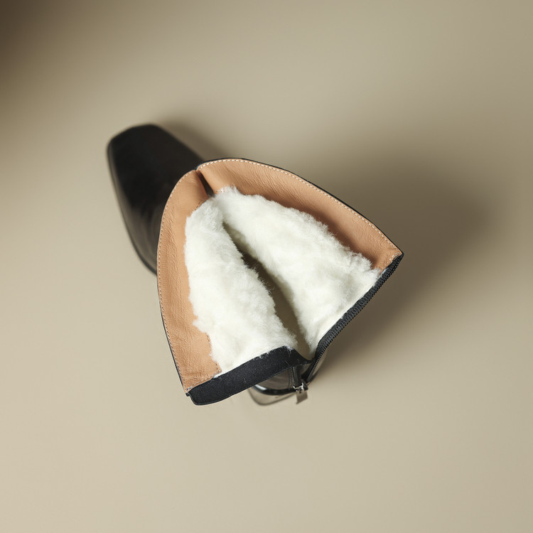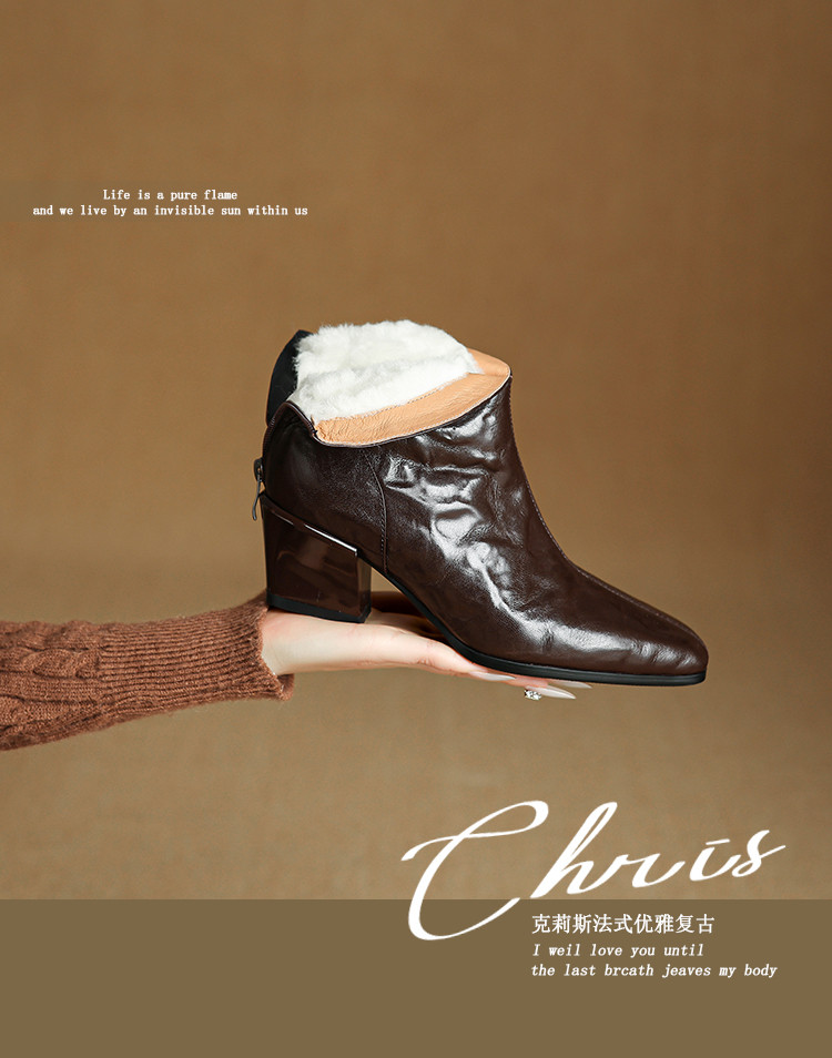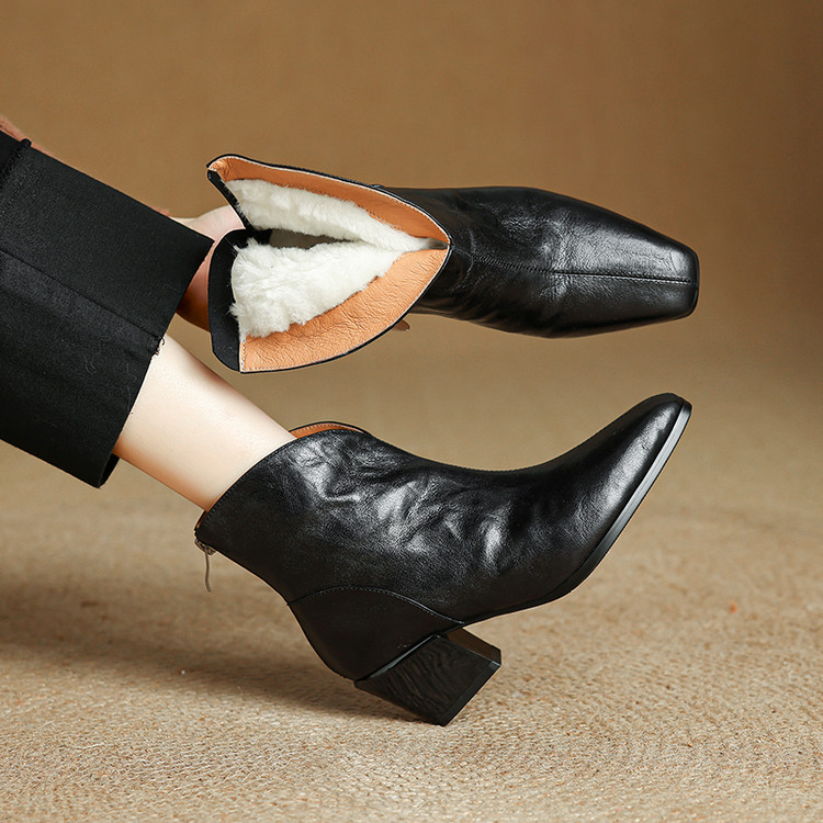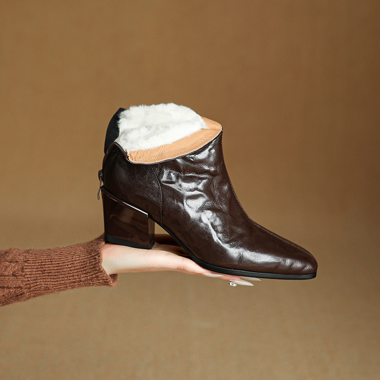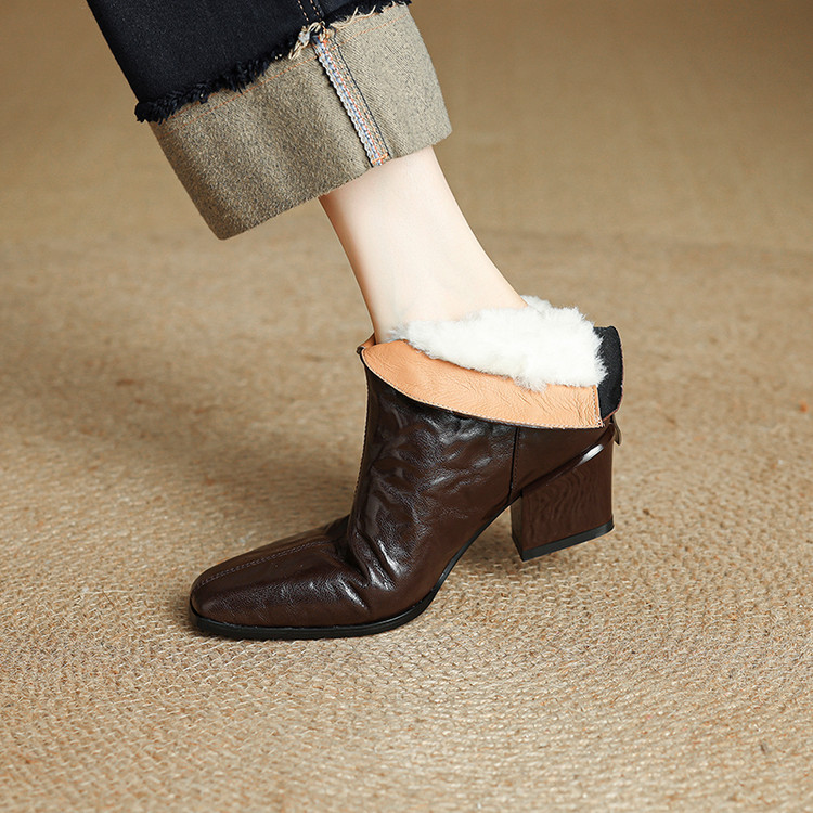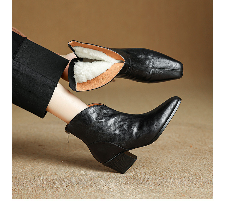 【预售5天】真皮真毛粗跟羊皮短靴女冬季羊羔毛雪地靴方头高跟瘦瘦靴保暖大棉鞋MLJ&C210