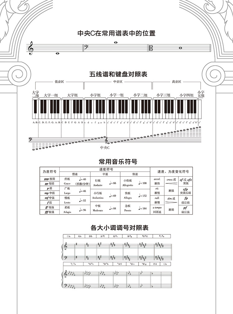 本书是由西南师范大学出版社音乐教育分社自行策划设计的五线谱本,是音乐专业师生及音乐爱好者必备的记写音符的练习本。全书主要分为两大部分,其一即大量空白五线谱表;其二为封二、封三上的音乐知识。封二上有中央c在各谱表的位置、键盘对应表、音乐表情符号、各大小调调号对应表等信息,封三上有各大小调I、IV、V和弦及其转位音位置对照表等知识。这些丰富、实用的音乐知识将为读者完成音符的记写提供极大便利。
