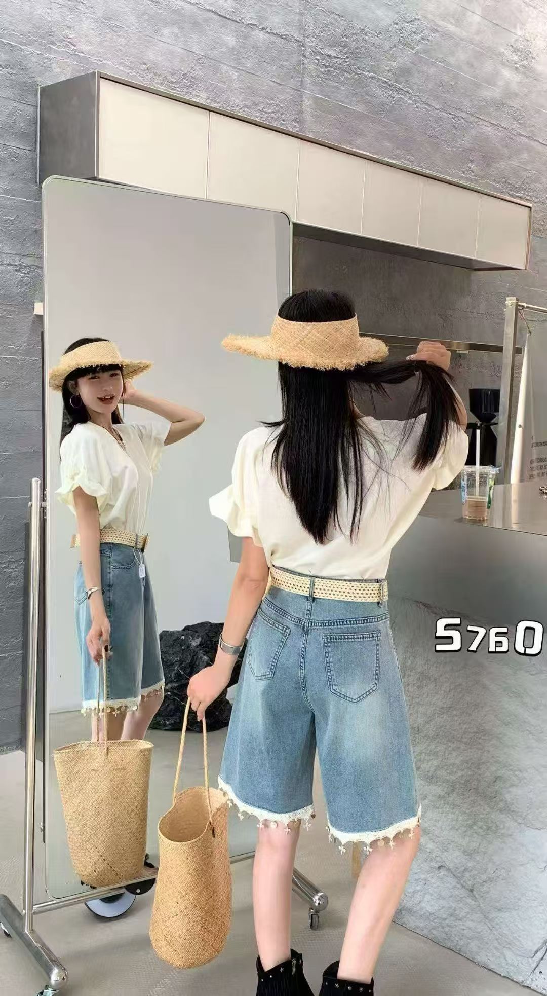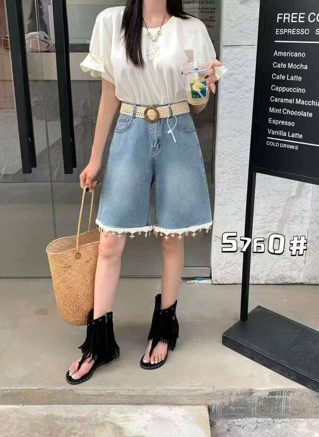 {短裤2025}(送腰带)棉➕莱赛尔夏季软料5760时尚挂饰五分牛仔短裤-喜出