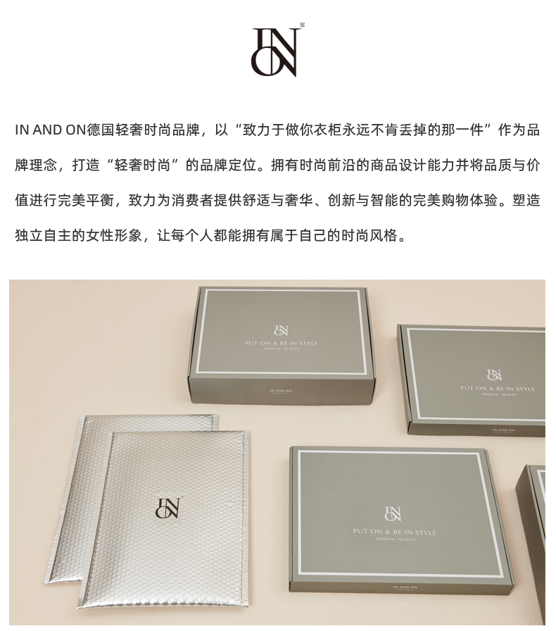 IN AND ON—轻奢时尚品牌,以“致力于做你衣柜永远不肯丢掉的那一件”作为品牌理念,打造“轻奢时尚”的品牌定位。拥有时尚前沿的商品设计能力并将品质与价值进行完美平衡,致力为消费者提供舒适与奢华、创新与智能的完美购物体验。塑造独立自主的女性形象,让每个人都能拥有属于自己的时尚风格。