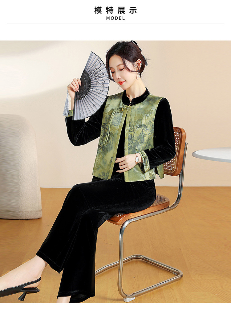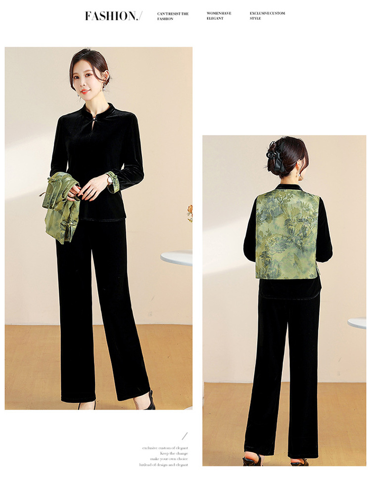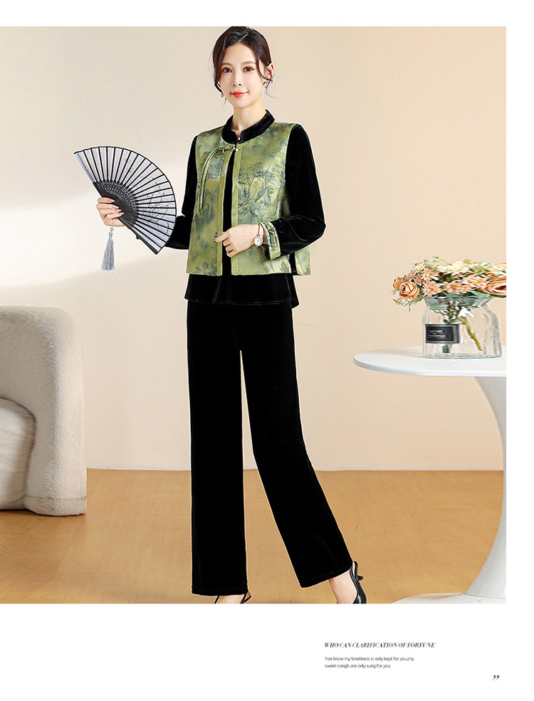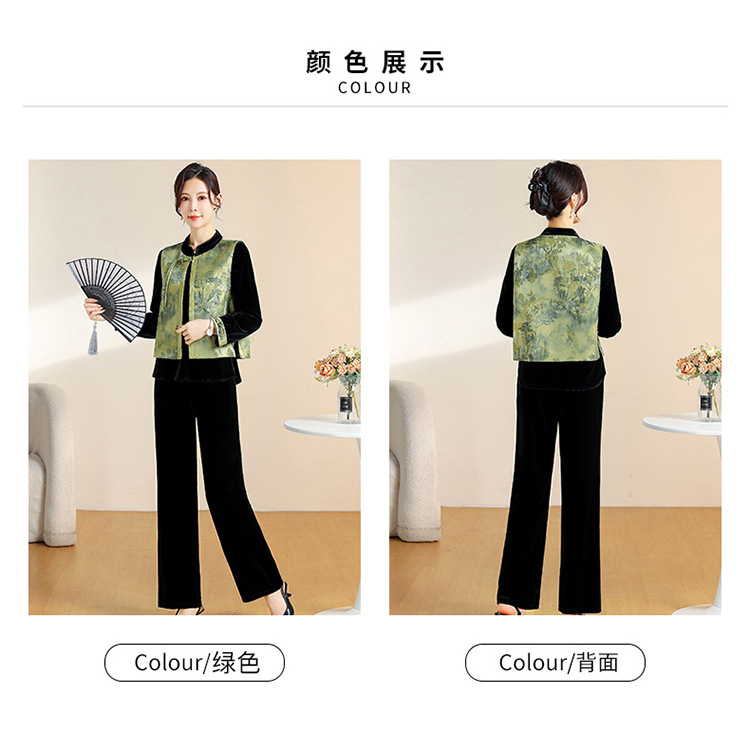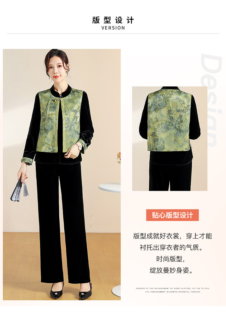 QYM CS25A60-Y时尚三件套妈妈装国风复古印花马甲+长袖小衫+直筒裤套装