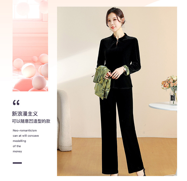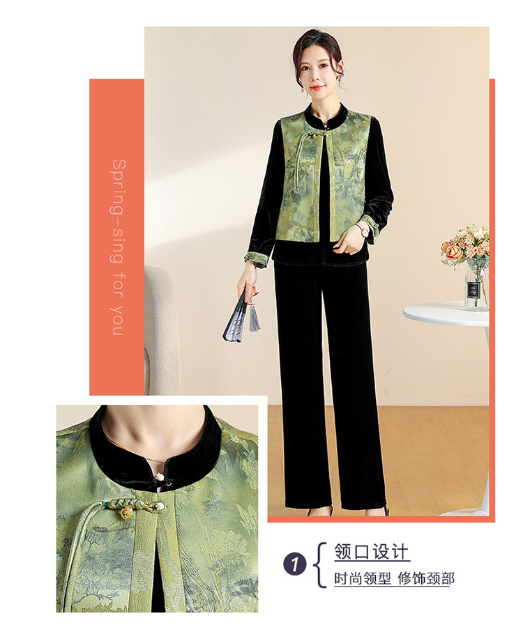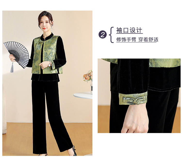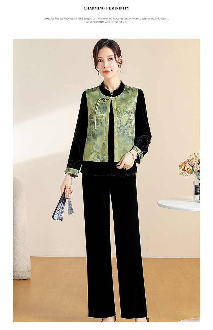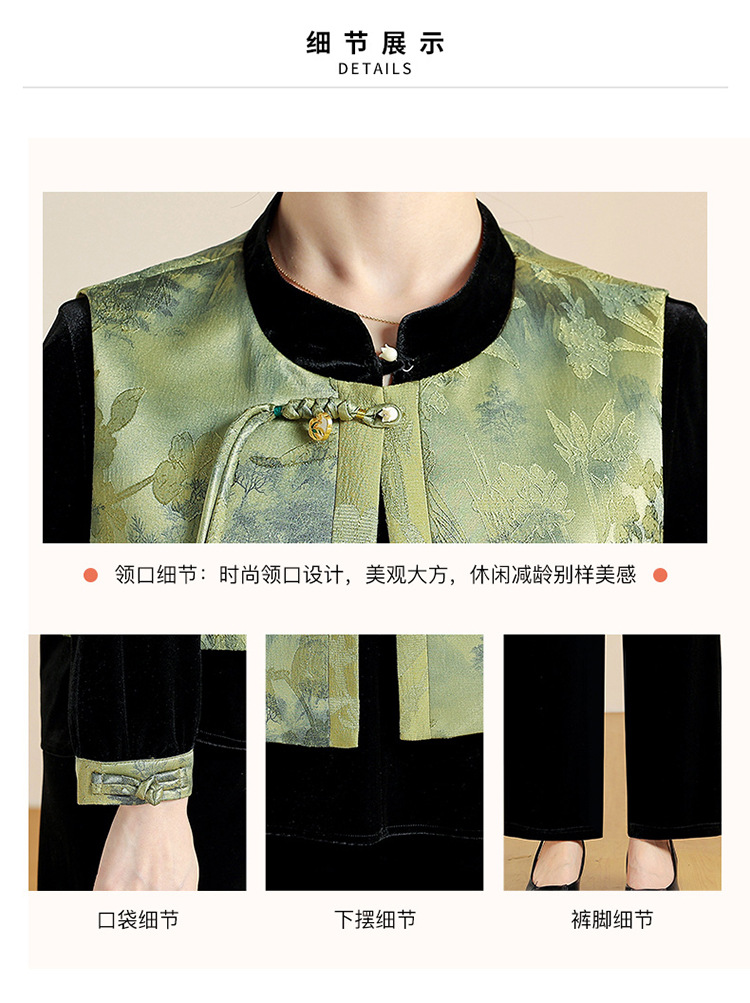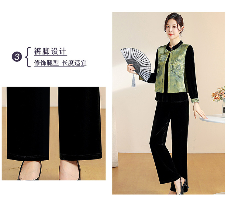 QYM CS25A60-Y时尚三件套妈妈装国风复古印花马甲+长袖小衫+直筒裤套装