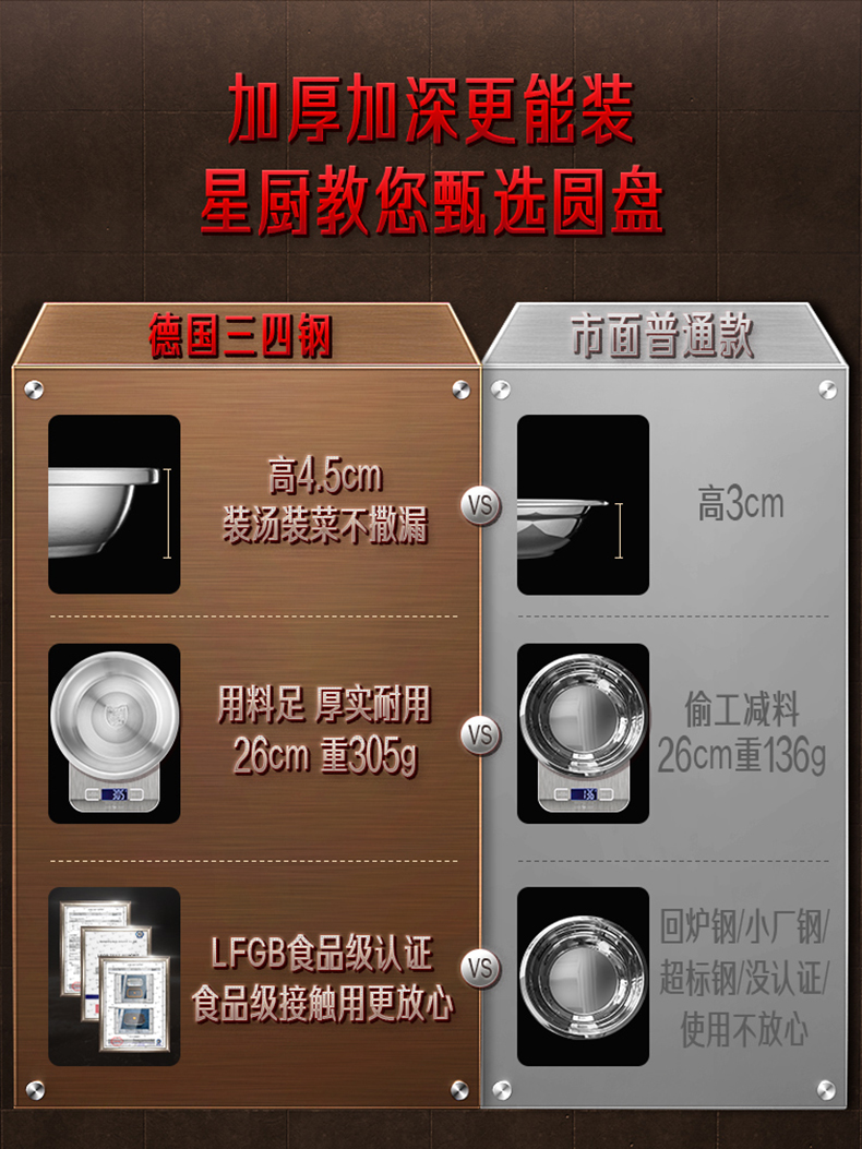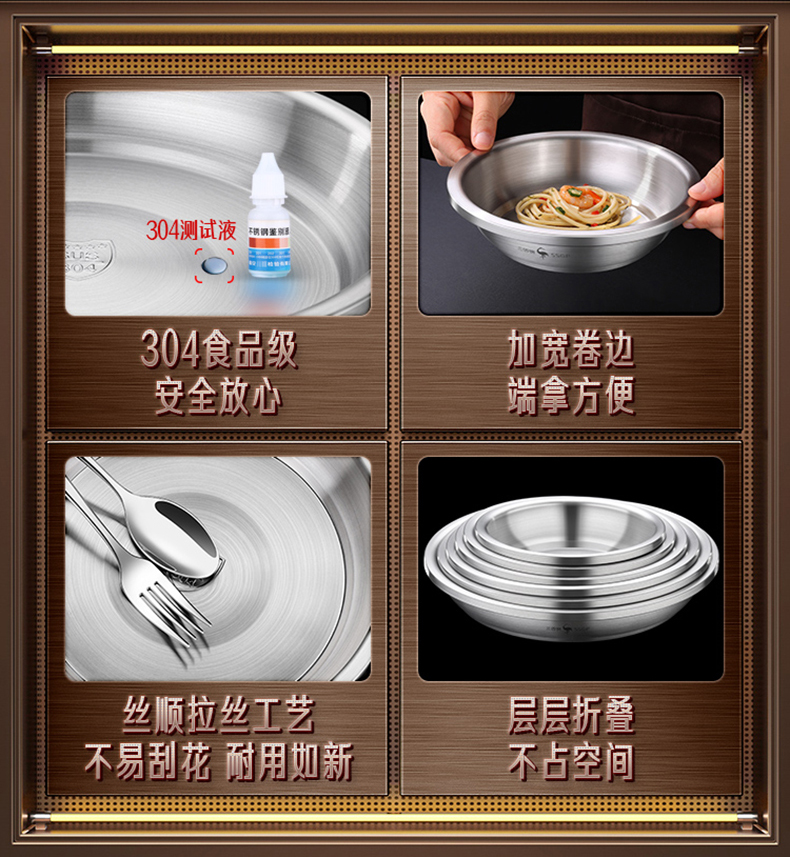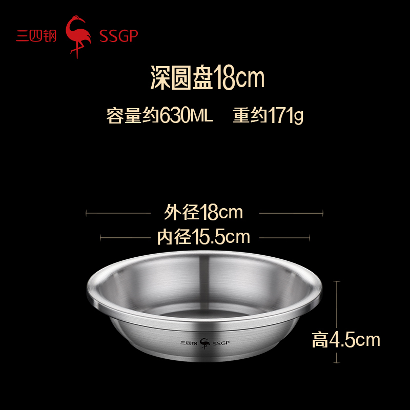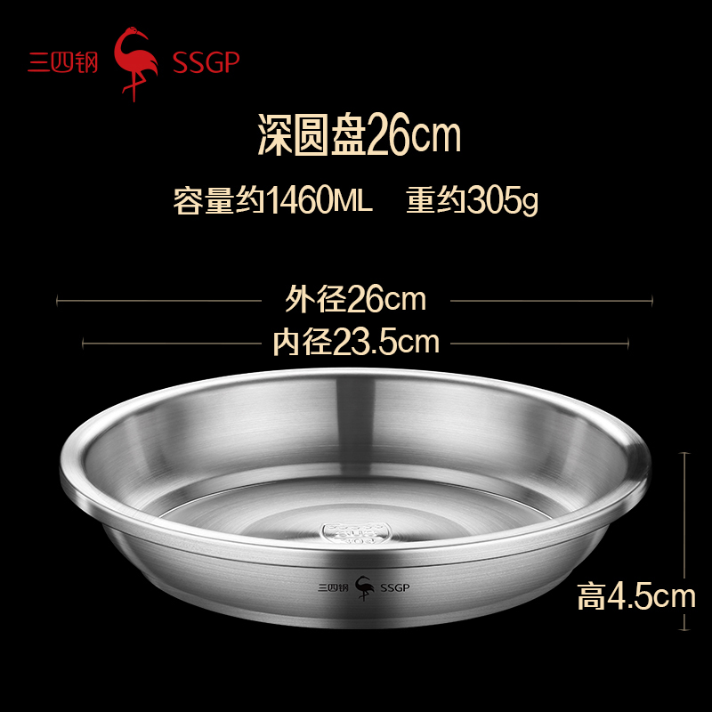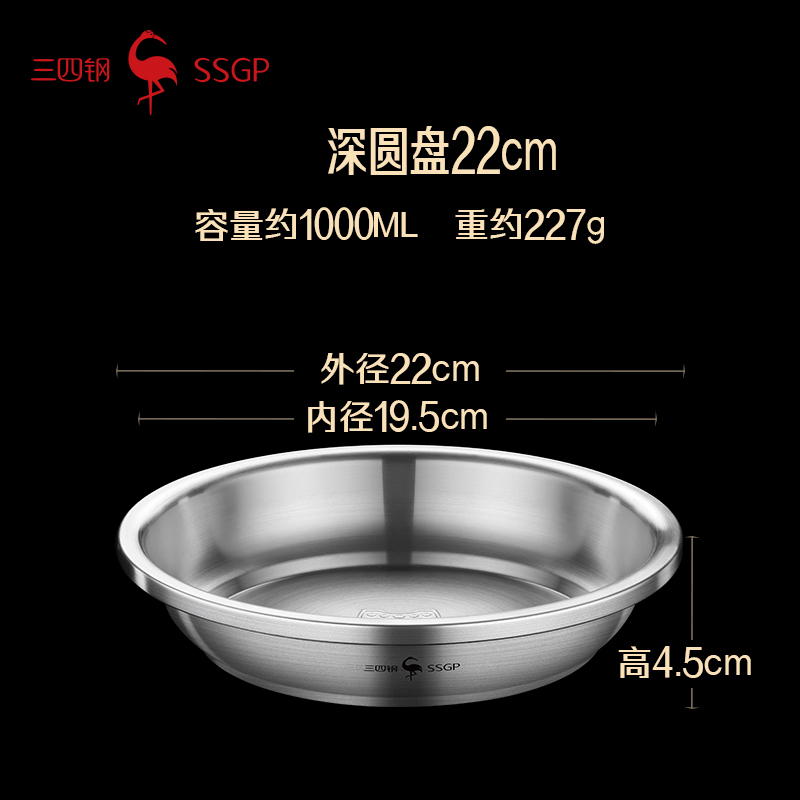 SSGP三四钢的深圆盘非常厚实有质感,用的是304不锈钢,一套就有6个,不同的尺寸满足不同的需求,还可以叠起来放,一点都不占空间,而且比较深,花爸用来装水果蔬菜、装饭菜汤都没有问题。