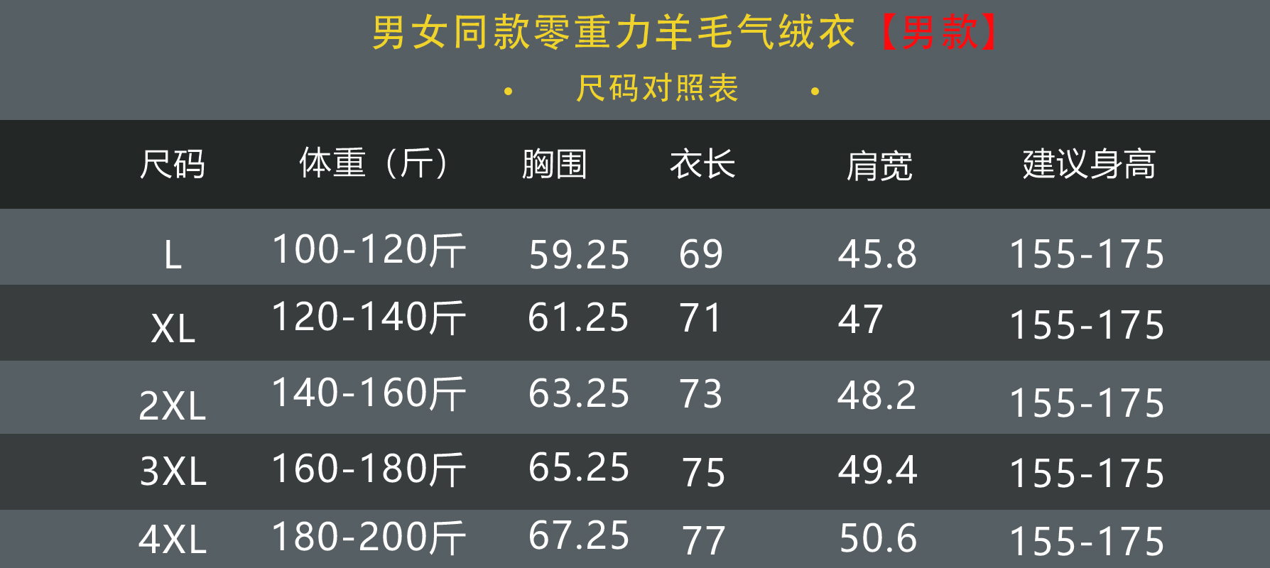 男款:L 100-120 XL 120-140 2XL 140-160 3XL 160-180 4XL 180-200