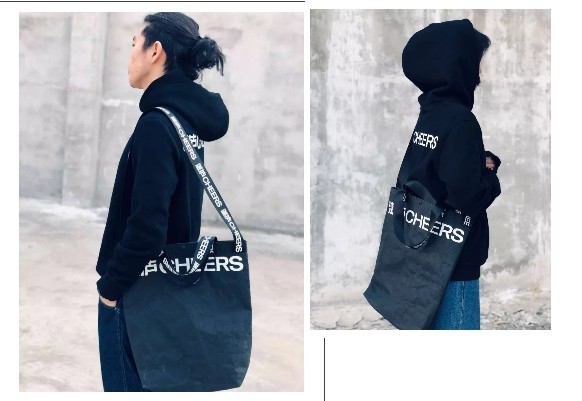 论材质,是由苹果曾用过的水洗牛皮纸剪裁而成,搭配汽车安全带同样材质的背带。