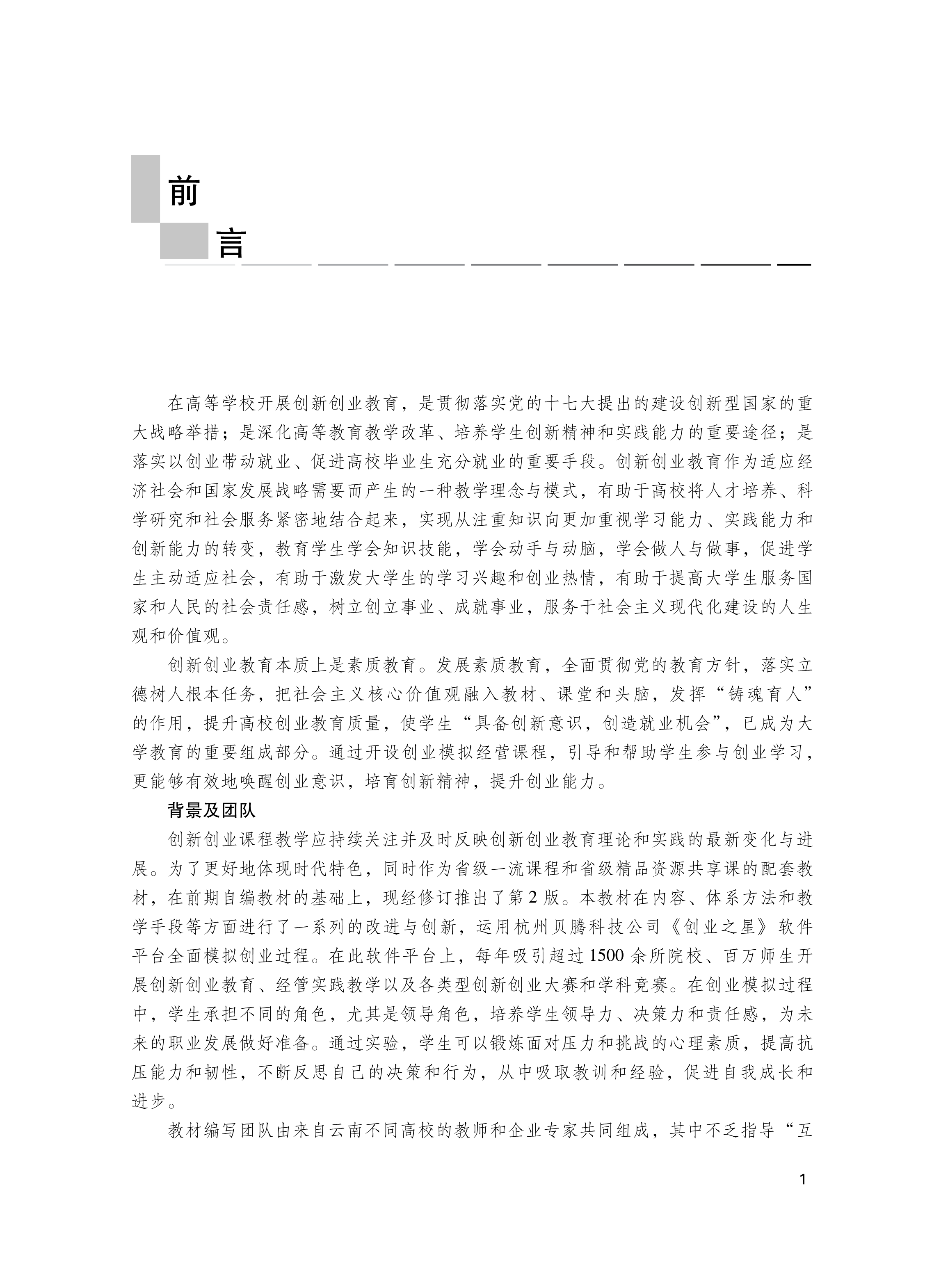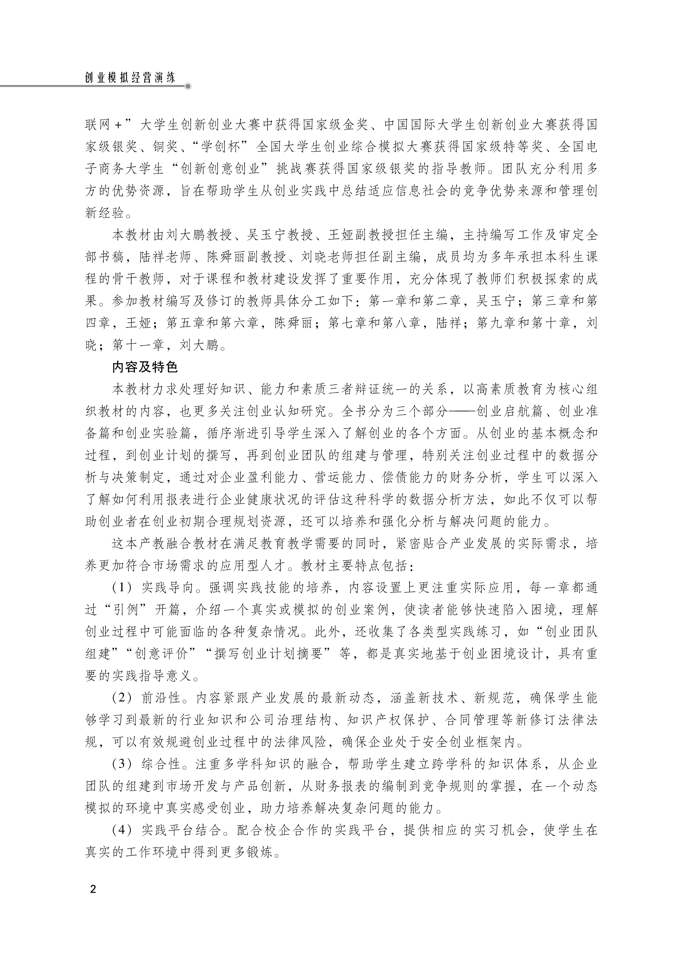 本教材具有四个方面的特色:(1)实践导向。强调实践技能的培养,内容设置上更注重实际应用,每一章都通过“引例”开篇,介绍一个真实或模拟的创业案例。(2)前沿性。内容紧跟产业发展的最新动态,涵盖新技术、新规范。(3)综合性。注重多学科知识的融合,帮助学生建立跨学科的知识体系,在一个动态模拟的环境中真实感受创业。(4)实践平台结合。配合校企合作的实践平台,提供相应的实习机会,使学生在真实的工作环境中得到更多锻炼。
