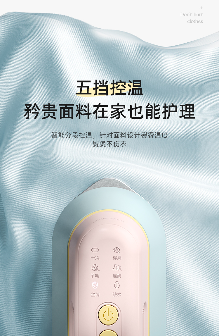 2、【沙龙级•熨烫】:智能五挡分段控温,熨烫不伤衣,针对不同衣物面料,一键选择即可;