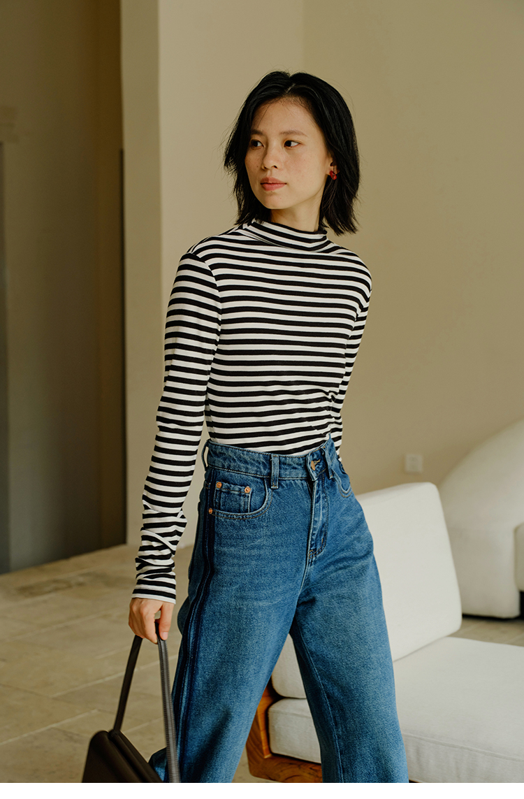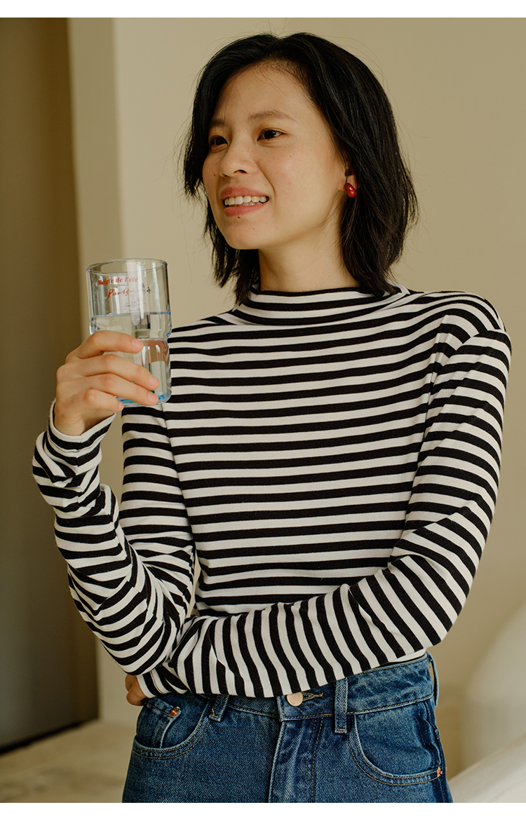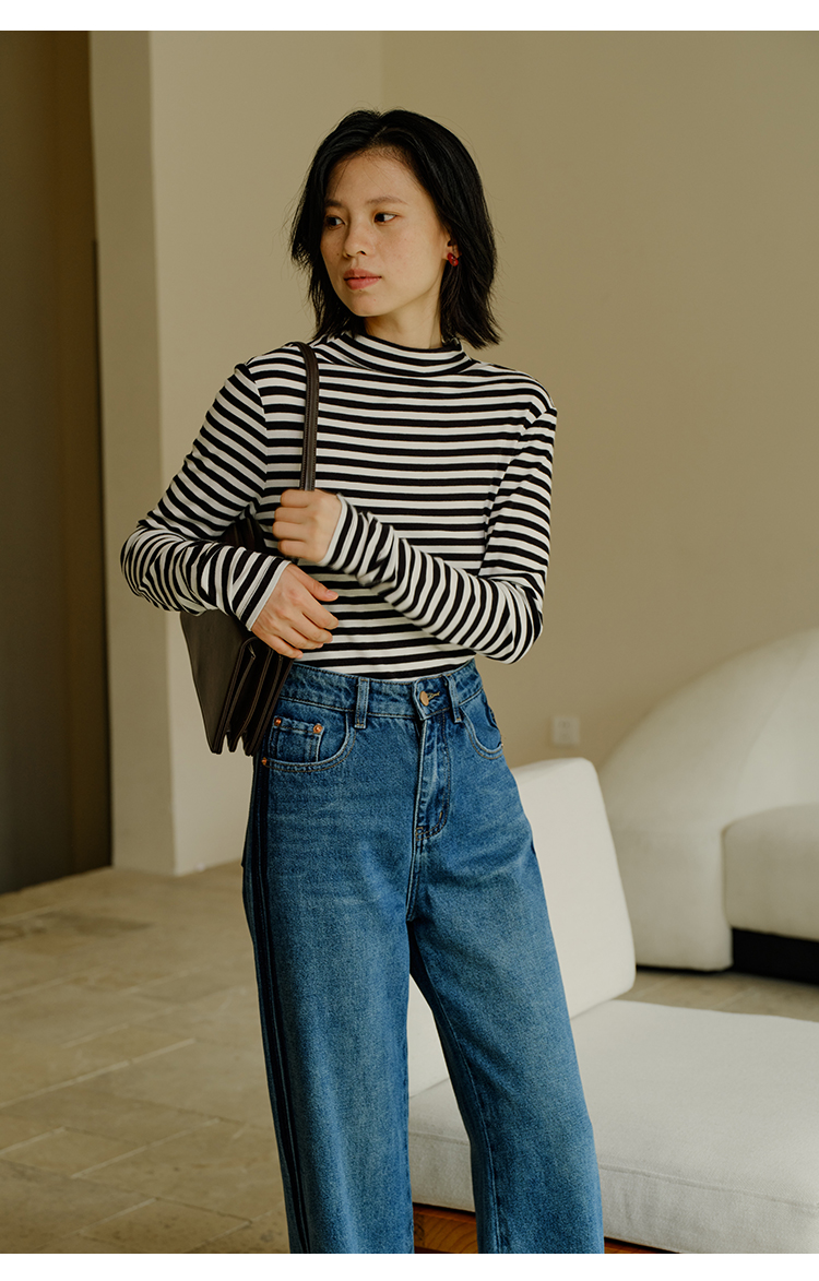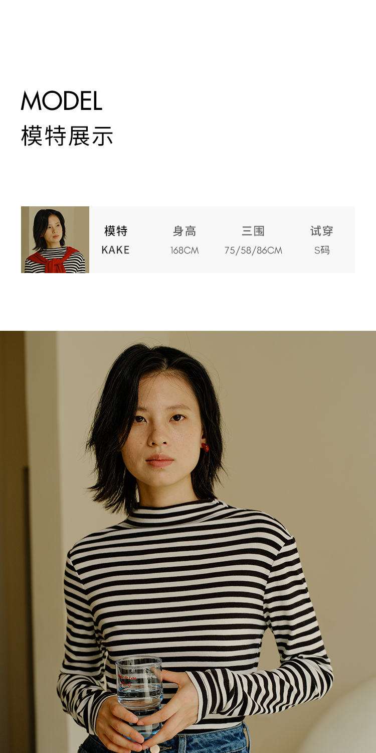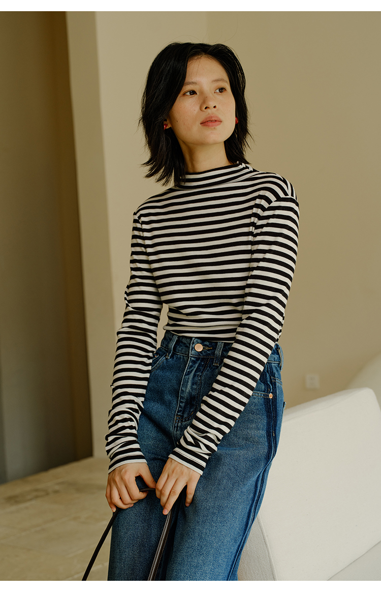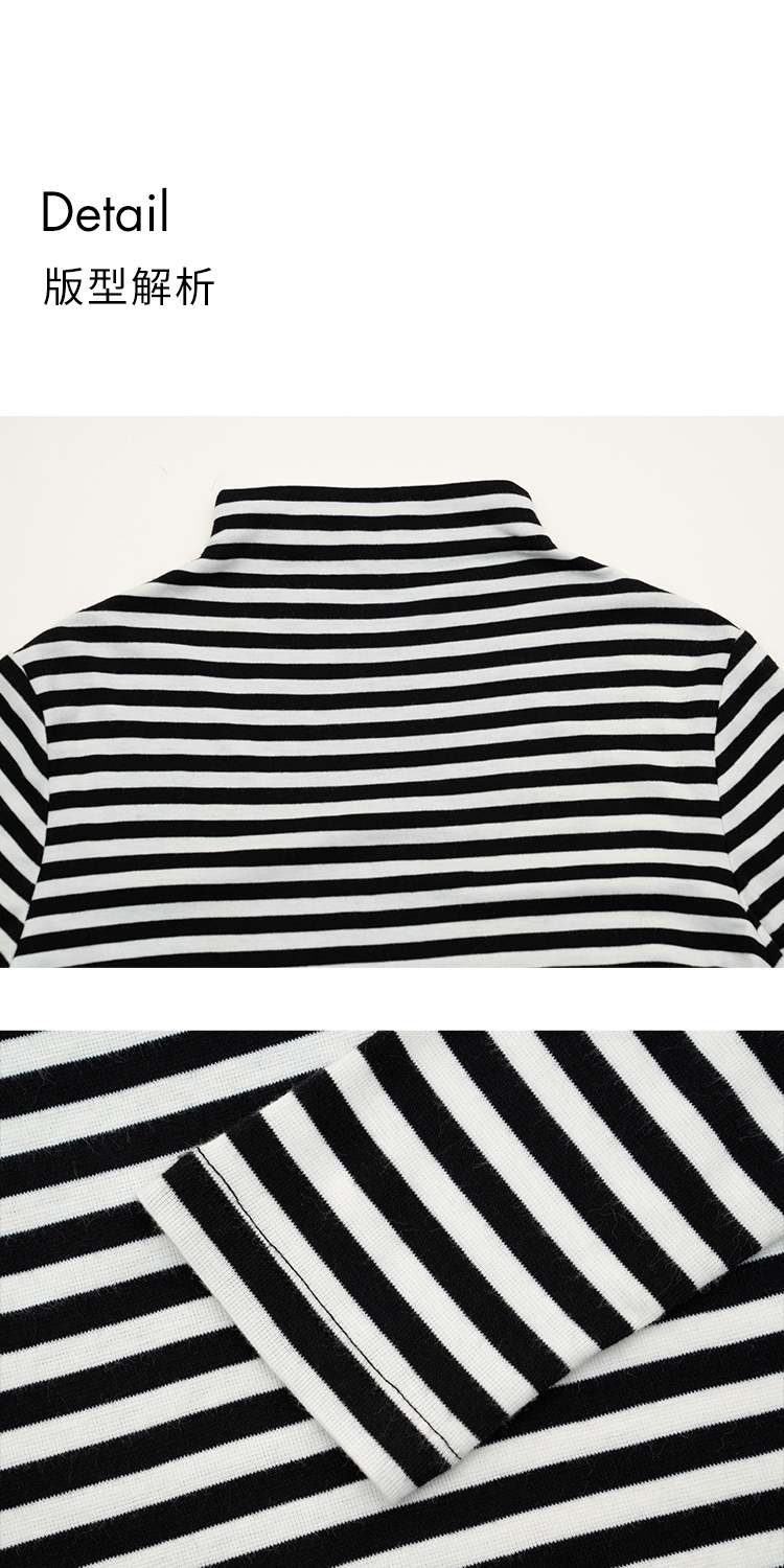Heydress黑白条纹针织衫女秋季高领打底衫复古修身显瘦百搭上衣