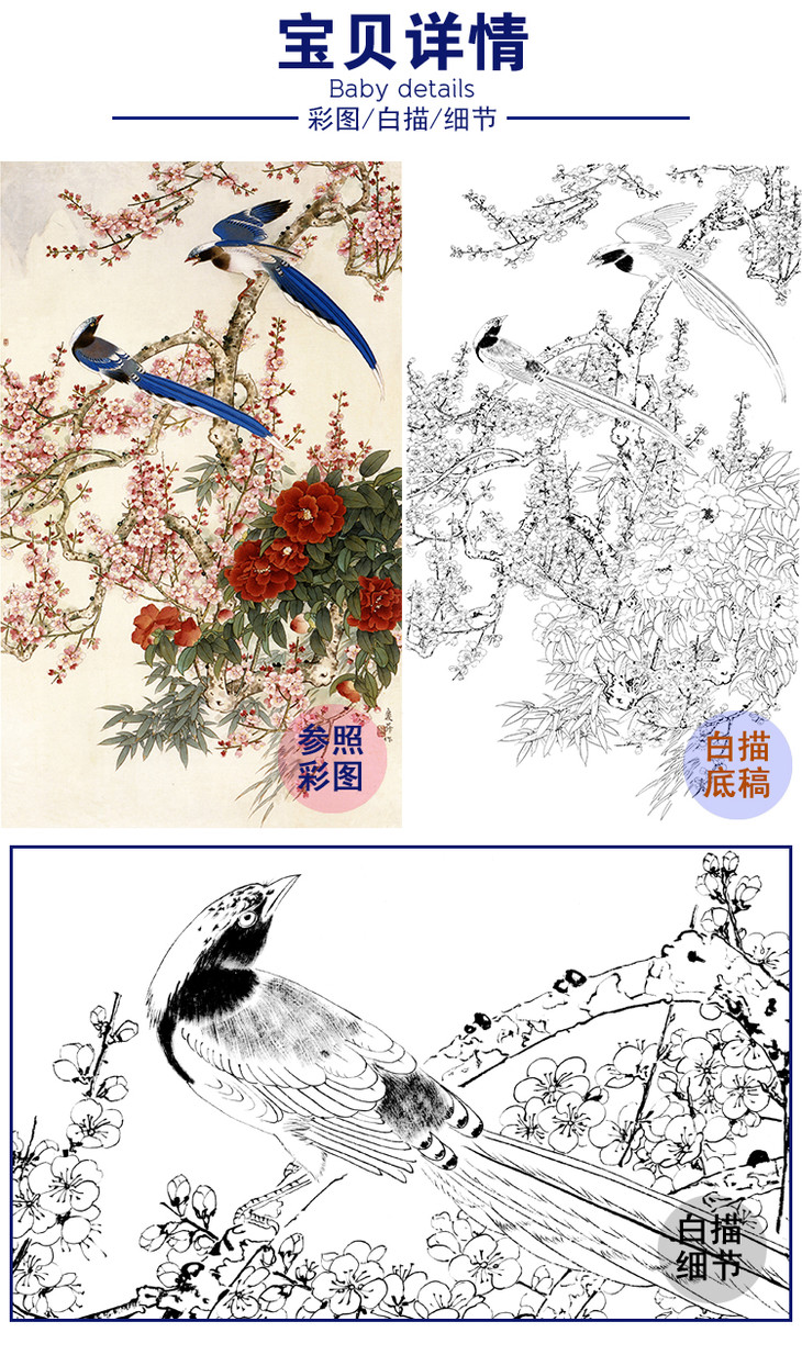 竖幅工笔花鸟白描底稿-王庆升梅花蓝鹊-RT02