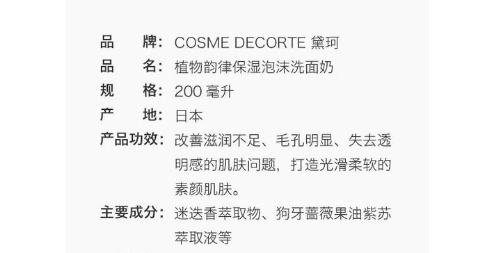 【门店直发 支持同城配送】COSME DECORTE 黛珂 植物韵律保湿泡沫洗面奶 200毫升