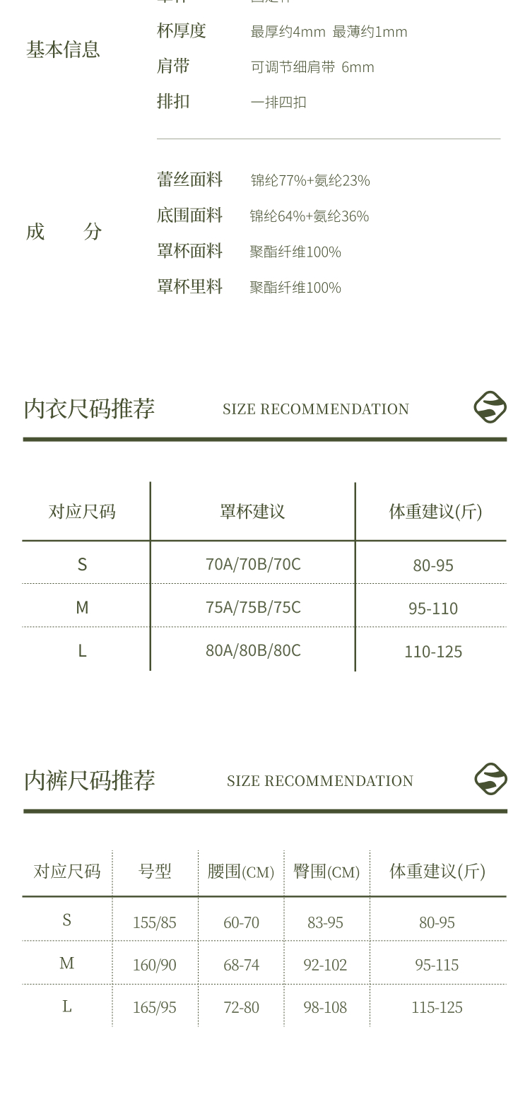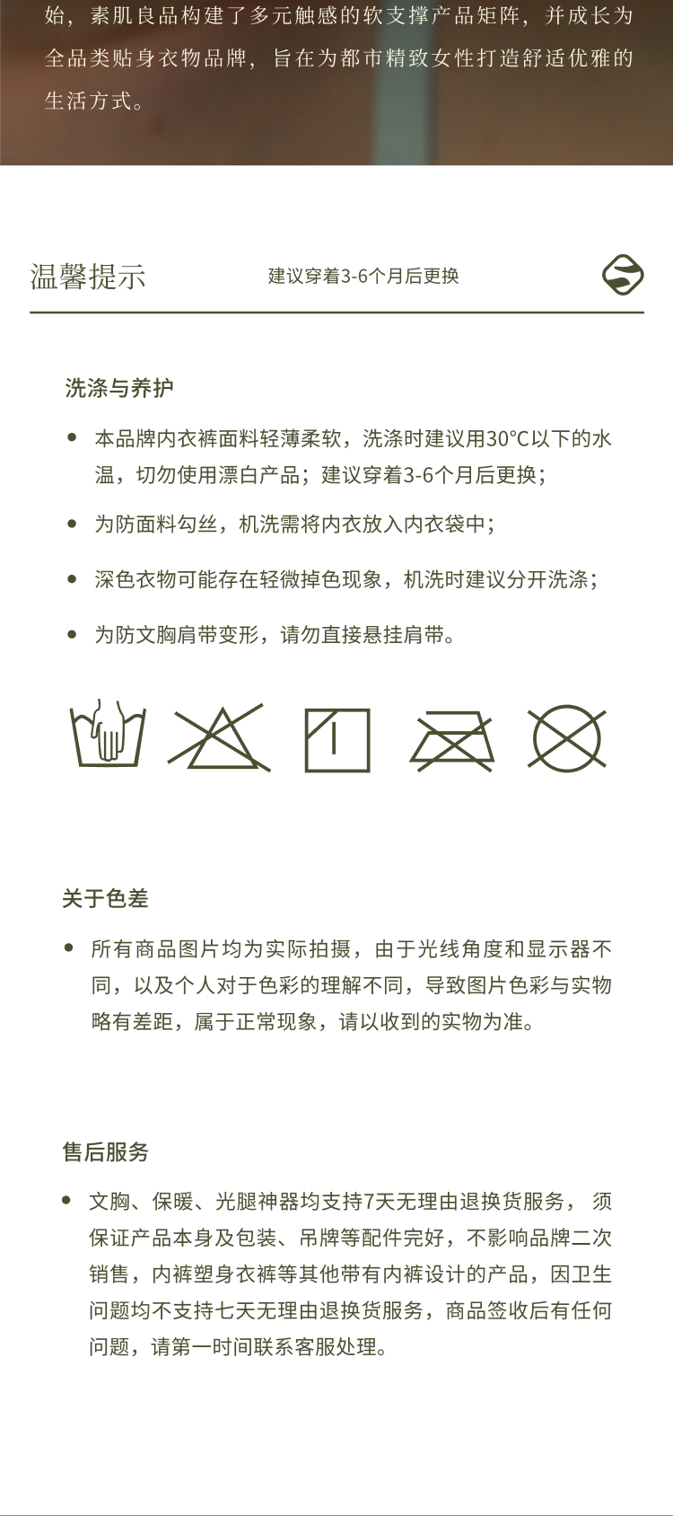 退换货规则:1.7天无理由退换货规则:品牌产品为贴身私密性衣物,务必保证所退产品吊牌水洗标齐全,无人为因素导致的破损、污渍、异味等影响二次销售的状况,否则,品牌有权不予退货退款,退货请将赠品一同寄回。内裤不支持7天无理由退换。换货差价将遵循多退少补的原则。