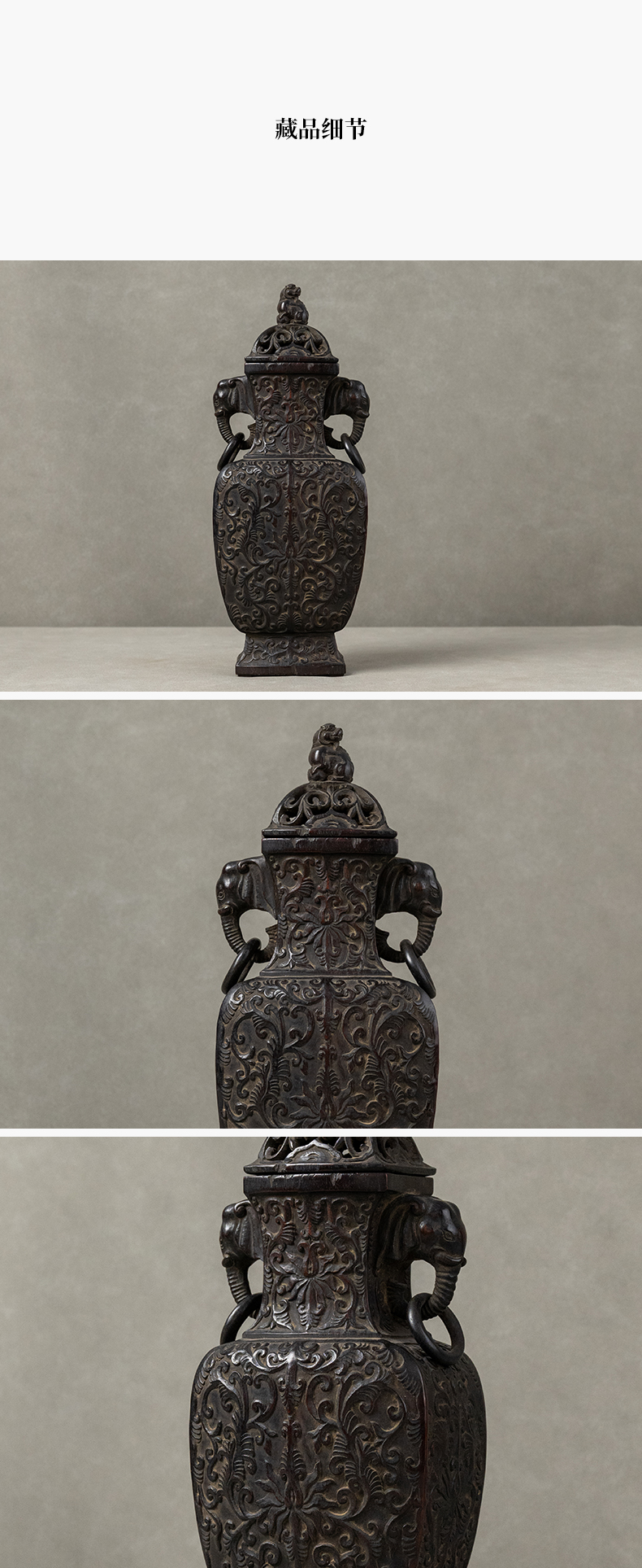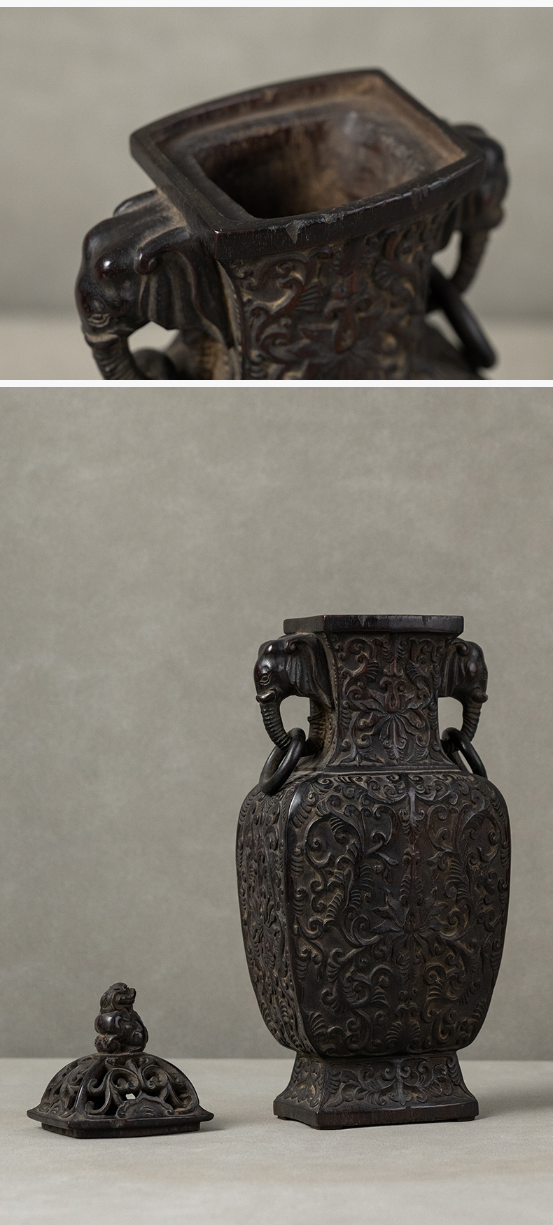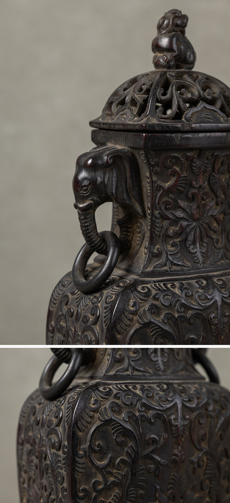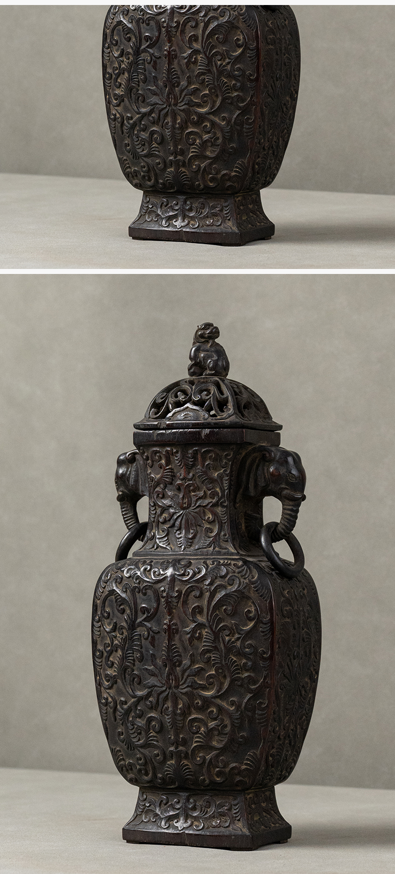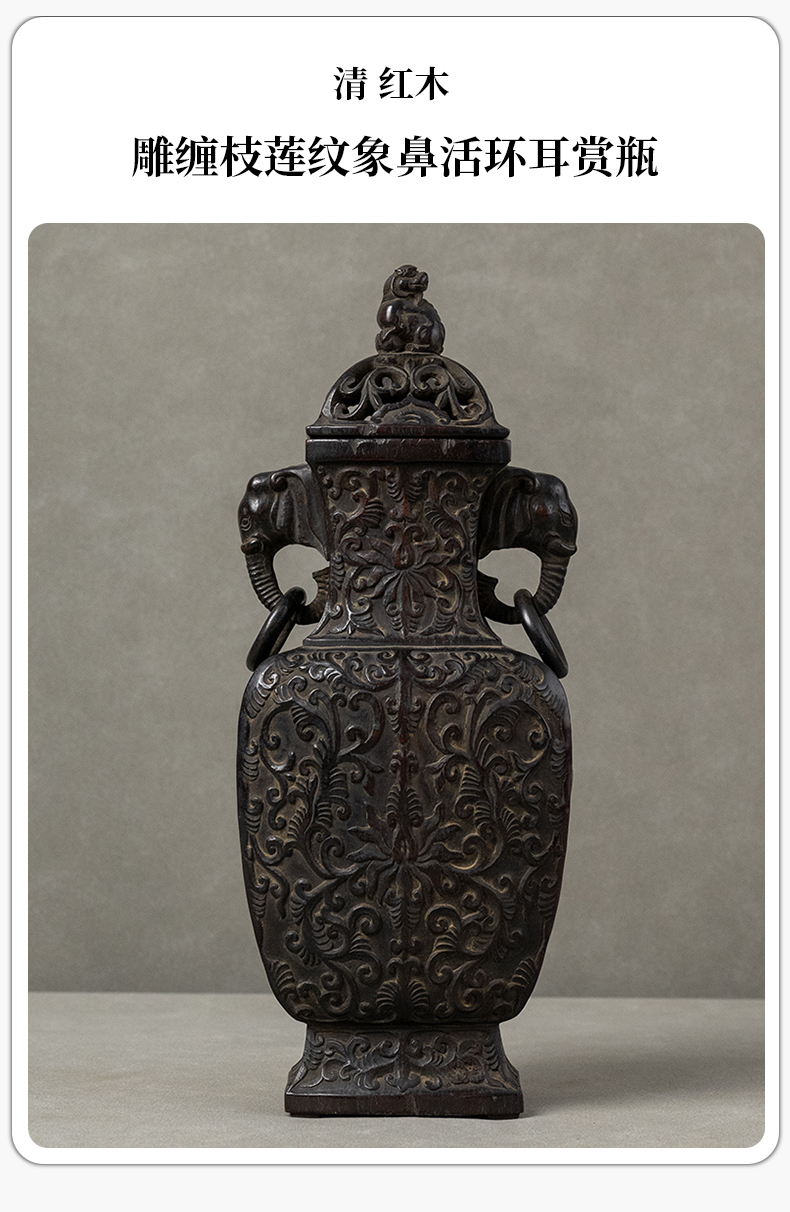 清 红木雕缠枝莲纹象鼻活环耳赏瓶