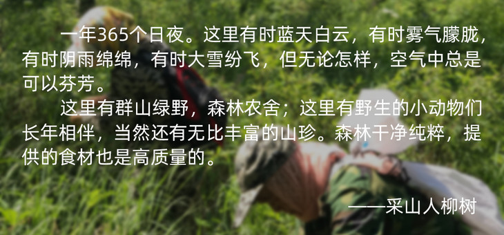 大自然是慷慨的,但采山的工作全凭天意,大自然给什么他们采什么,靠着两条腿在森林里穿梭。他们这群采山人有个原则:适度采摘,采摘的品种是数量多、采摘后不影响繁育的种类。不破坏本土生态环境,老天给什么采什么,可持续采山。