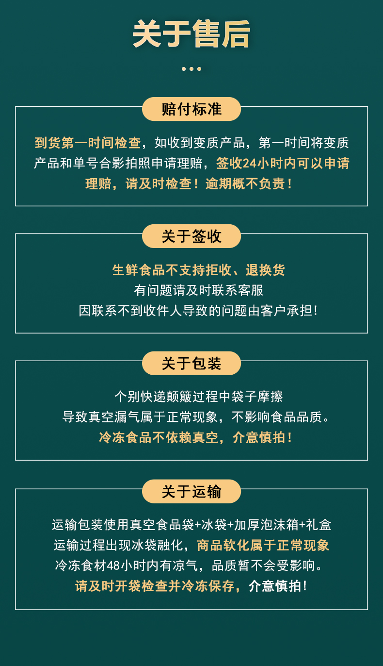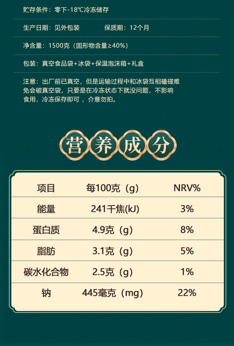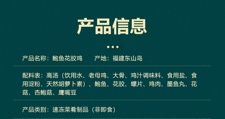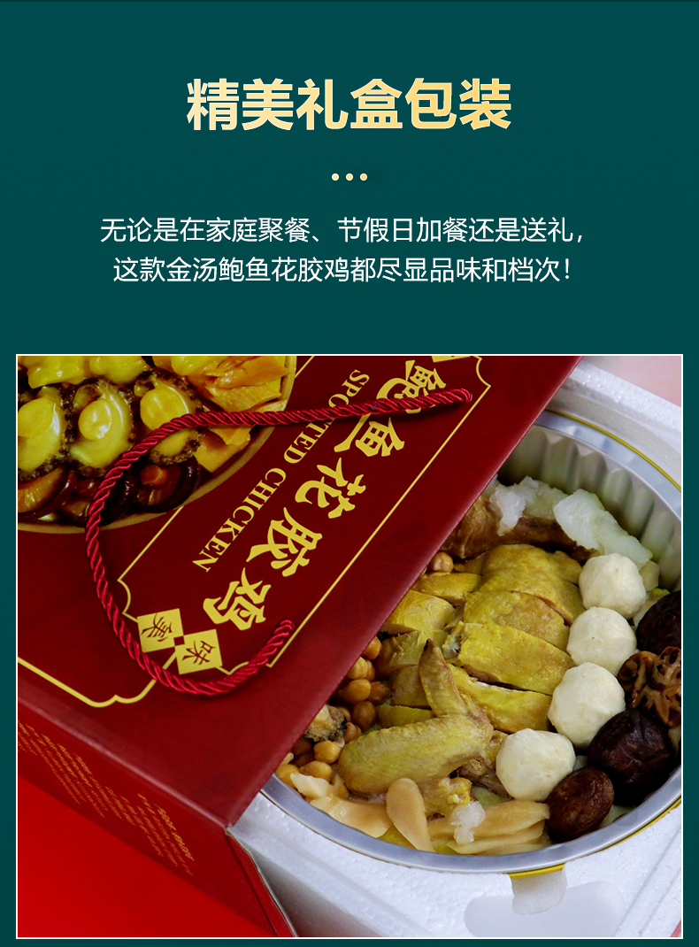 品名:东山岛鲍鱼花胶鸡 规格:1500g鲍鱼花胶鸡礼盒(固形物含量≥40%);拍几份发几个包裹,不一定能同时到达,请耐心等待 配料:(饮用水、老母鸡、大骨、鸡汁调味料、食用盐、食用淀粉、天然胡萝卜)高汤、鲍鱼、花胶、螺片、鸡肉、墨鱼丸、花菇、杏鲍菇、鹰嘴豆; 发货地/产地:漳州 包装方式:盒装+冰袋+泡沫箱 物流信息:默认京东@顺丰快递,不支持指定快递 发货区域:西藏、新疆、内蒙、宁夏、甘肃、青海、甘肃、黑龙江、吉林不发; 物流详情:周六、周日及节假日除外,正常48小时内发货,到货时间约为2~5天,请耐心等待 售后说明:收到货后有质量问题,在24小时内都可以拍照(坏品+快递单面箱子一起拍)上传,申请按坏品比例理赔或联系客服,生鲜食品性质特殊,不支持7天无理由退换货;因地址错误,手机号联系不上,拒收等造成的损失无法售后,请理解; |