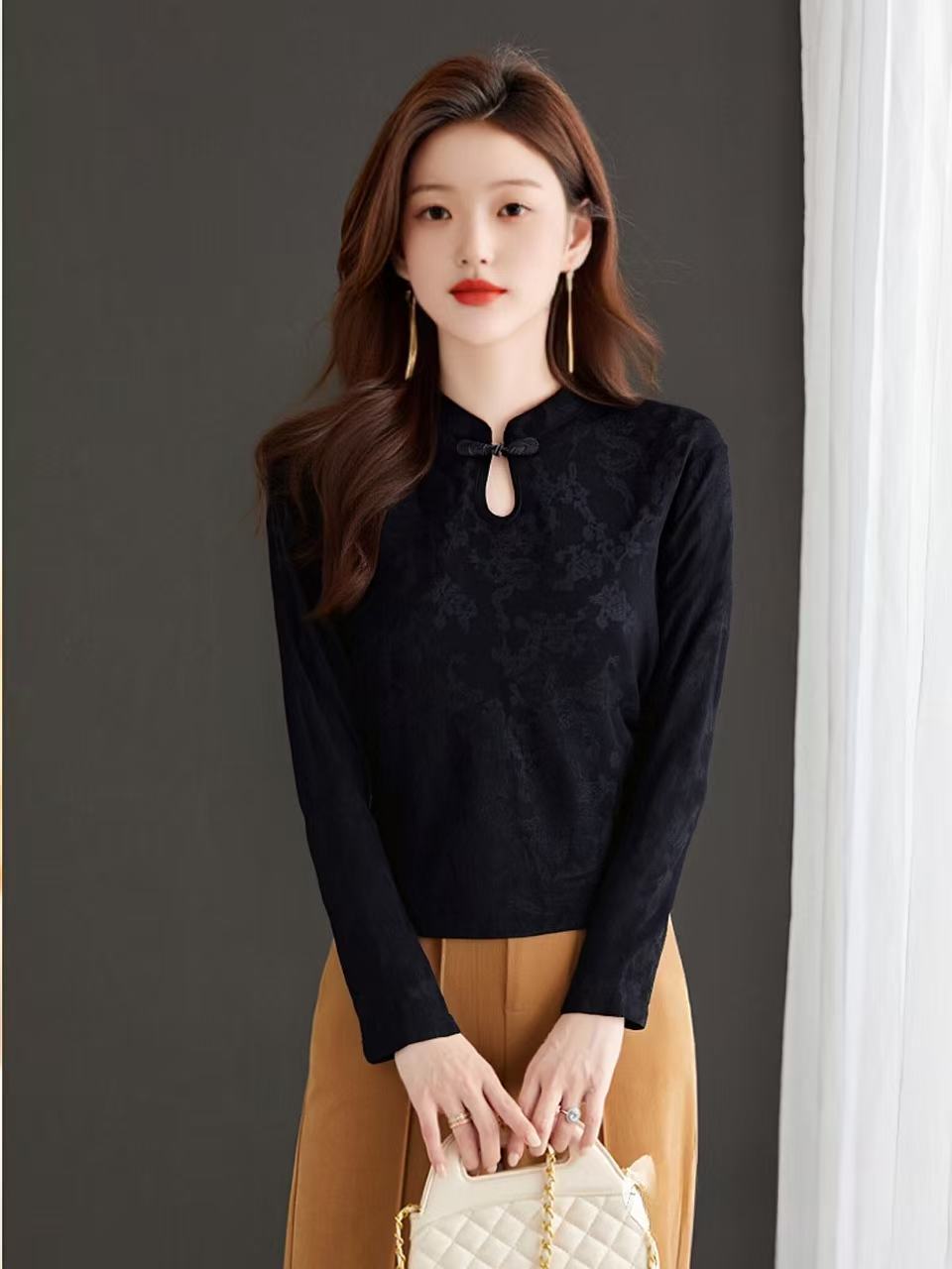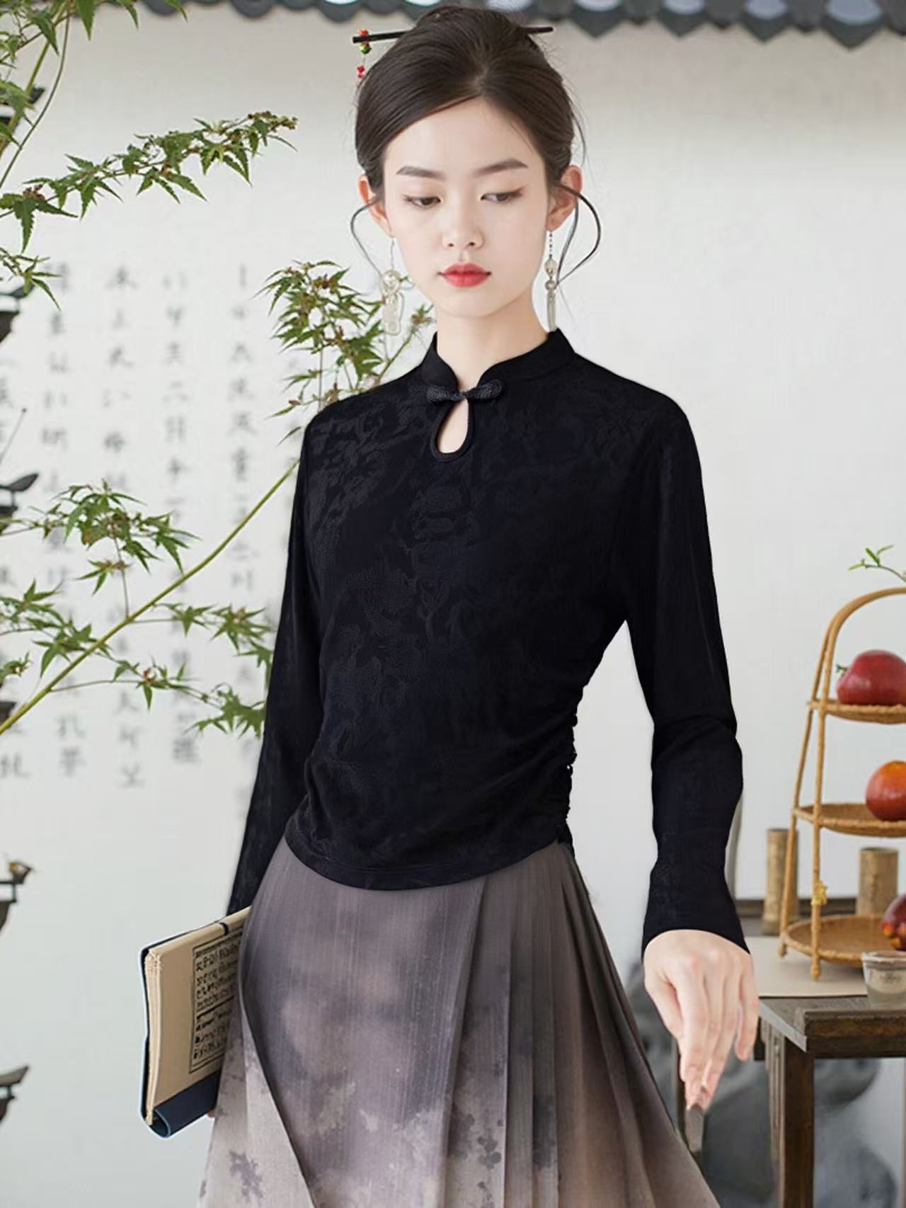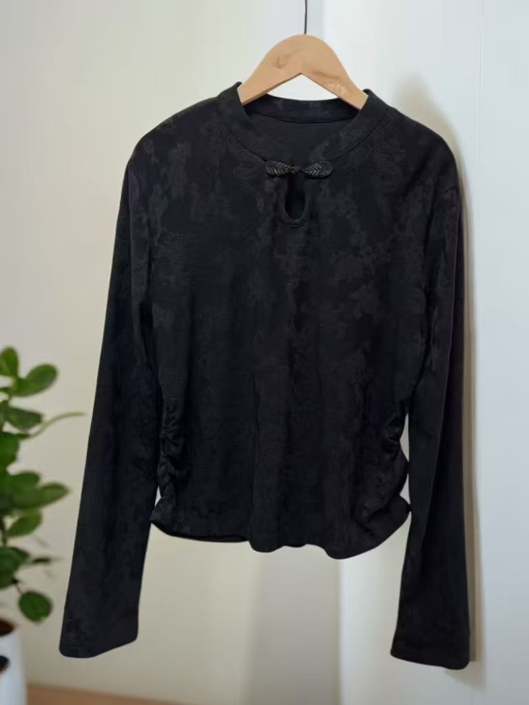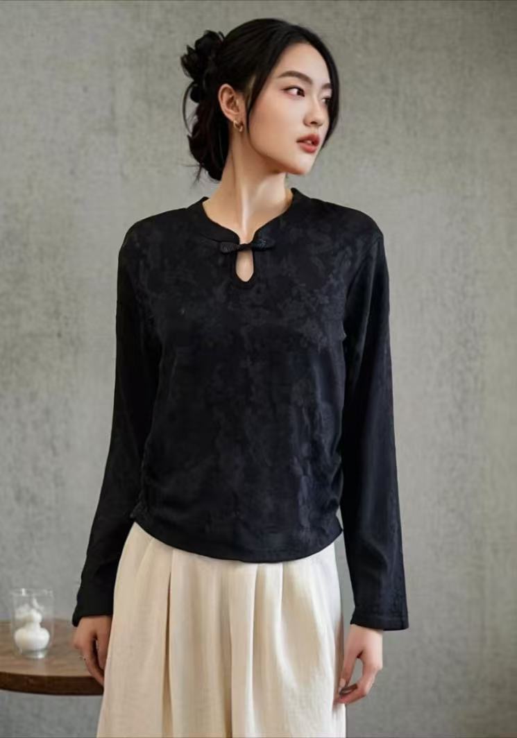 【秋上新】国风盘口镂空提花长袖小衫-喜出