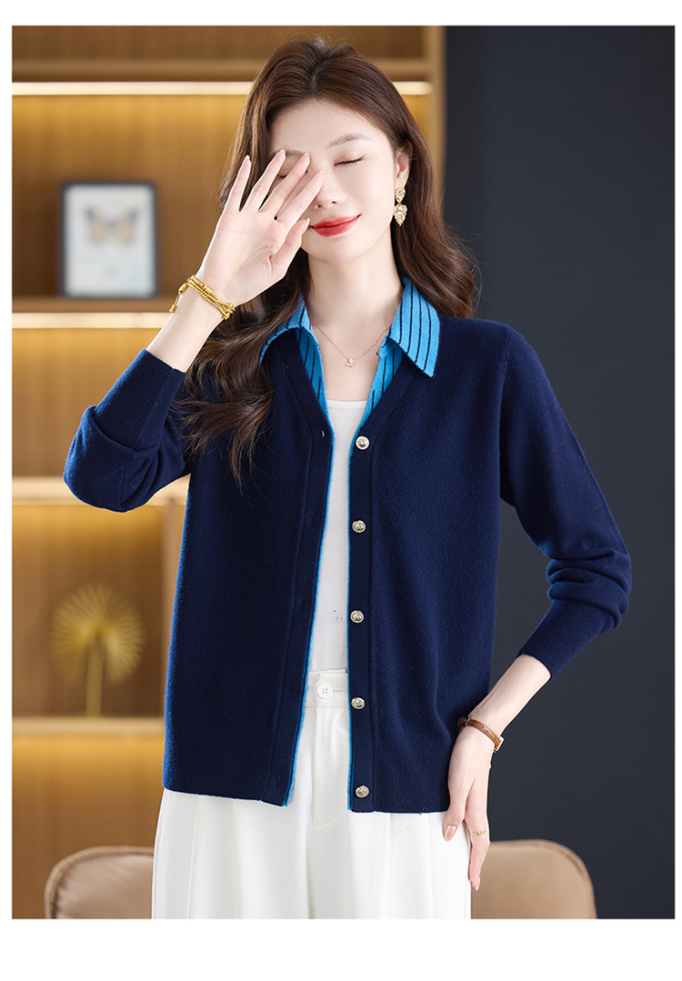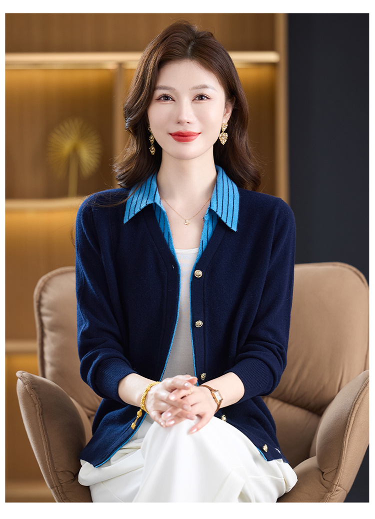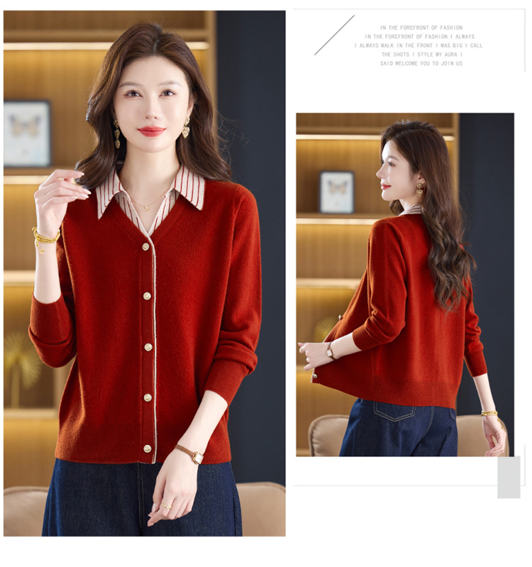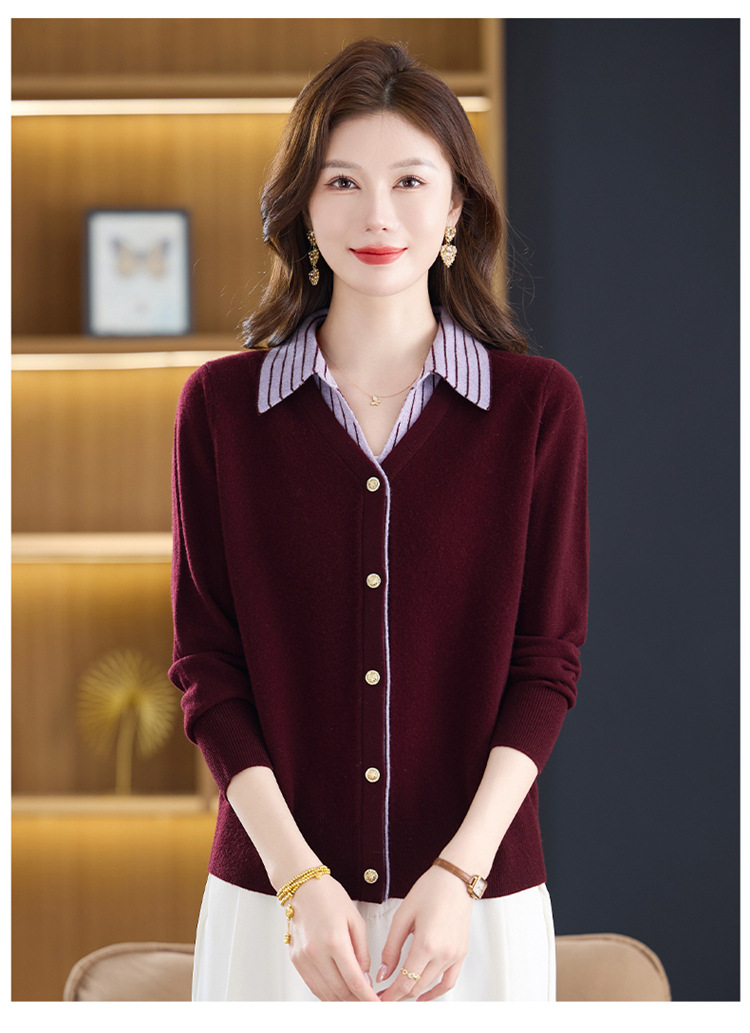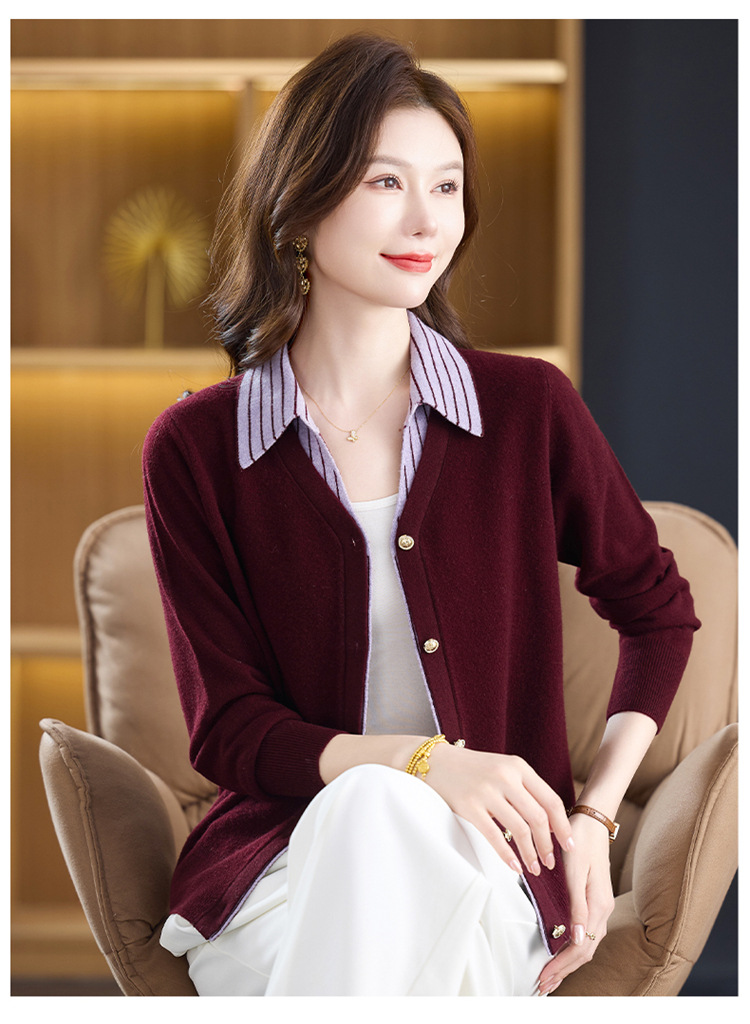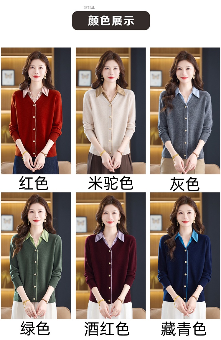 fgtt256789假两件100%纯羊毛针织开衫女春秋新款宽松显瘦妈妈装翻领毛衣外套 商品图0