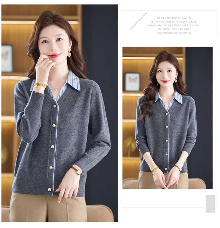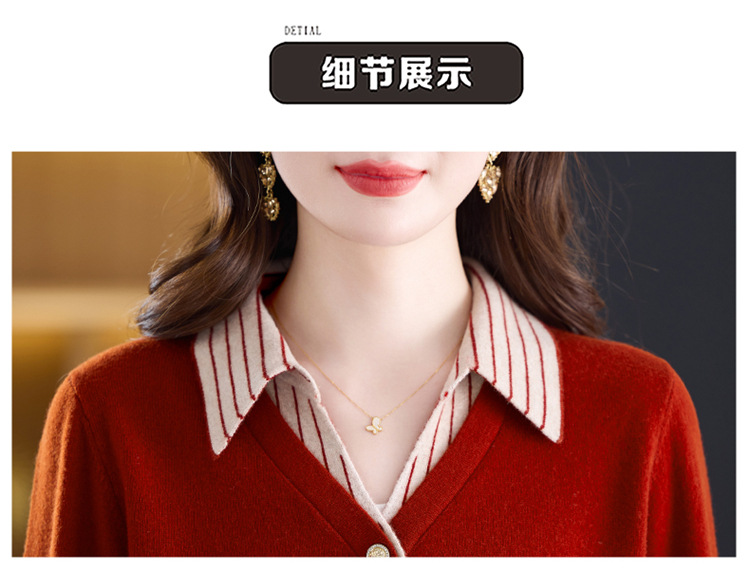 fgtt256789假两件100%纯羊毛针织开衫女春秋新款宽松显瘦妈妈装翻领毛衣外套 商品图2