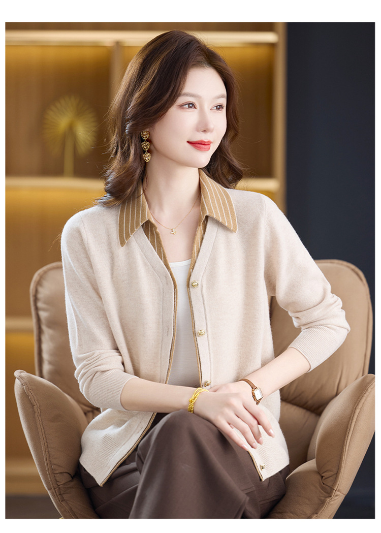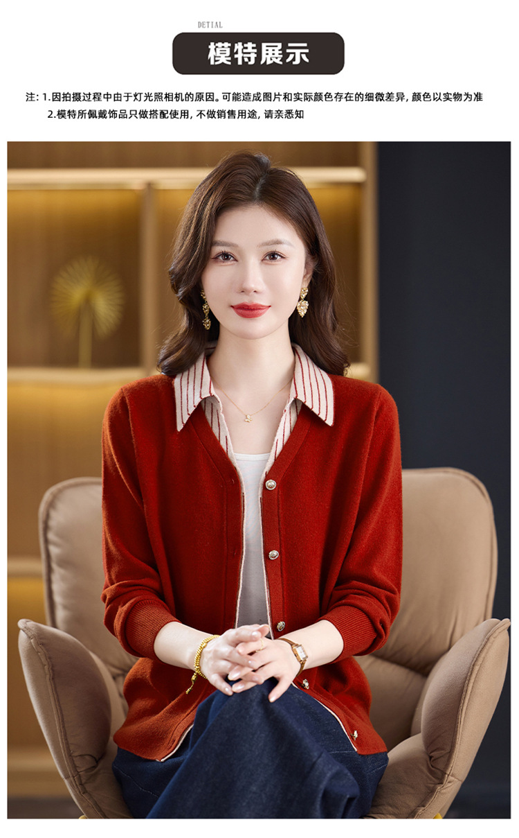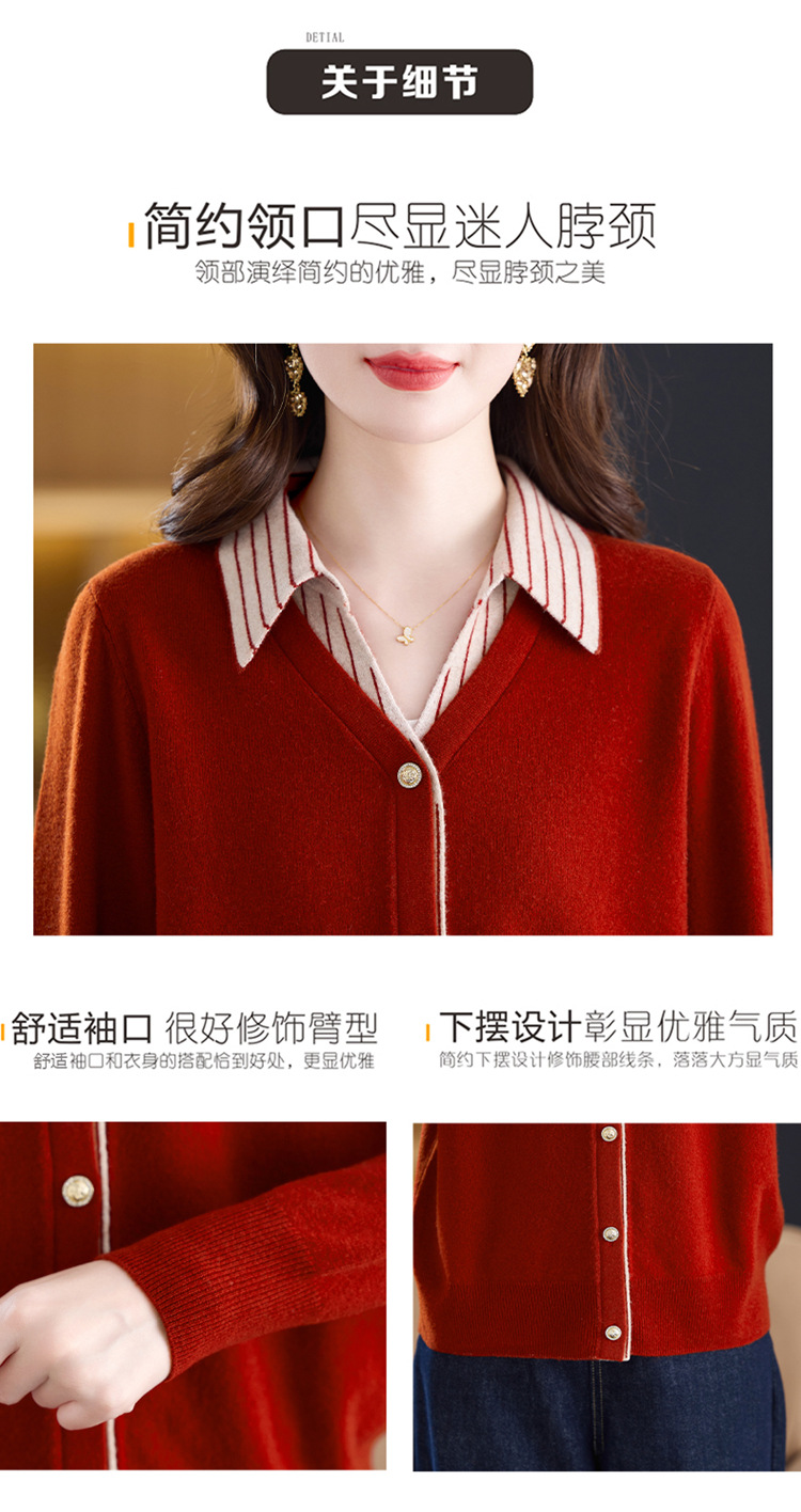 fgtt256789假两件100%纯羊毛针织开衫女春秋新款宽松显瘦妈妈装翻领毛衣外套 商品图4