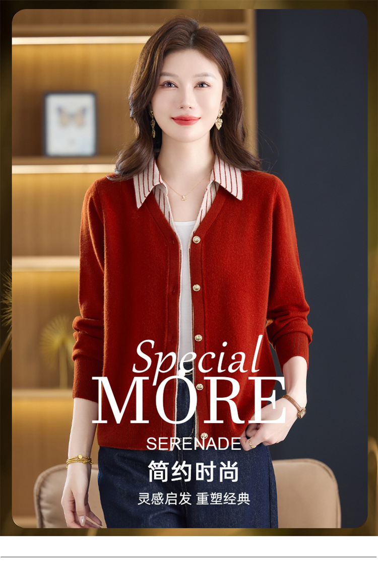 fgtt256789假两件100%纯羊毛针织开衫女春秋新款宽松显瘦妈妈装翻领毛衣外套 商品图1