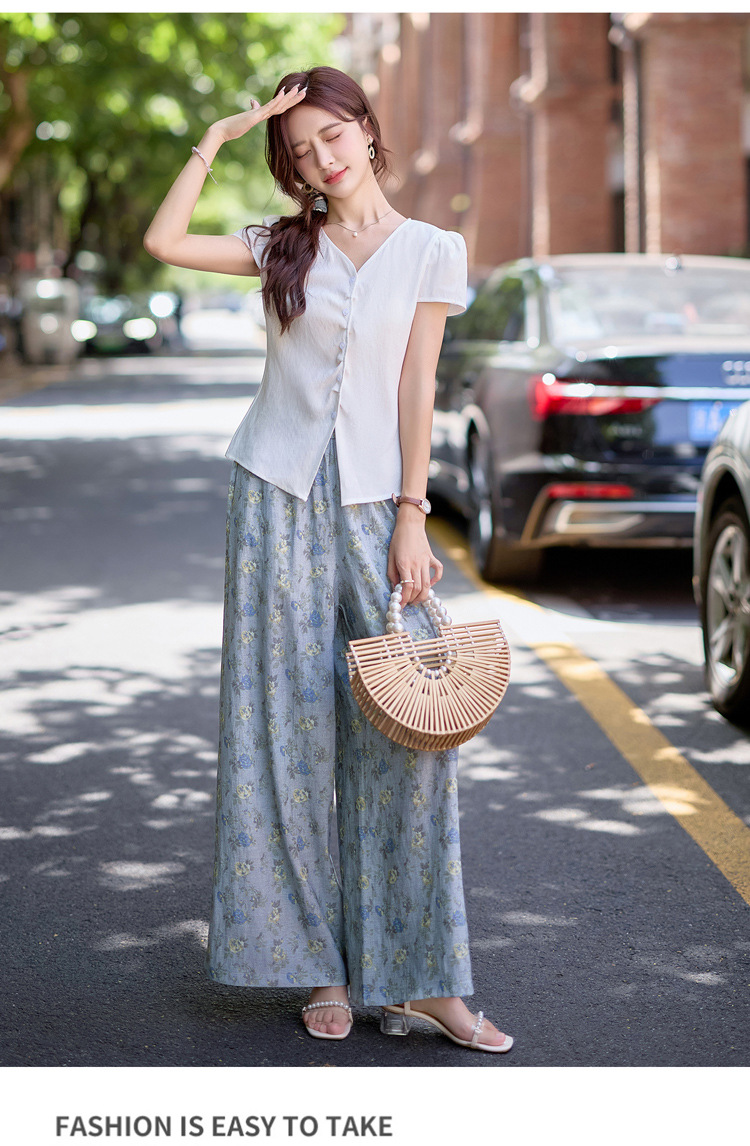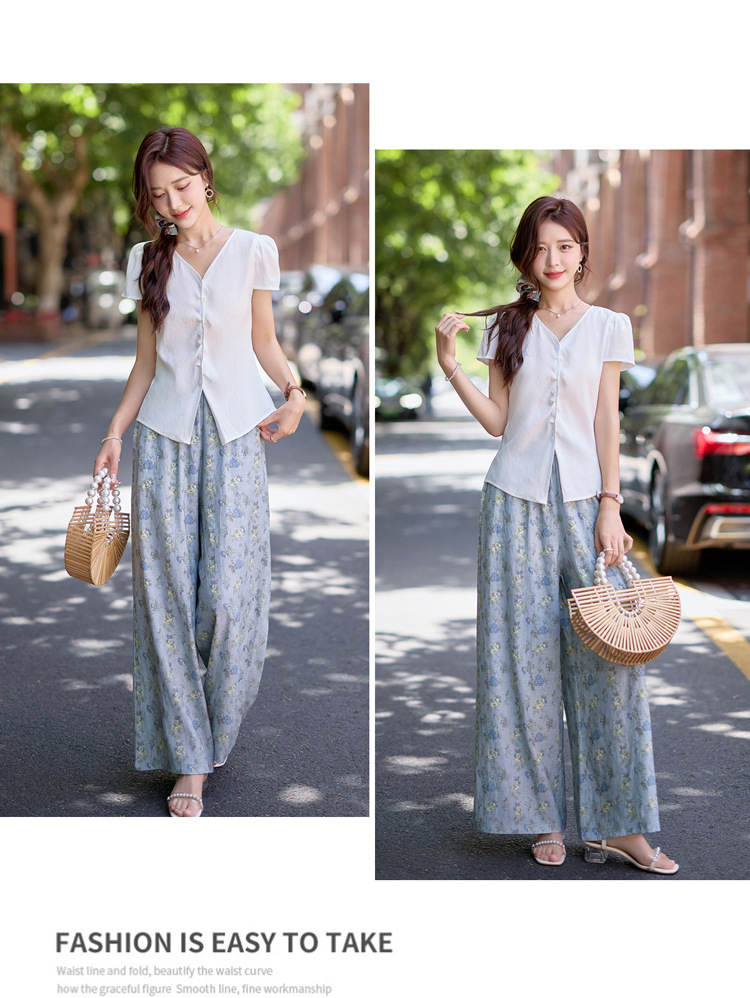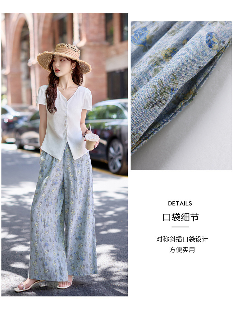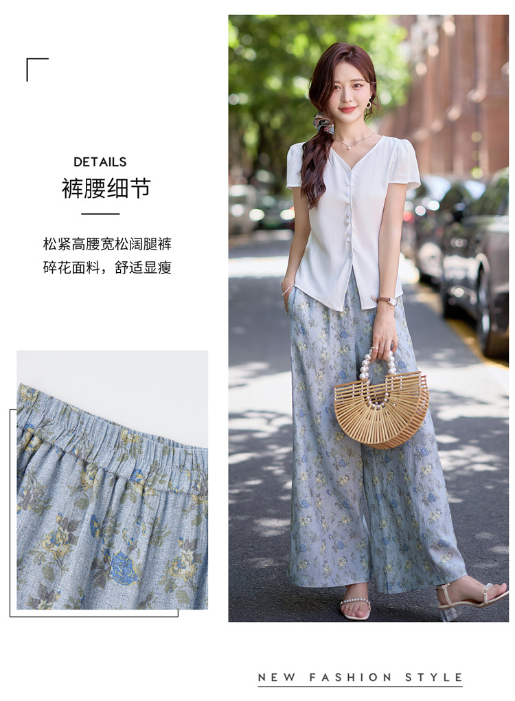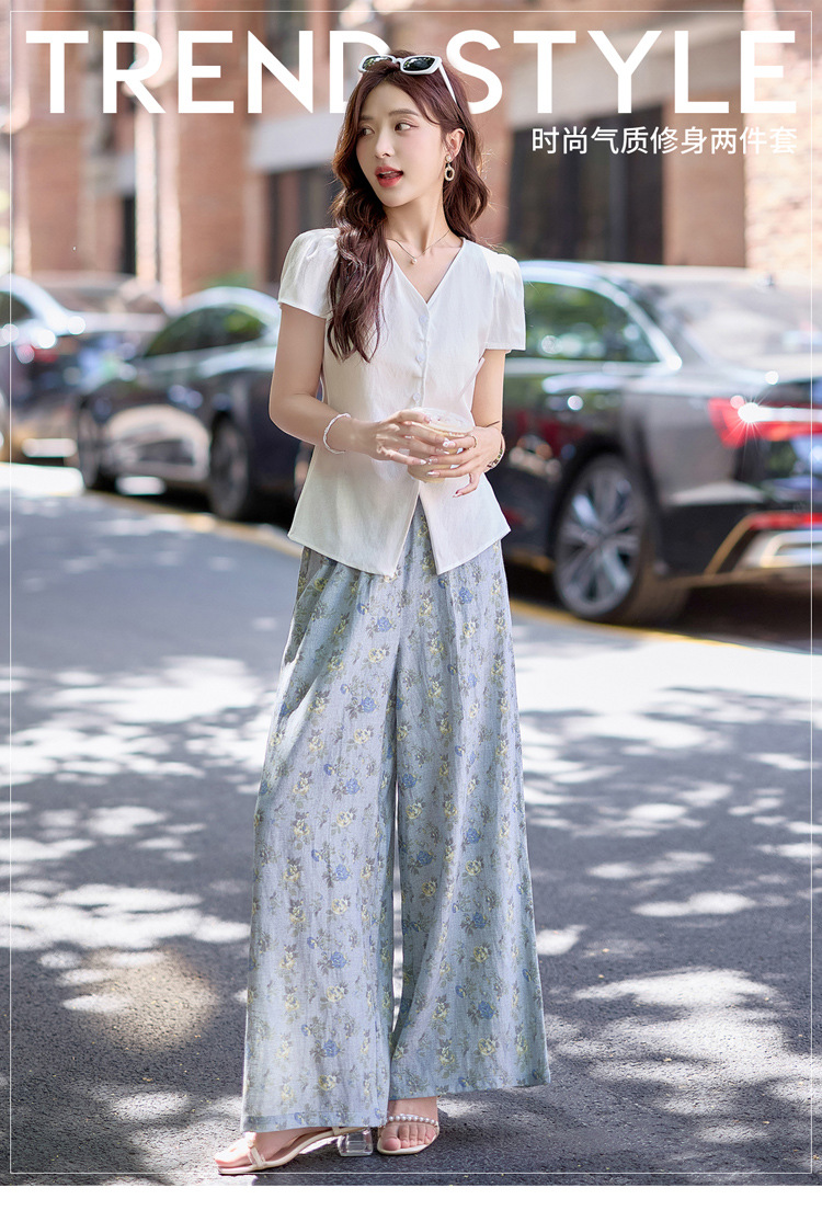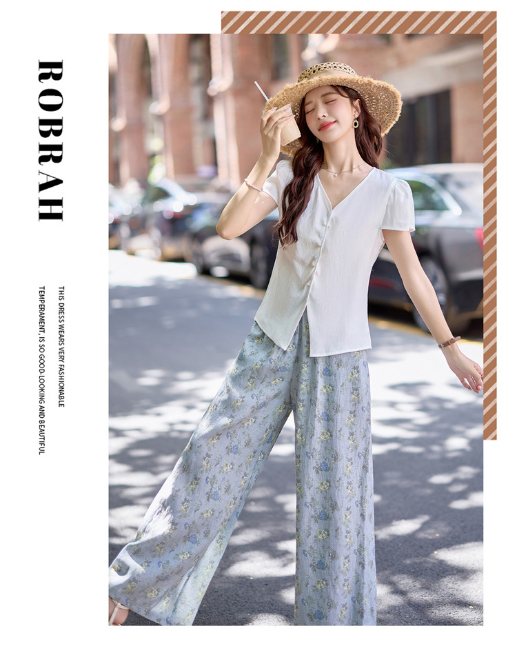 夏日绝美穿搭2025韩系气质抽褶短袖上衣温柔显瘦印花阔腿裤两件套 NSYY66136