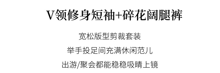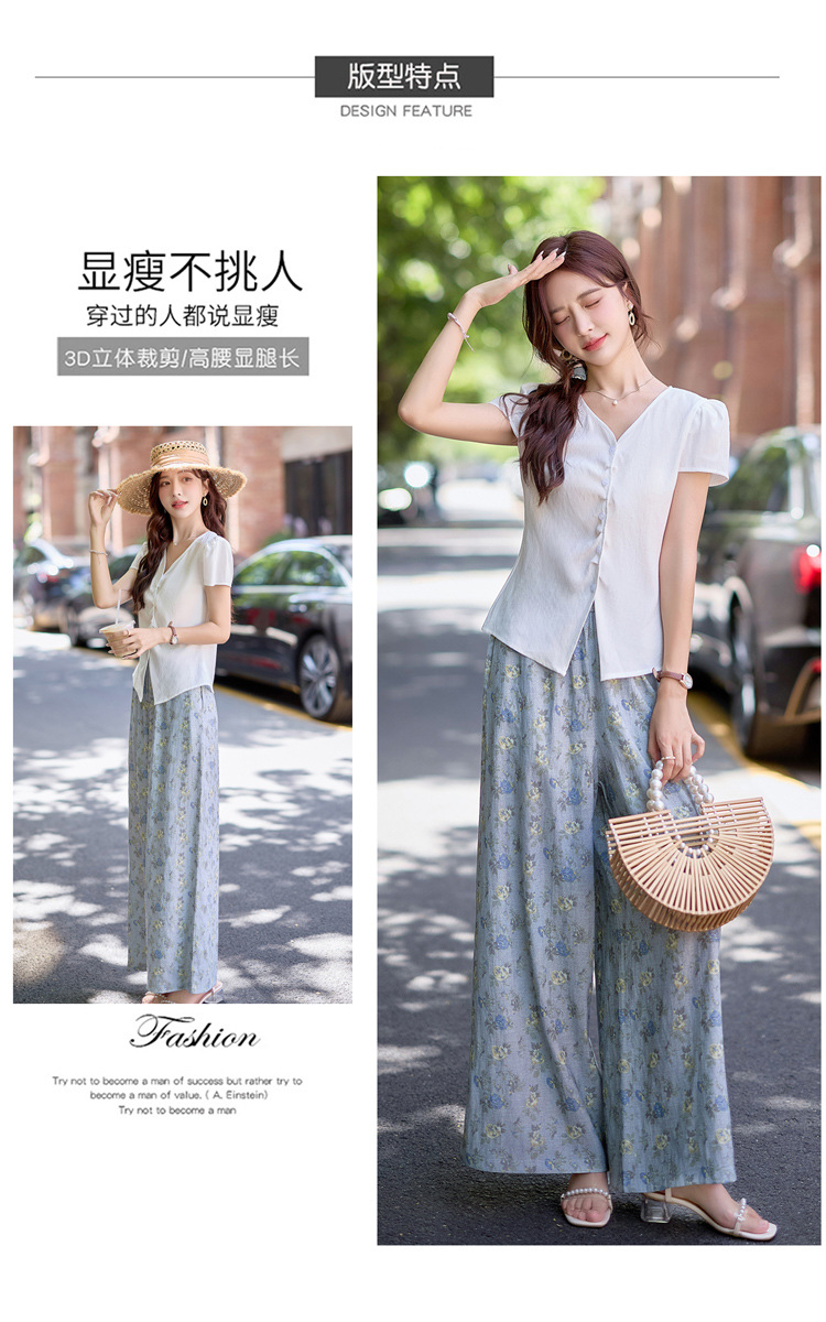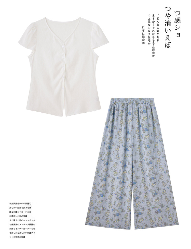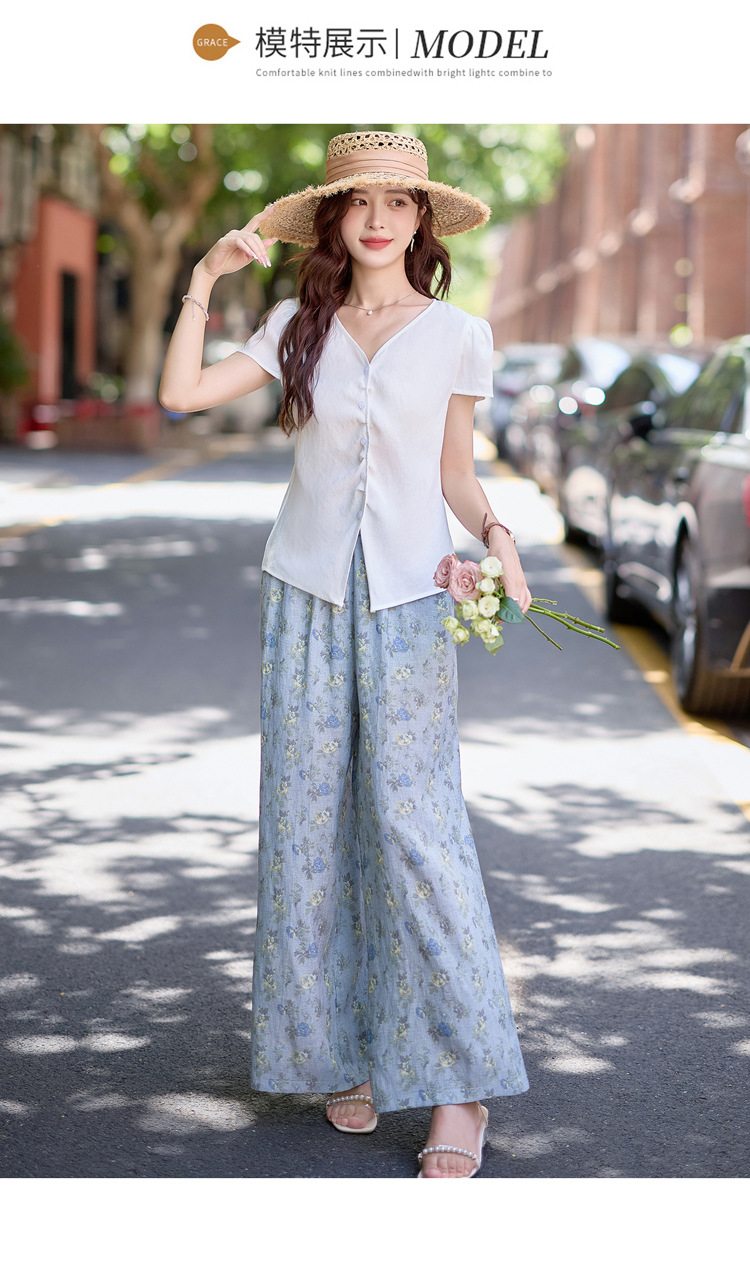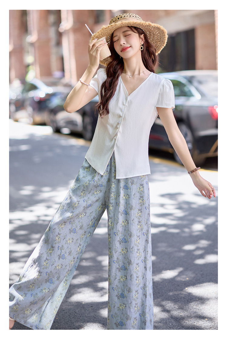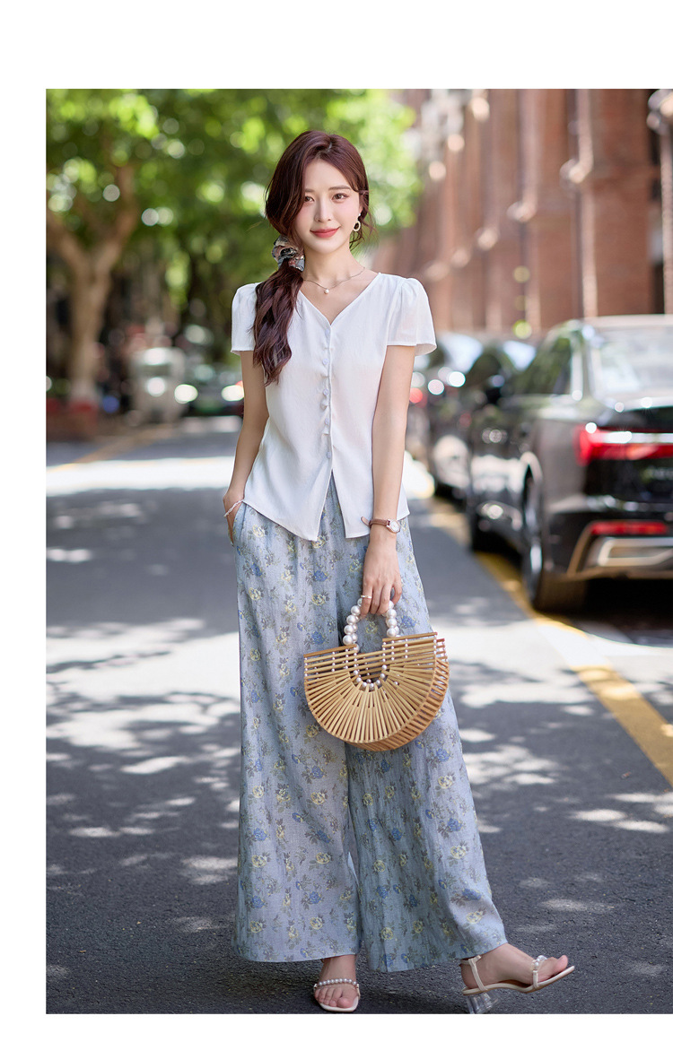 夏日绝美穿搭2025韩系气质抽褶短袖上衣温柔显瘦印花阔腿裤两件套 NSYY66136