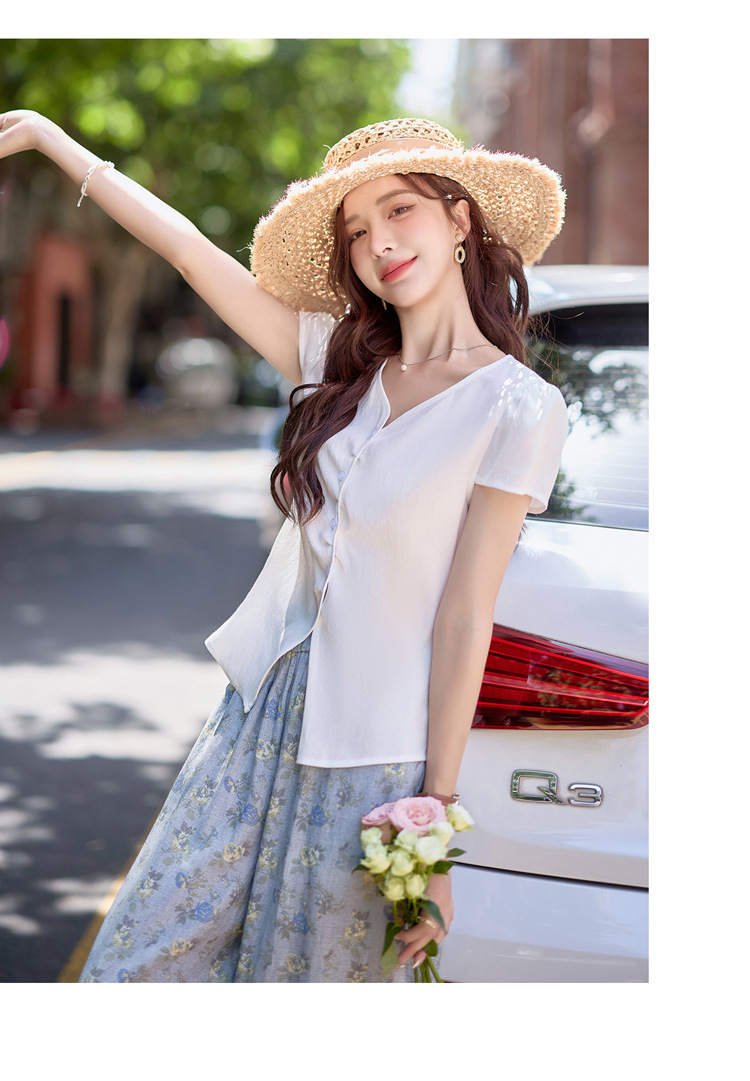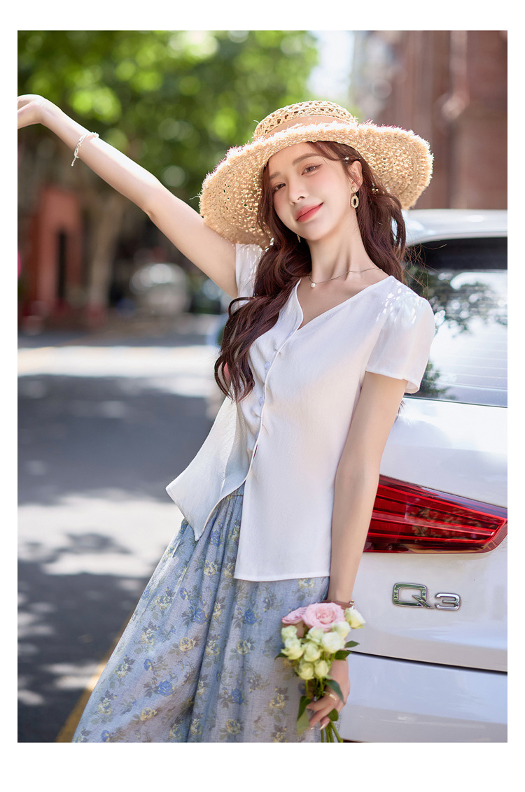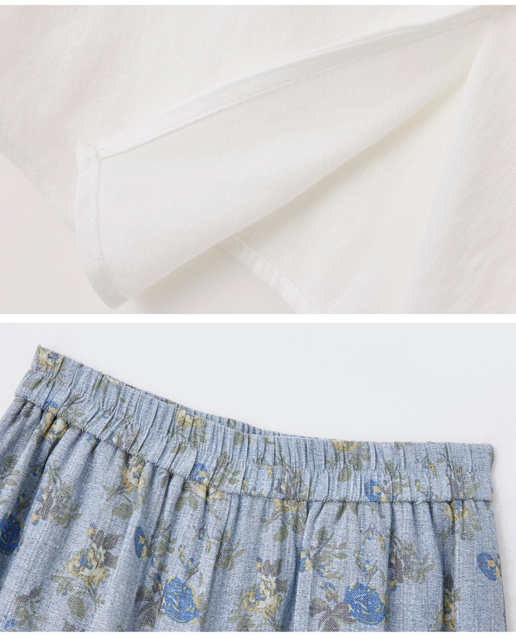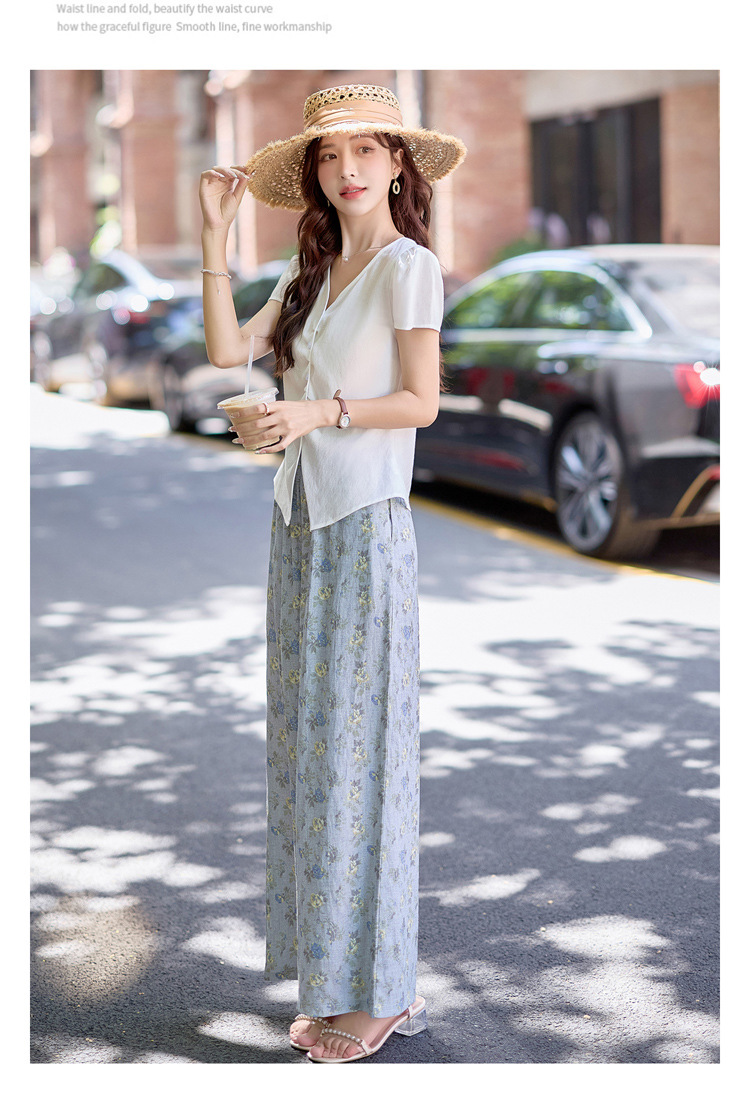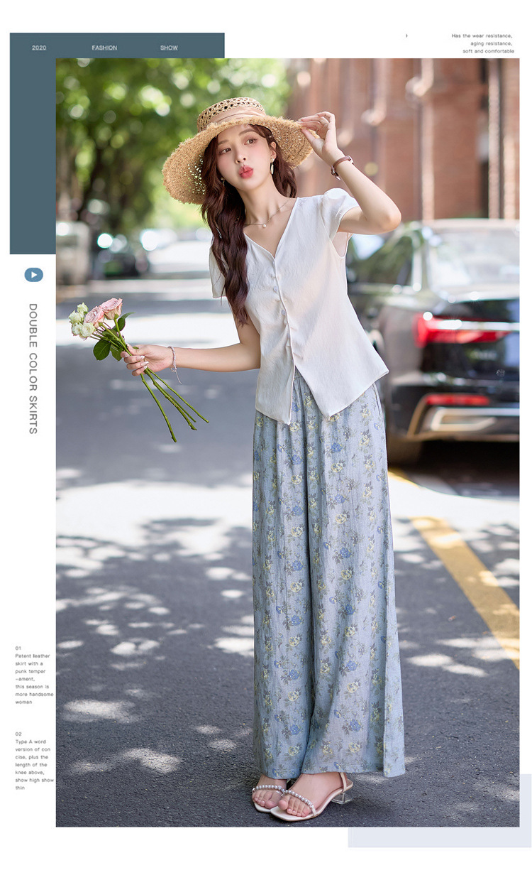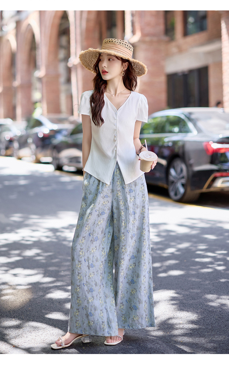 夏日绝美穿搭2025韩系气质抽褶短袖上衣温柔显瘦印花阔腿裤两件套 NSYY66136