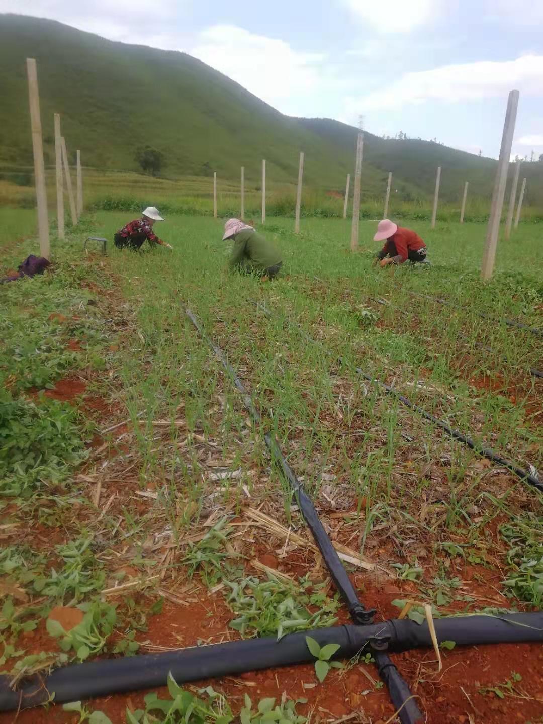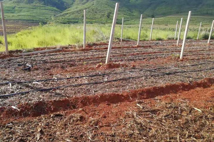种蒜土地做覆盖,这里原是一片薰衣草,现在立了水泥桩,是为了给刚种的好的百香果作爬藤的支撑。地块也是用喷带喷水灌溉。旁边(正上方)全是茅草地,是用于轮作的休耕地。