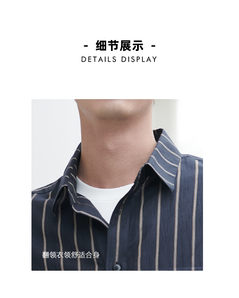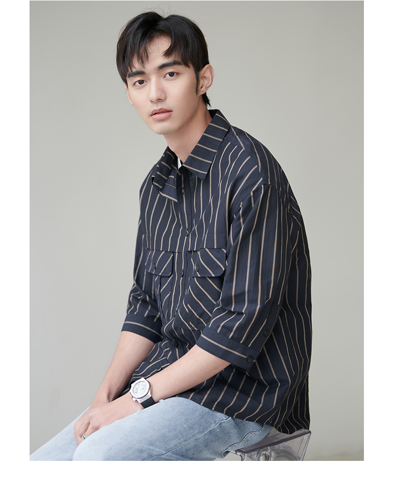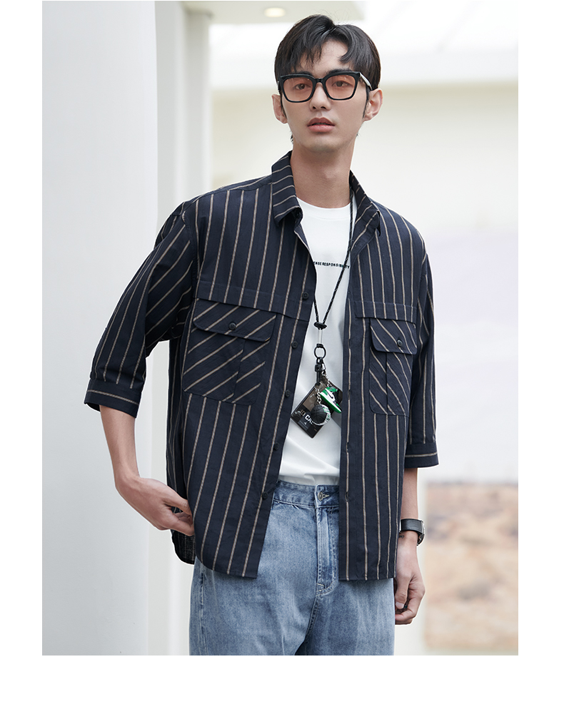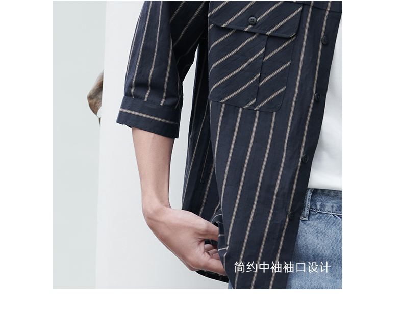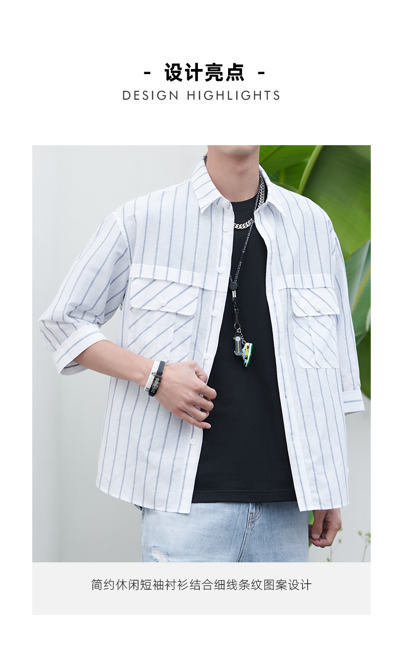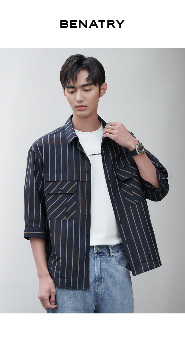 贝纳川衬衫男短袖夏季新款时尚条纹工装七分袖衬衣ECK221001402