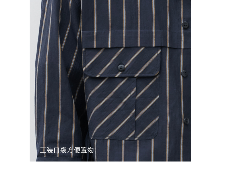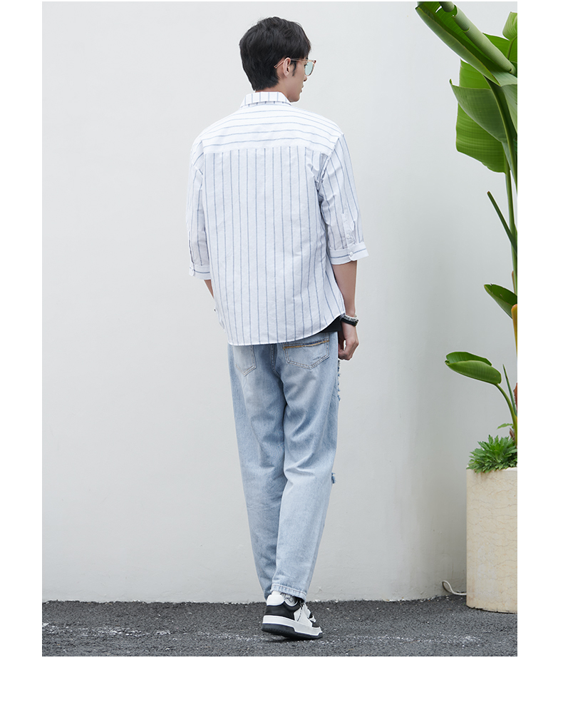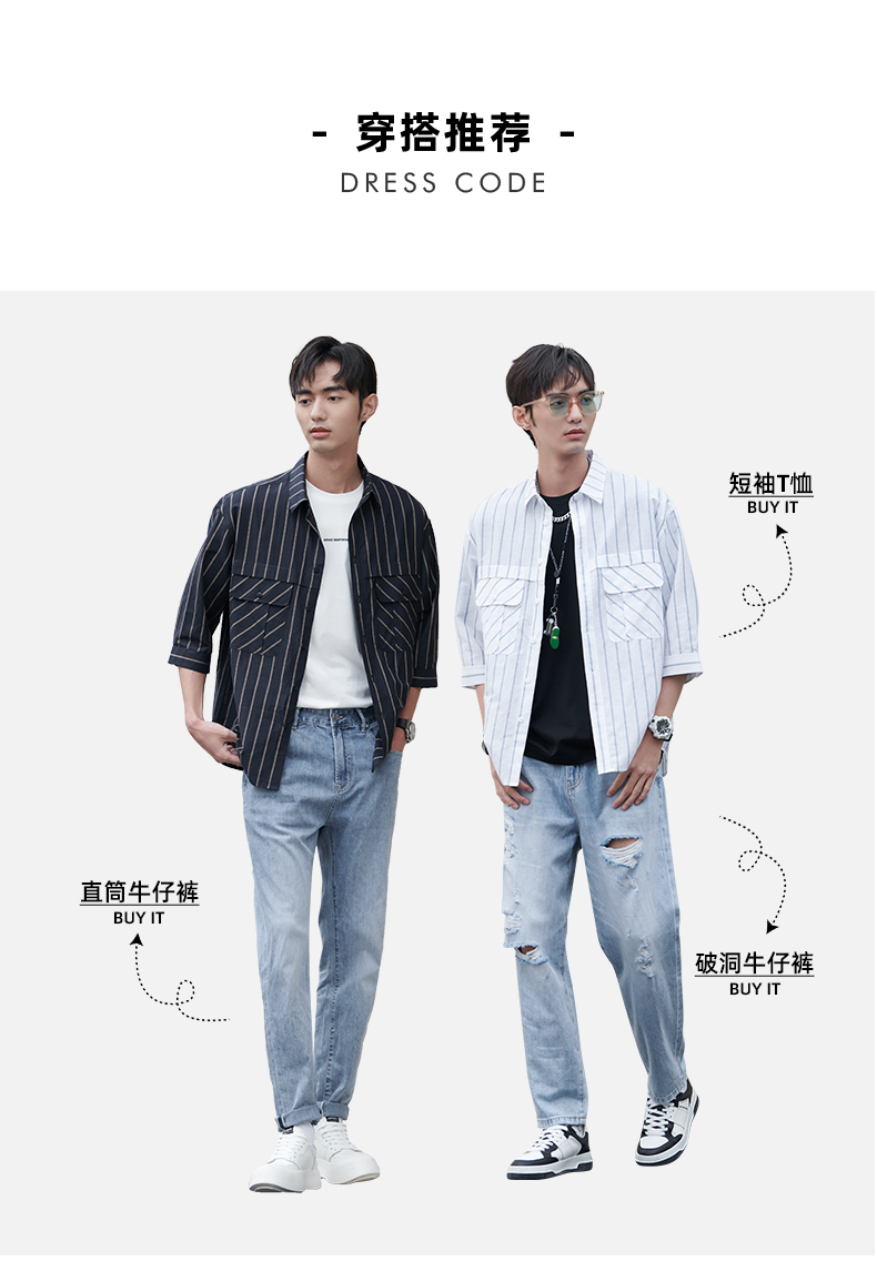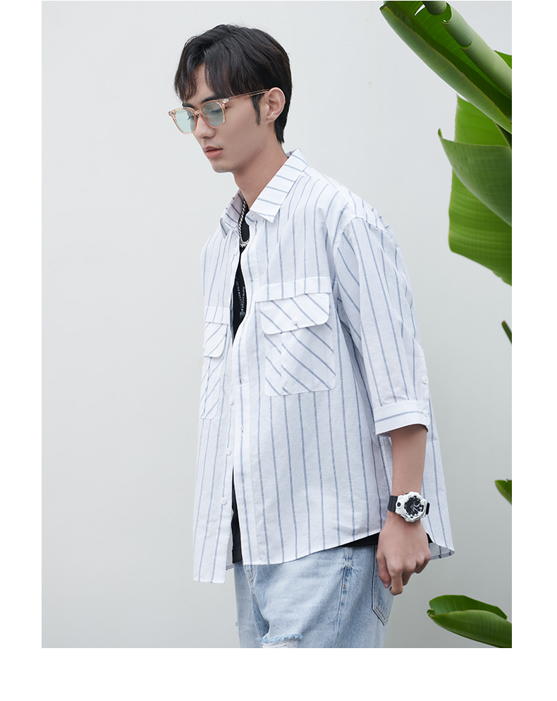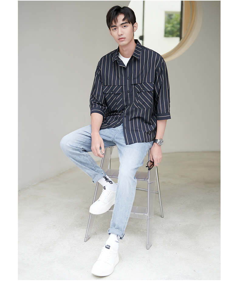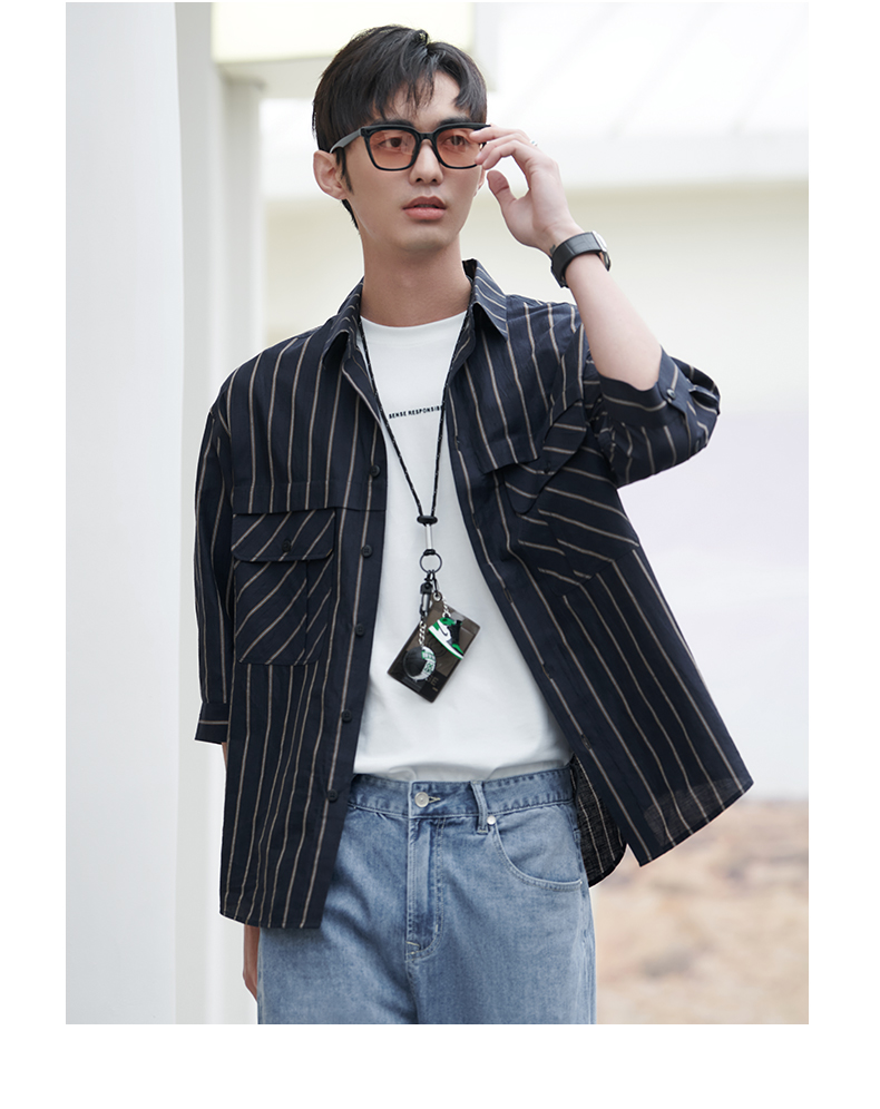 贝纳川衬衫男短袖夏季新款时尚条纹工装七分袖衬衣ECK221001402