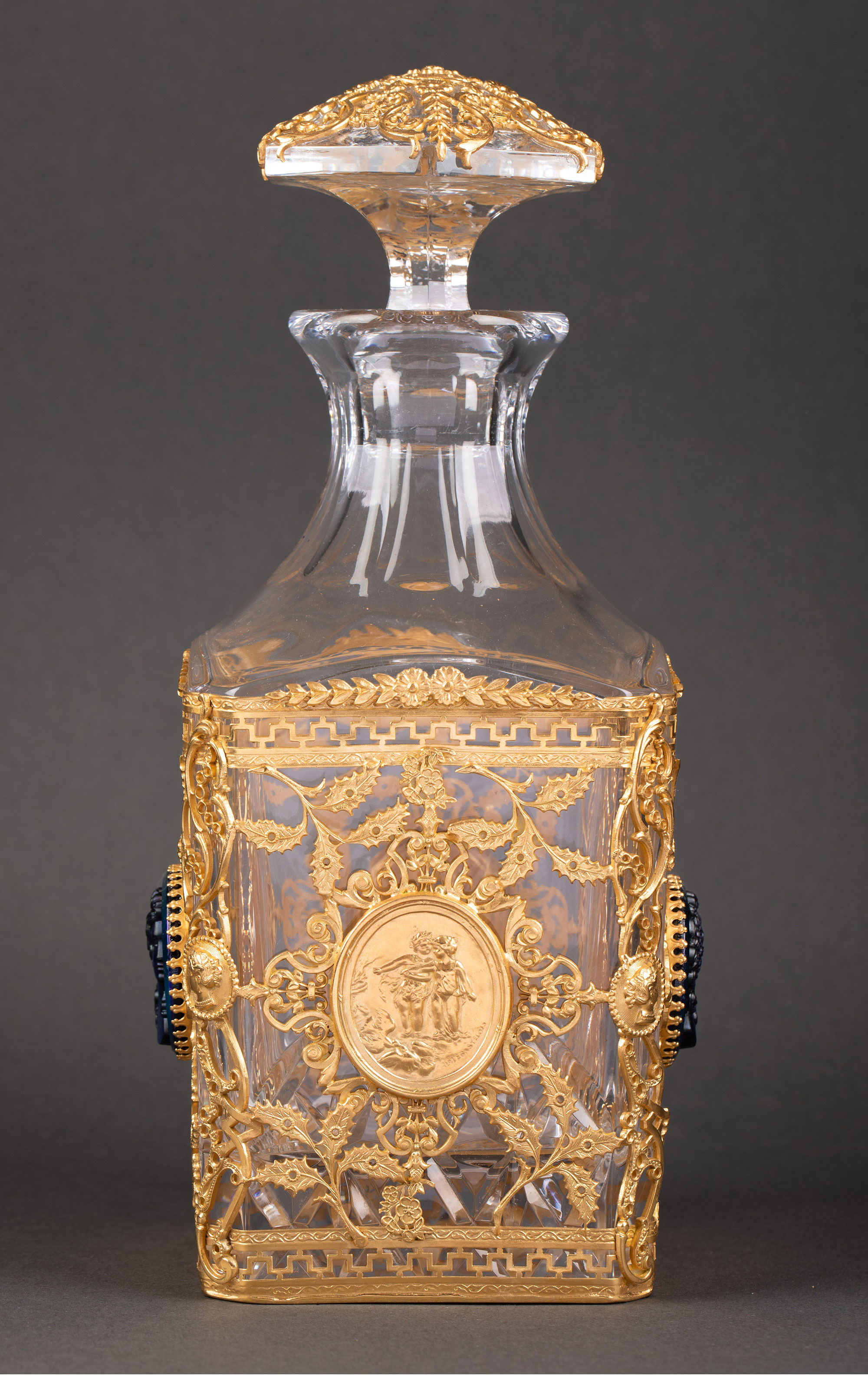 20世纪初法国出品新古典主义风格铜鎏金雕饰古典女子肖像卡梅奥装饰水晶烈酒瓶