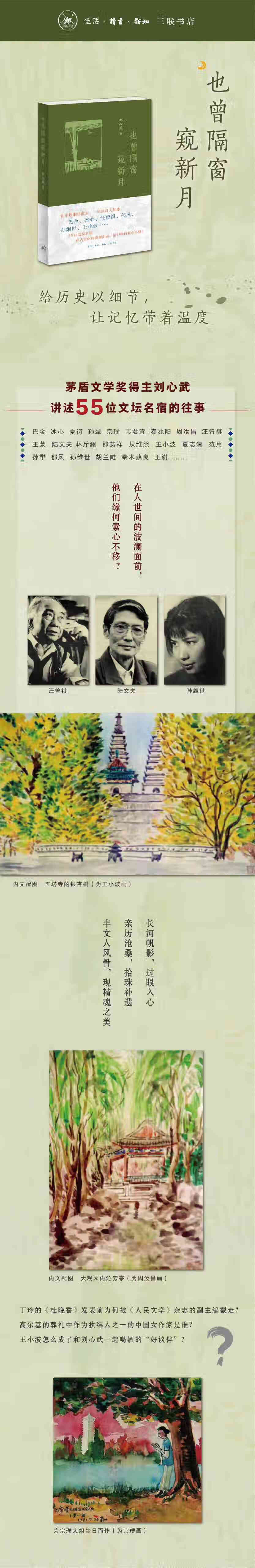刘心武以温情、通达的笔墨叙述巴金、冰心、汪曾祺、王小波、郁风、孙维世等55位文坛名宿如烟往事,回忆与他们的交往。刘心武说:“我愿把我所知道的中国几代作家的秘辛絮絮道出。也许,那些琐细的溪流里的琤琮音响,也能有助于理解我们共同置身其中的这个空间,以及它在人性深处引发的种种复杂效应。”